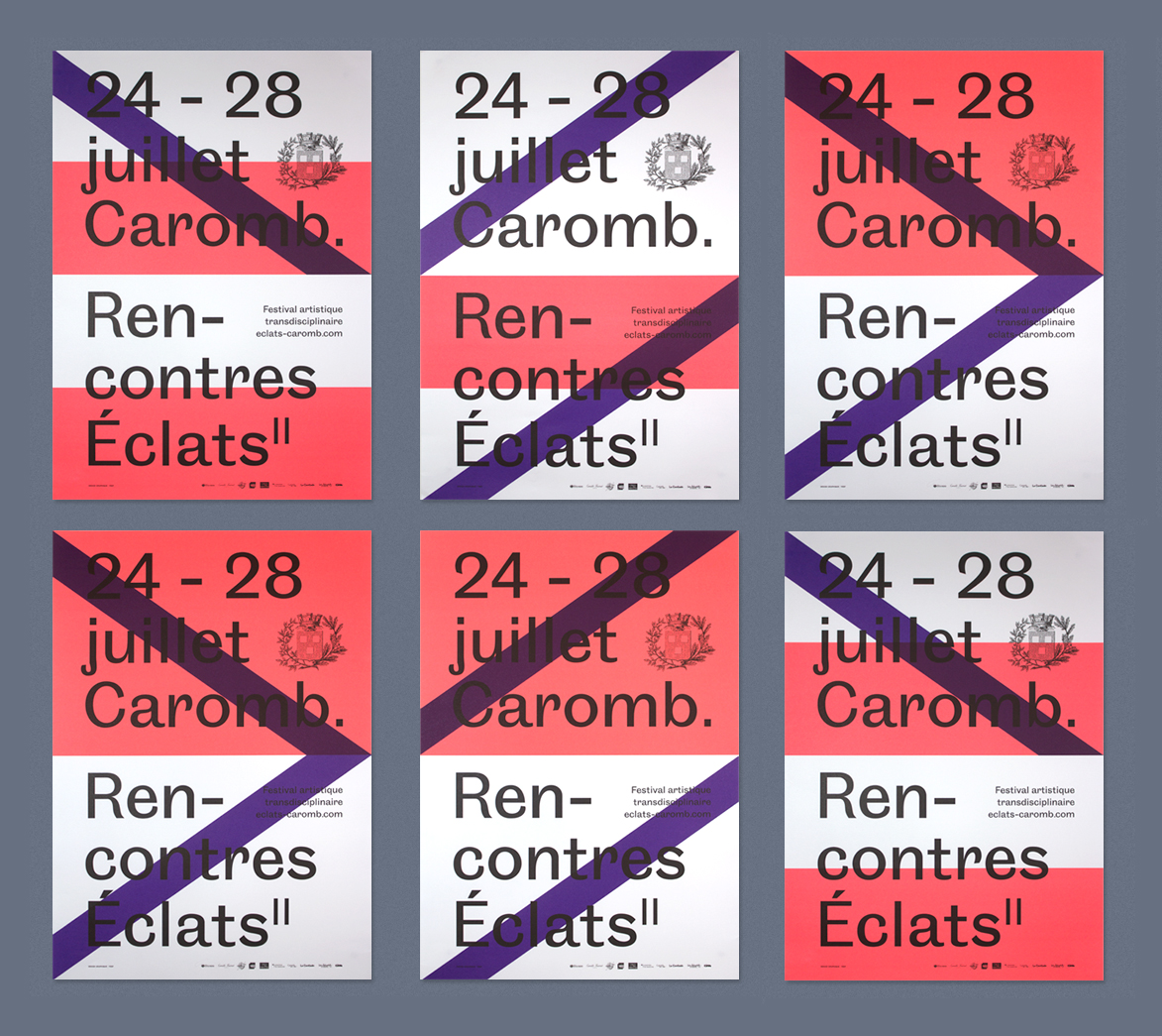 They created a graphic language based on A3 modules that can be assembled in various ways to fit the constraints of each poster format. The modules are made of orange rectangles and purple diagonal lines, that create random geometric compositions, on top of which the text is printed in Grotesque 6.