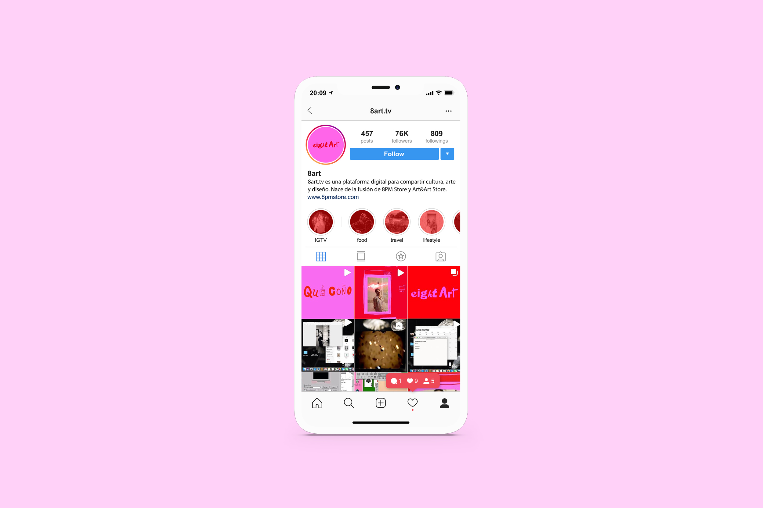 The eightArt online platform shares art, cuture and design through Instagram TV and YouTube. This project originated during the confinement for the Covid-19, with the aim to help artists and creators of all types, giving them a voice to share their art and thoughts and creating an international community.