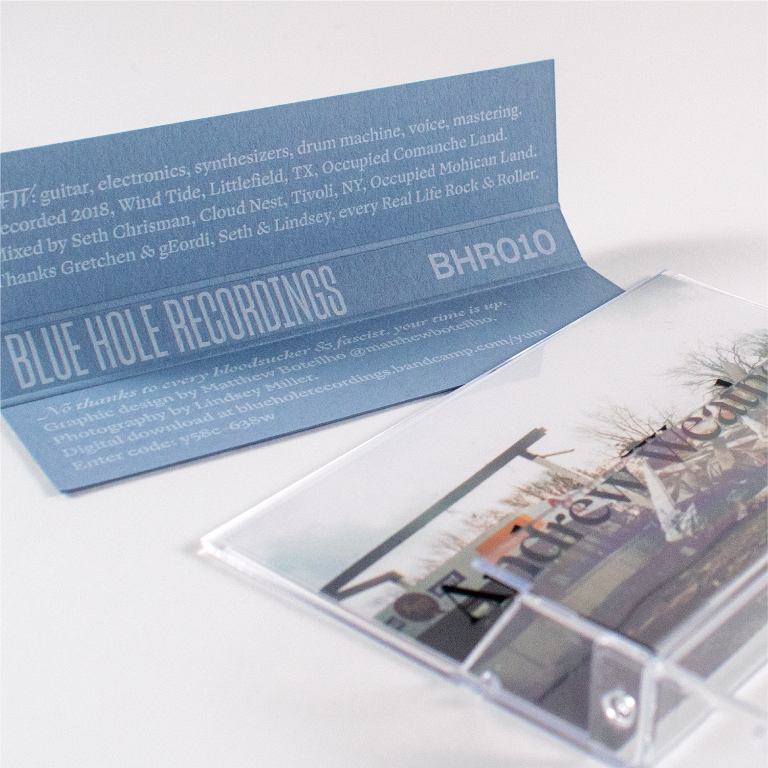 Blue Hole Recs’ packaging was developed by Matthew Boteilho and William Csorba after more than a decade of buying and listening to cassettes from the global DIY experimental community. The c-card inserts are an obi strip- and book spine-influenced (see: the early 70s paperback Foxfire series) element that uniformly relate across the whole discography by utilizing the same type treatment, print method, and paper lines.