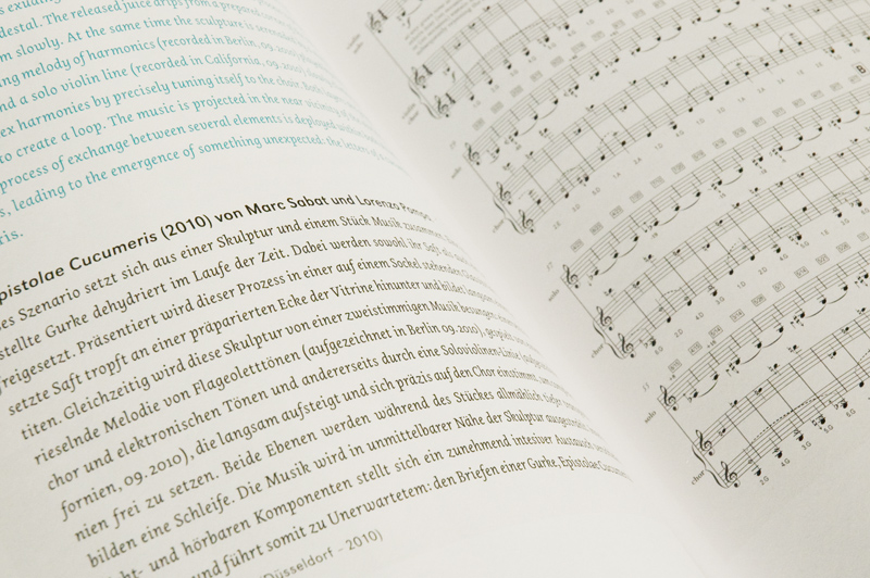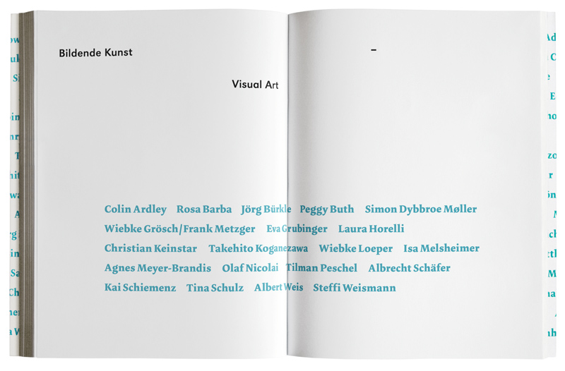 The catalogue is set in two languages: German (black) and English (turquoise). URW Grotesk is used for information about the artistis and their artworks, while Dolly is used for the names of the artists and literary texts.