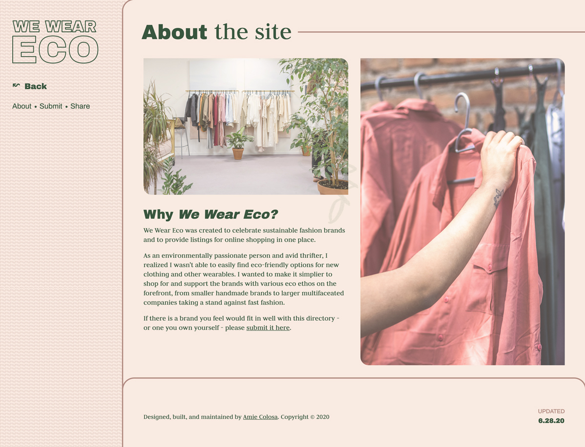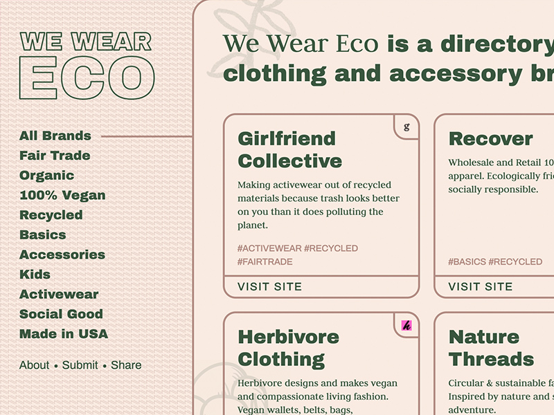 As an environmentally passionate person and avid thrifter, I realized I wasn’t able to easily find eco-friendly options for new clothing and other wearables. I wanted to make it simplier to shop for and support the brands with various eco ethos on the forefront, from smaller handmade brands to larger multifaceated companies taking a stand against fast fashion.