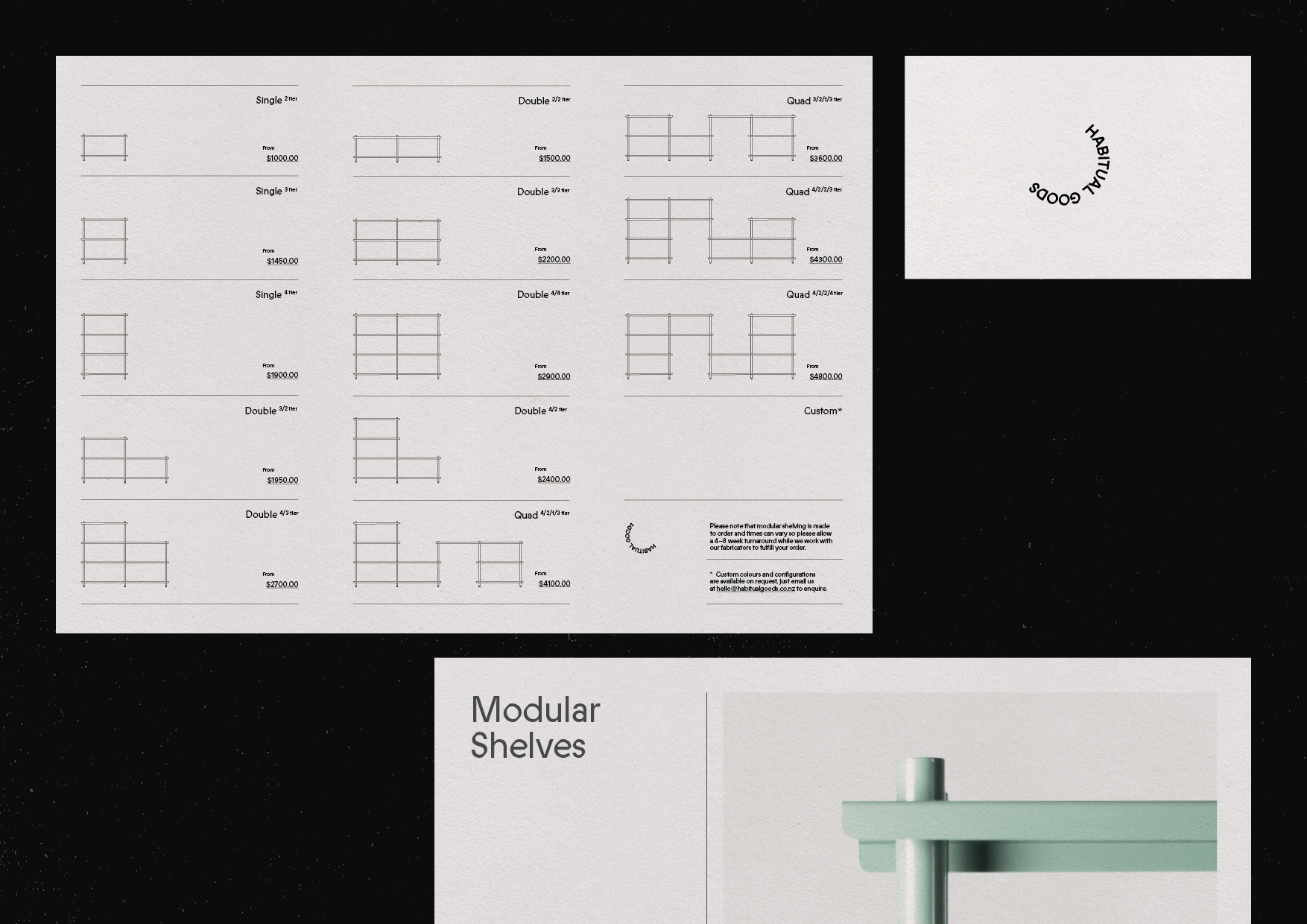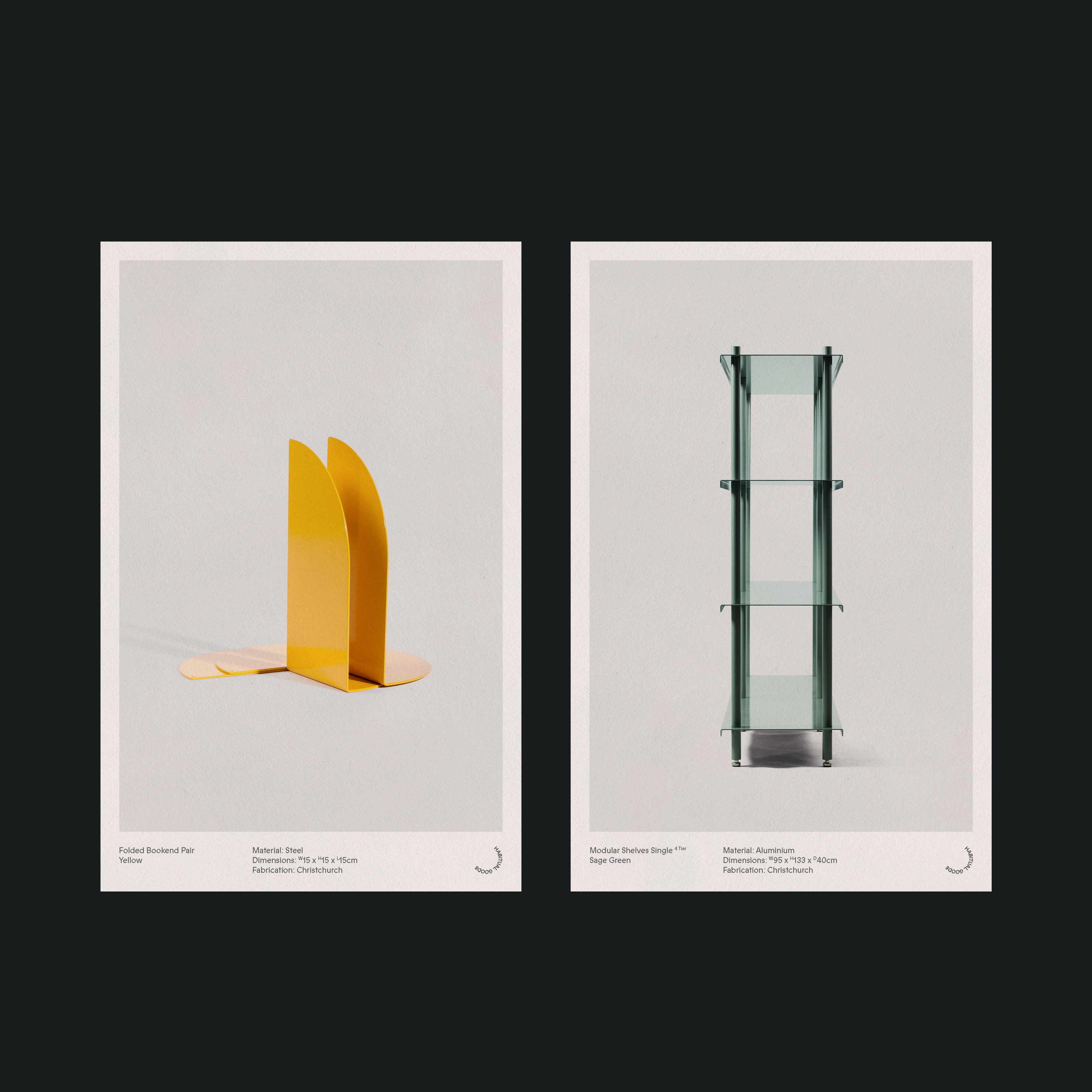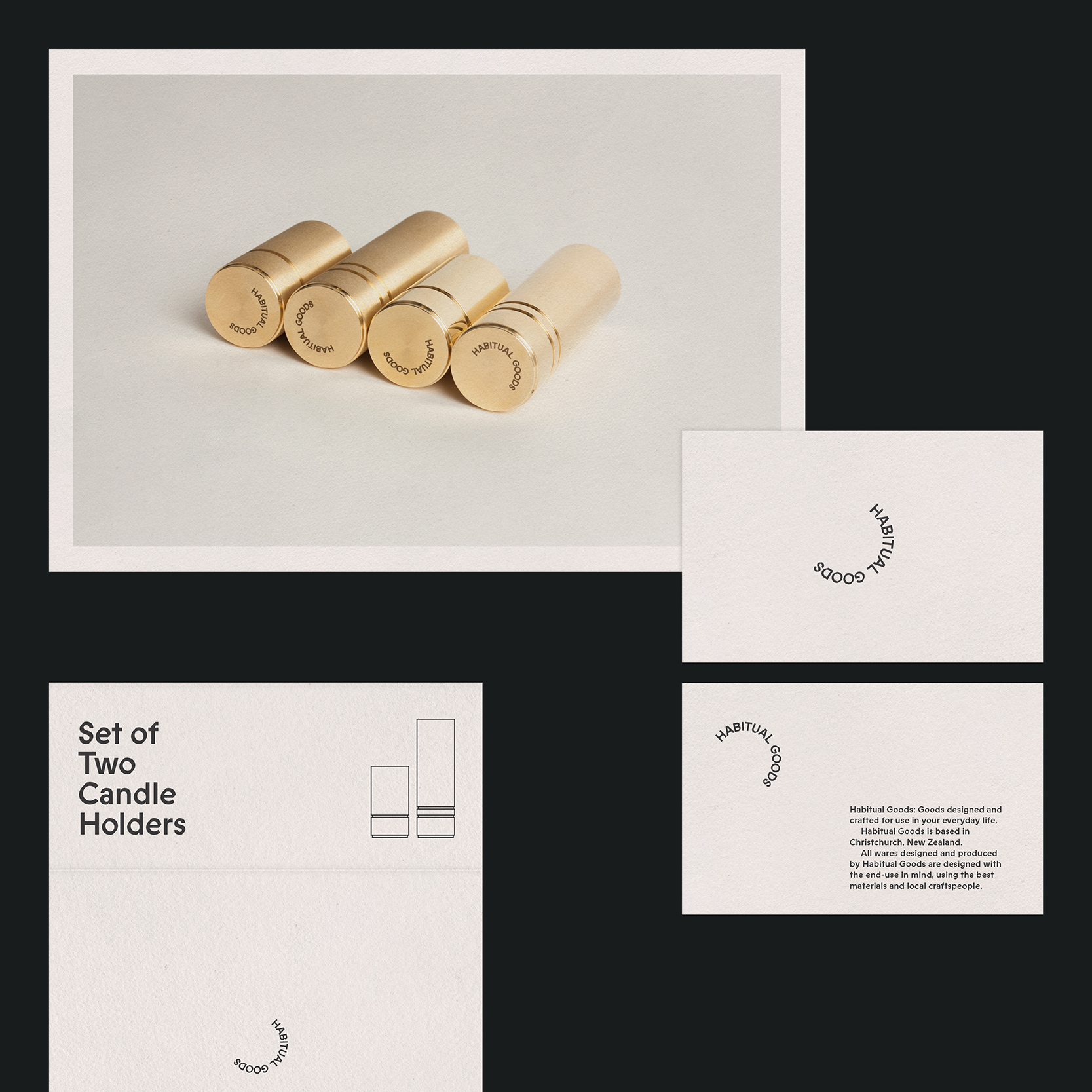 The design for Habitual Goods pays homage to mid-century danish furniture stamps while keeping the design minimal and also grounding it in New Zealand with the use of the angular font ABC Prophet (Dinamo), a design based on Joseph Churchward’s Churchward Georgina.