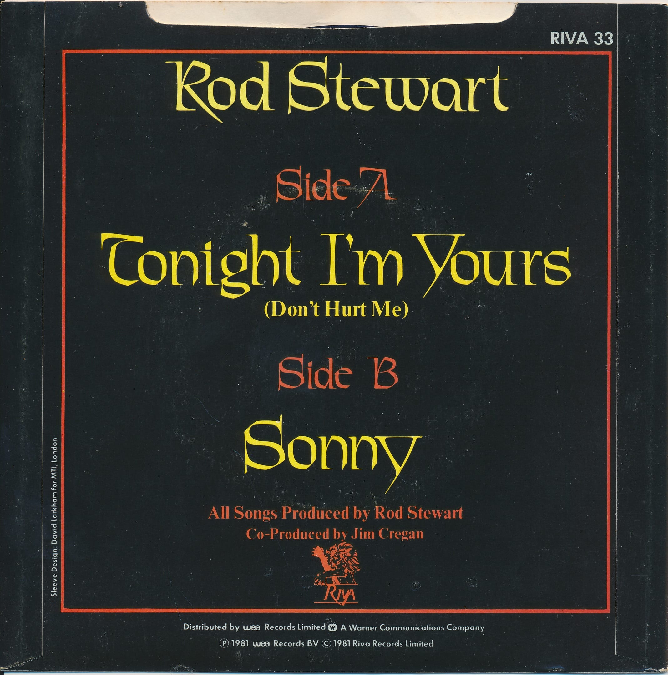 Chevalier is the typeface used for Tonight I’m Yours. Eleven years after his debut album, this was Rod Stewart’s thirteenth solo record. The album contained a hit single by the same name [Discogs], and was released on the Latin American market with translated song titles as Esta Noche Soy Tuyo. The cover was designed under art direction of Richard Seireeni. The single record credits David Larkham for the sleeve design. The portrait of Rod Stewart, looking into a setting sun with pursed lips, is by photographer Raul Vega.