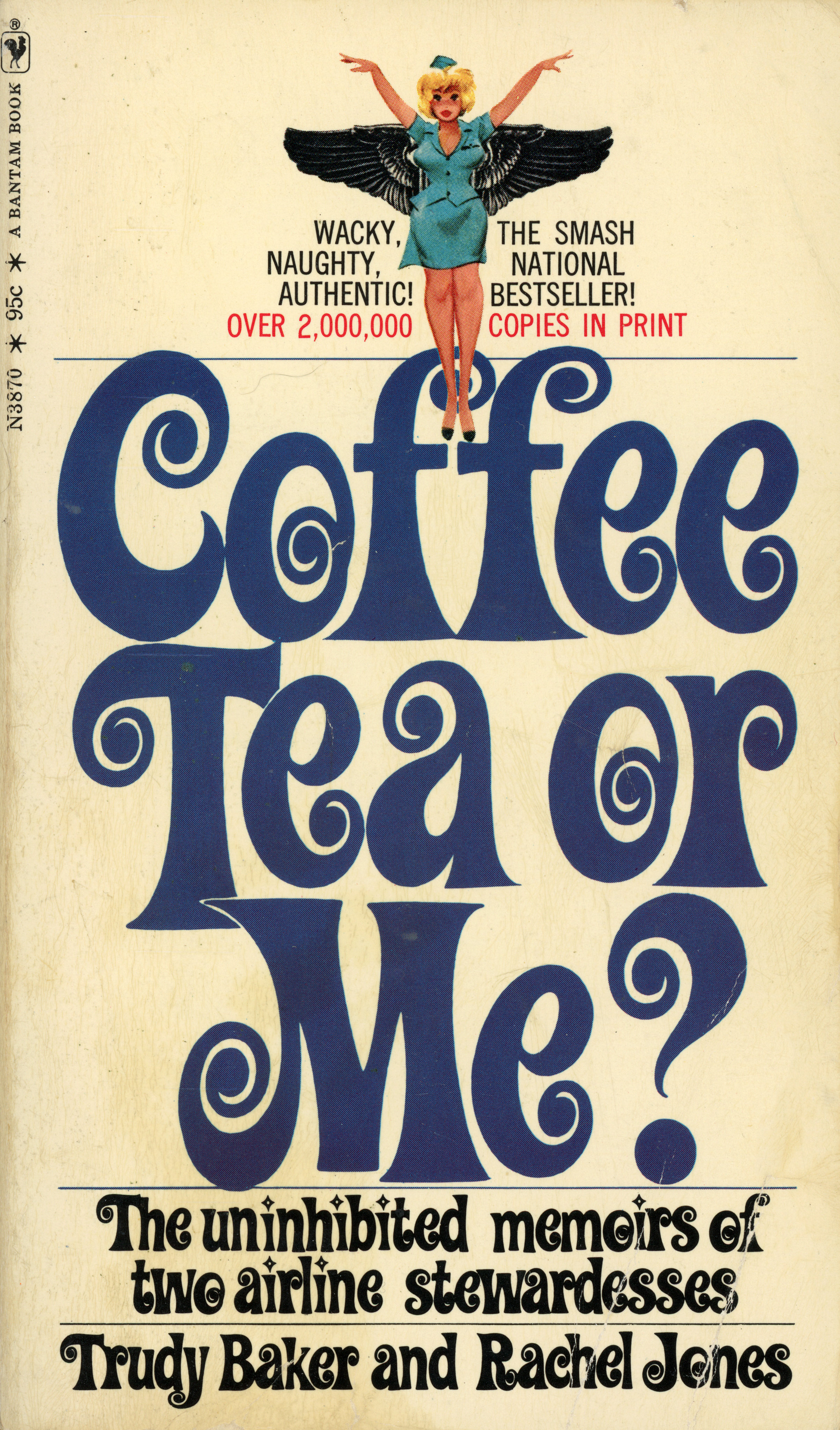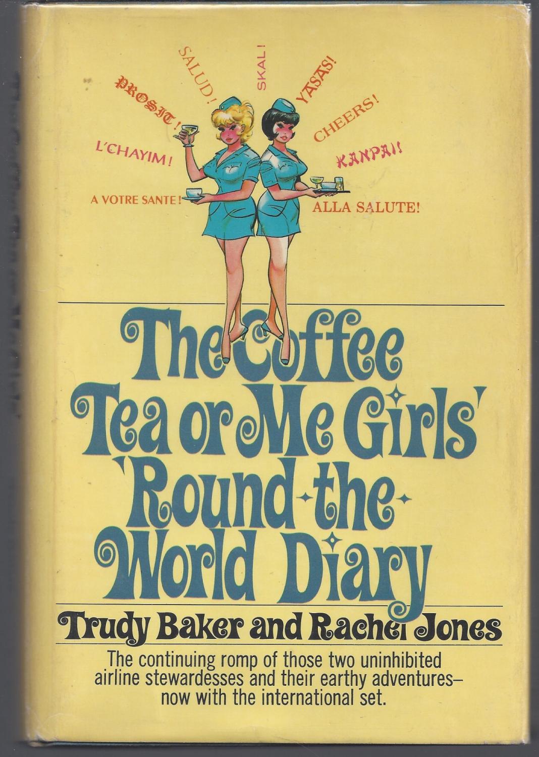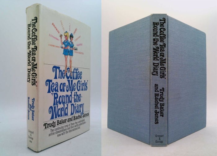 Coffee Tea or Me? was advertised as “the uninhibited memoirs of two airline stewardesses”, and credited to Trudy Baker and Rachel Jones. In fact, it was ghost-written by Donald Bain. The 1967 hardcover dust jacket features Caruso Roxy, set in all caps. The same typeface was also used for the paperback cover, now bigger and in mixed case, as well as for the three sequels published until 1975. In 1973, the book was made into a film.