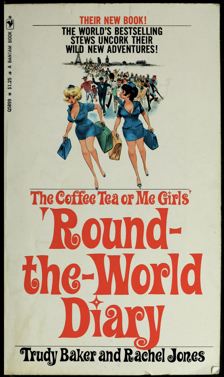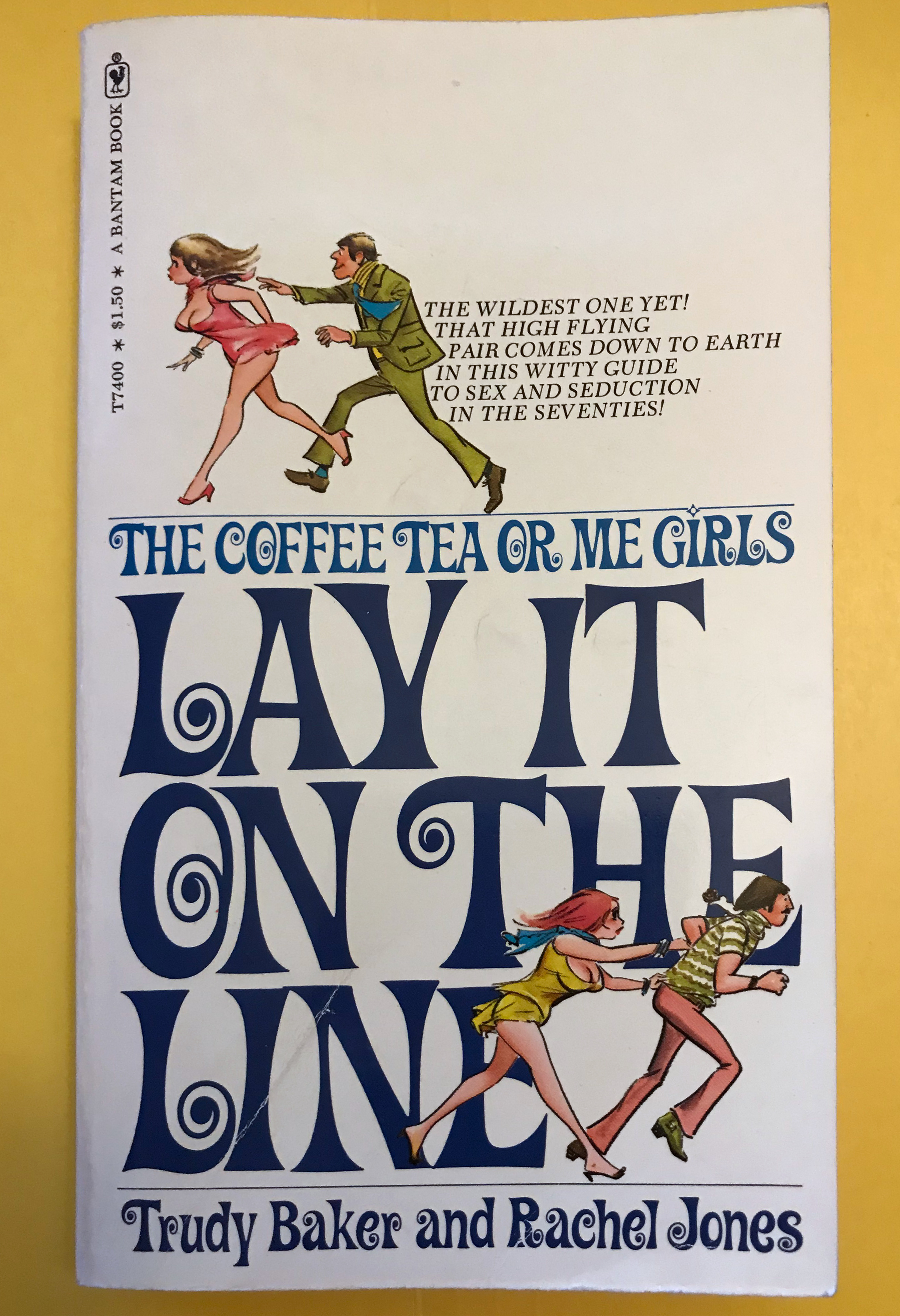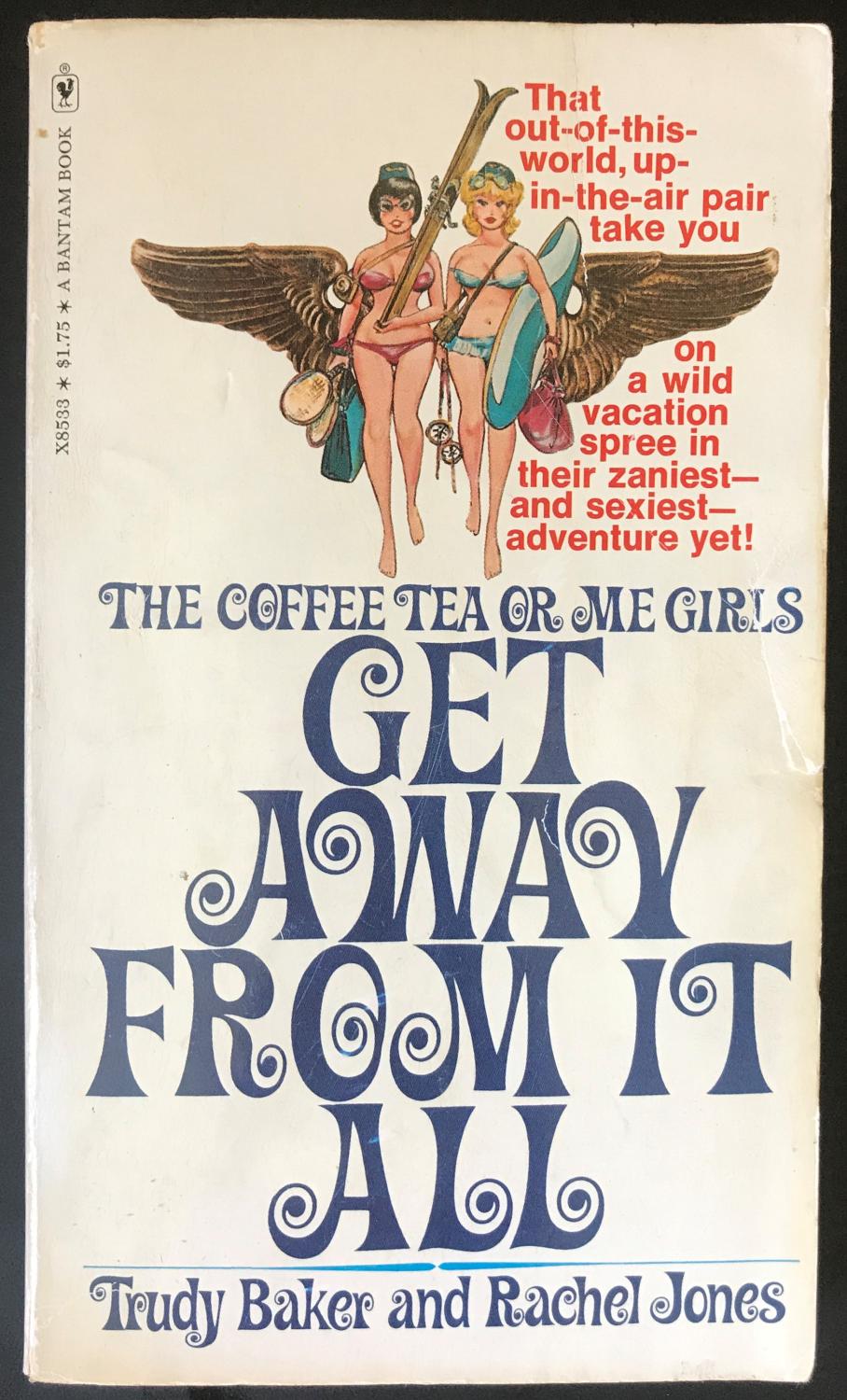 Coffee Tea or Me? was advertised as “the uninhibited memoirs of two airline stewardesses”, and credited to Trudy Baker and Rachel Jones. In fact, it was ghost-written by Donald Bain. The 1967 hardcover dust jacket features Caruso Roxy, set in all caps. The same typeface was also used for the paperback cover, now bigger and in mixed case, as well as for the three sequels published until 1975. In 1973, the book was made into a film.