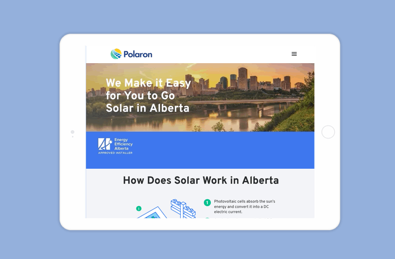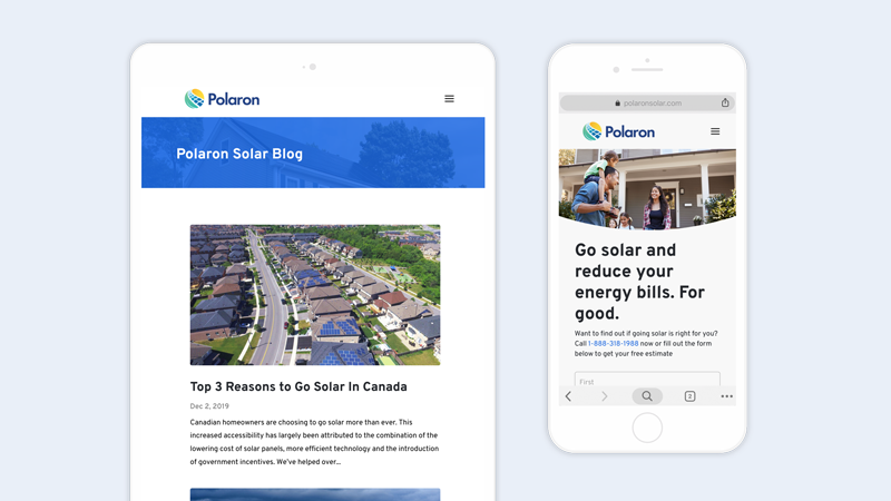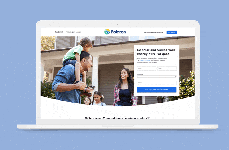 Polaron Solar eliminates the traditional cost barriers of choosing solar, making it more affordable for Canadians—and helping secure a greener future for the next generation. Polaron is one of the largest residential solar companies in Canada—with over 3,500 installs across the nation. But in a similar fashion to other successful businesses, they had outgrown their brand and needed a website redesign to facilitate future growth.