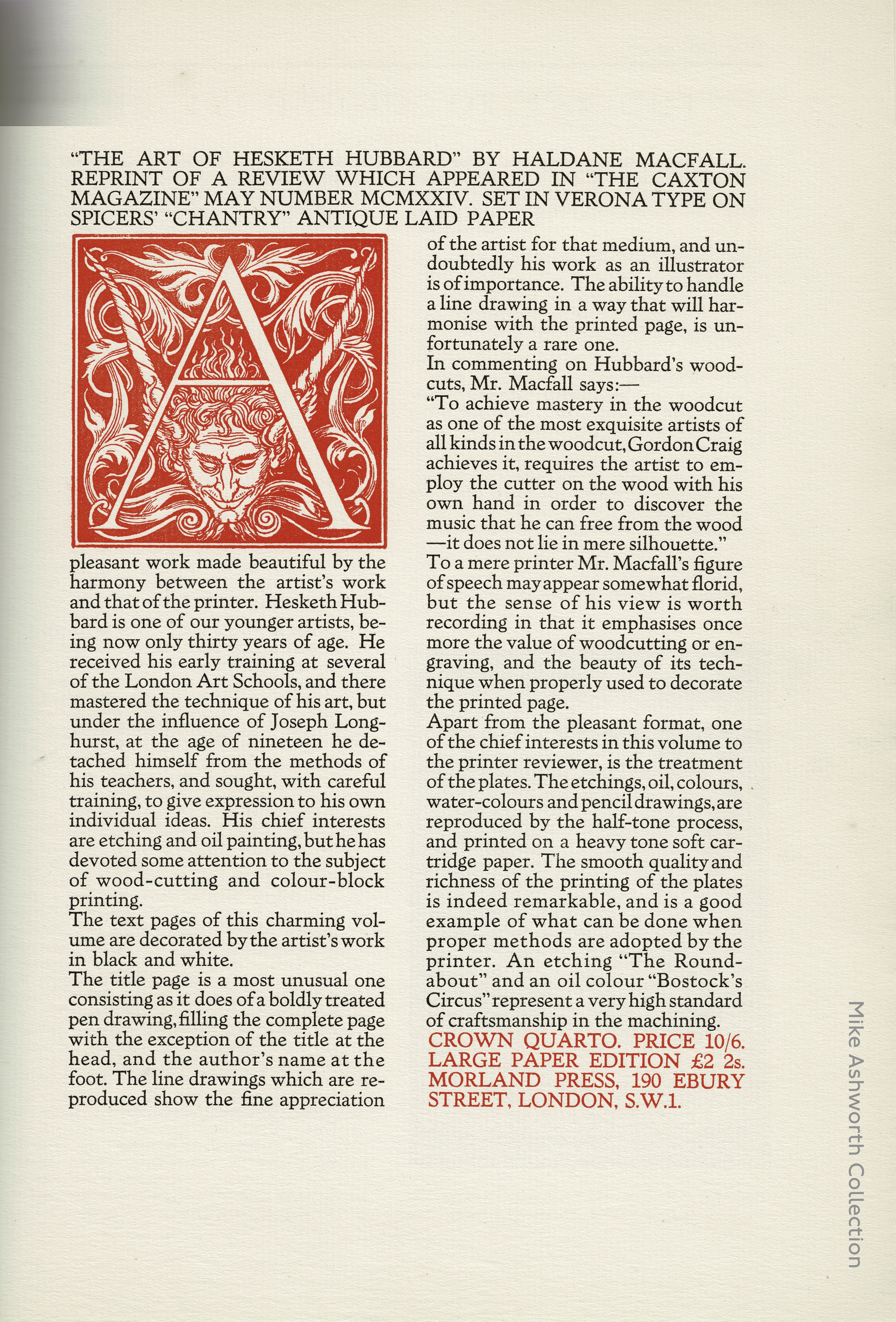 A review of the book on Hesketh Hubbard by Haldane Macfall that appeared in the Caxton Magazine and that the publisher had reset as an insert sheet tipped into a trade journal for 1924. It is set in Verona type and is printed on decent paper made by Spicers. Eric Hesketh Hubbard (1892–1957) was a prolific artist in his day. The paper is dominated by the large historiated initial A. Issued by the Morland Press, London, 1924.