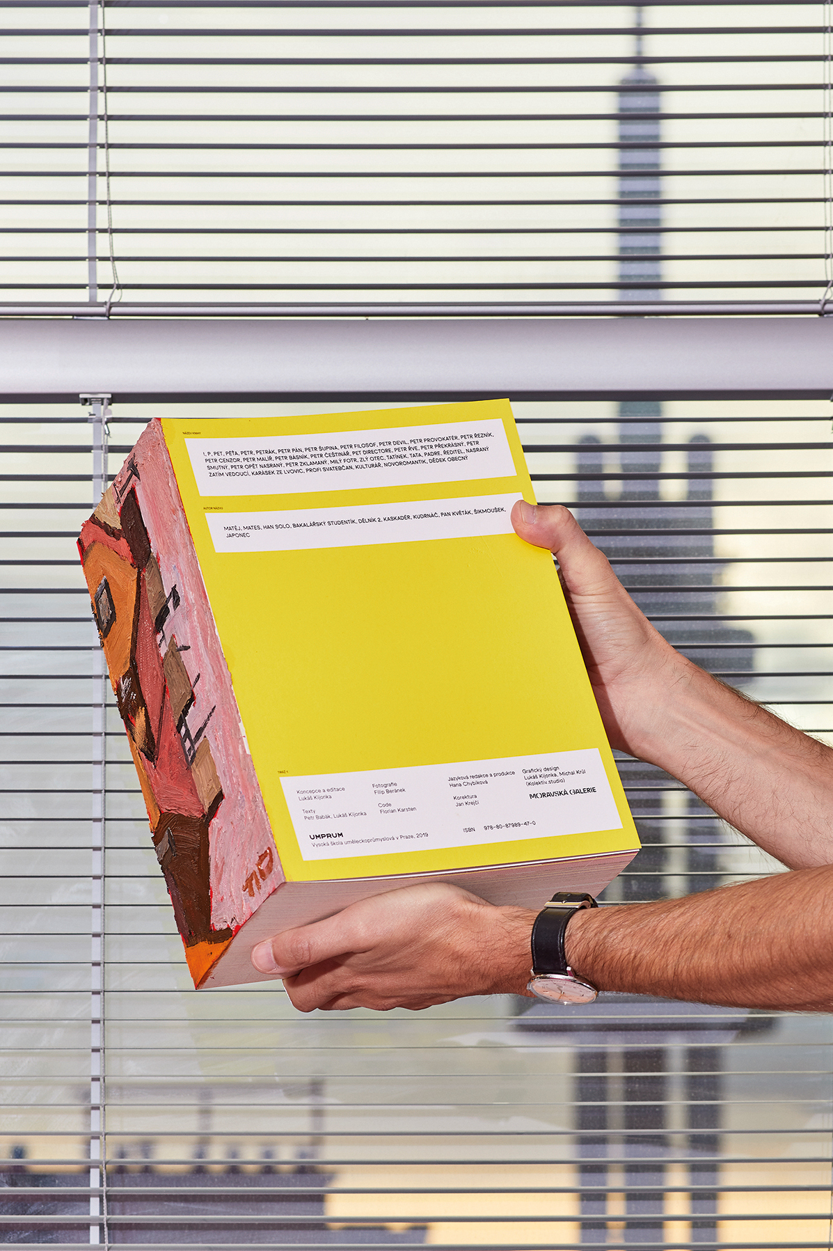 A generous dimension of this author’s book, whose concept and graphic design was made by Lukáš Kijonka, operates as a comment to the current direction of frequently overlarge book design and it relates to Babák’s examination of the book as an object. Babák’s texts are supplemented by photographs of Filip Beránek. 15 centimeters wide spines of the book were made manually by most significant current Czech artists, Babák’s colleagues and friends. Would you like to own an original made by Krištof Kintera, Tomáš Vaněk, CAP crew, Dominik Forman, Petra Dočekalová, Jakub Hojgr, or Petr Kvíčala?