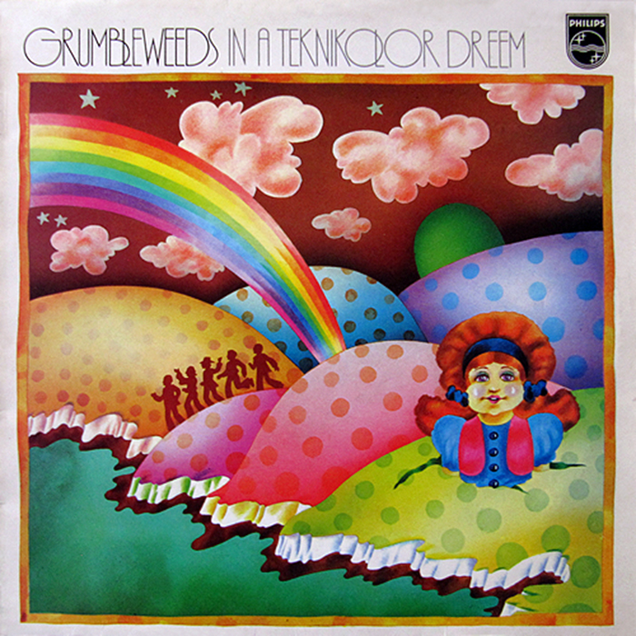 Released in 1972, this psychedelic LP is the debut album of popular British cabaret band The Grumbleweeds. The font in use is Syncopation Light aka Design Fineline. It’s here used in tightly spaced caps with some overlapping letters. The typeface was designed in 1970 by Acey Cypres for Headliners, see also this previous post.