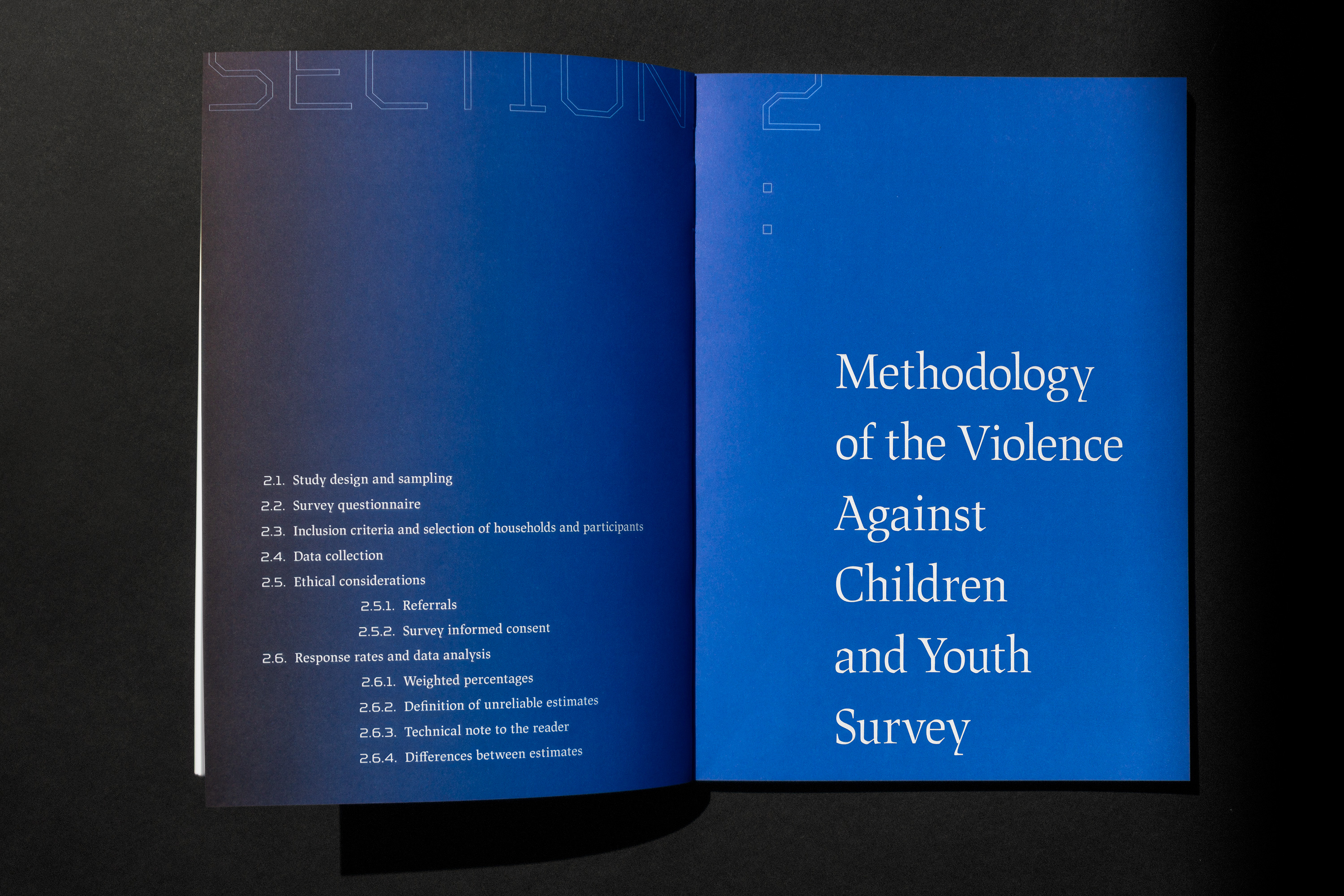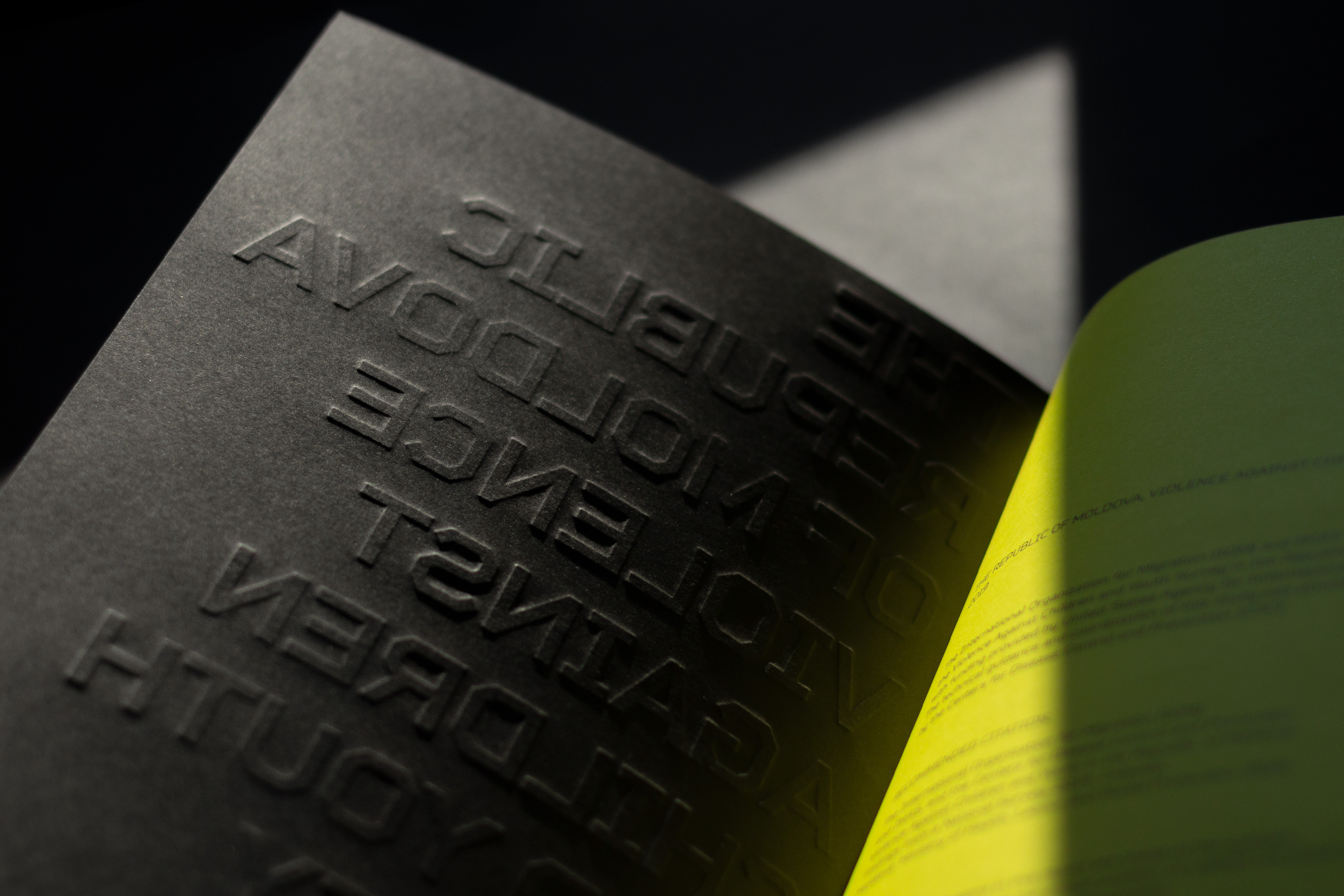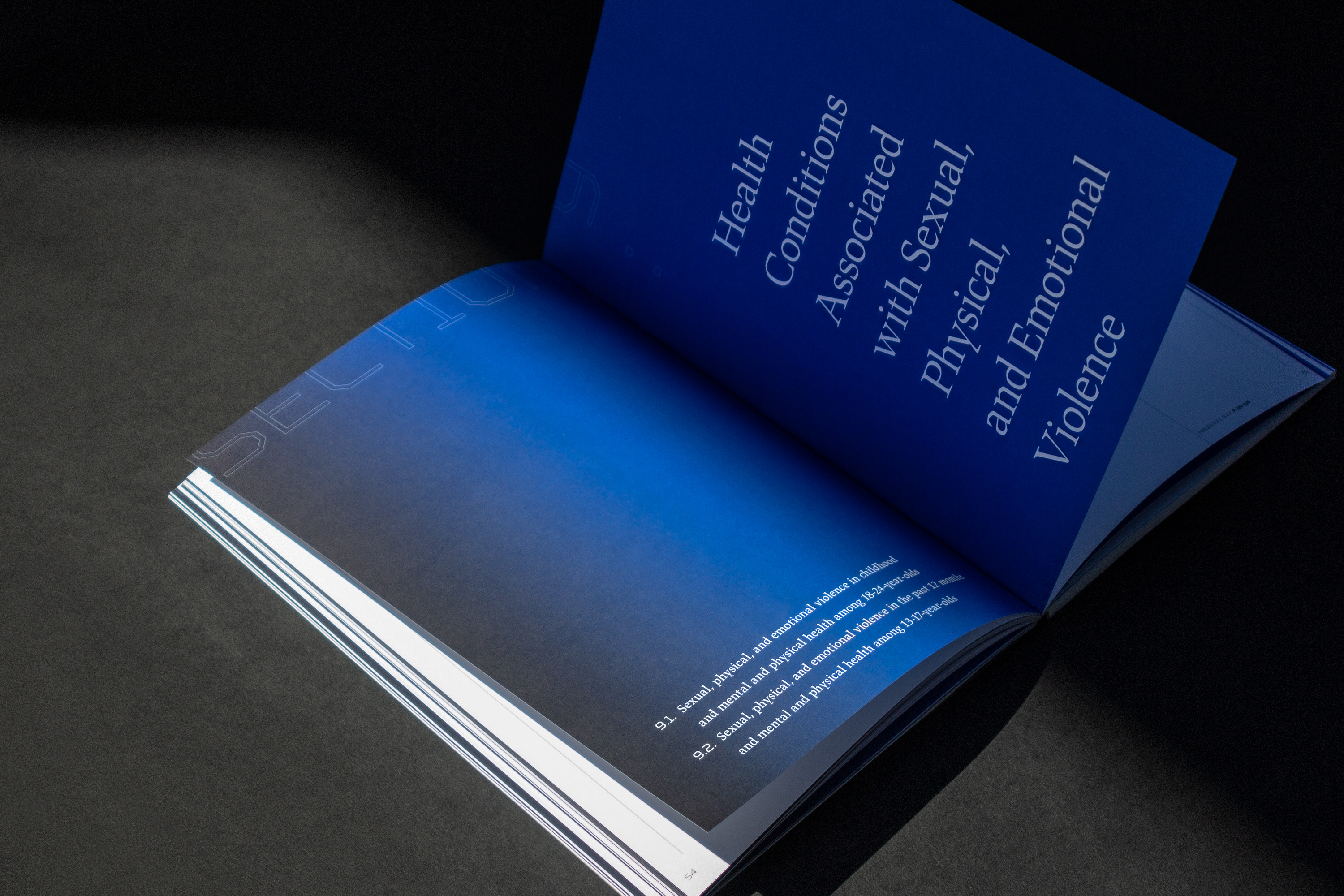 The visual concept operates through cover, typography and colors, all in a deliberately bold yet unobtrusive way to hint the complexity of the content. The blind stamp is not easy to read, it has an exposed physicality and it’s all over the place, just as violence is. The Rigid Square, TT Squares and JAF Lapture typeface families are juxtaposed just as humans confront the data they collect. On the one hand there are cold and technical features, on the other there is a robustness with a calligraphic touch. Key words are placed on margins, filling the widths, cut, partly seen, displaced and highlighted.The gradients stand for various degrees violence can be inflicted on individuals.