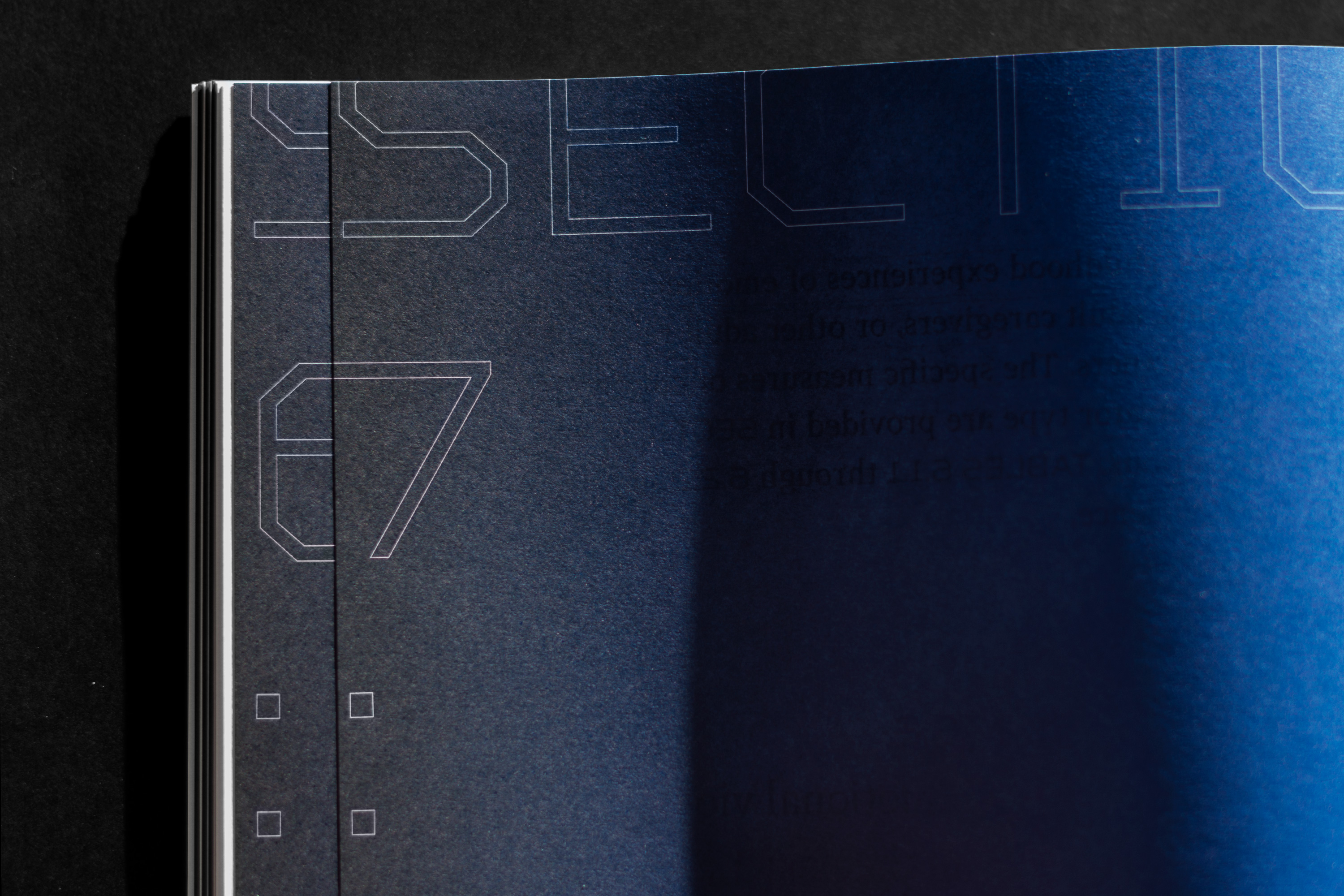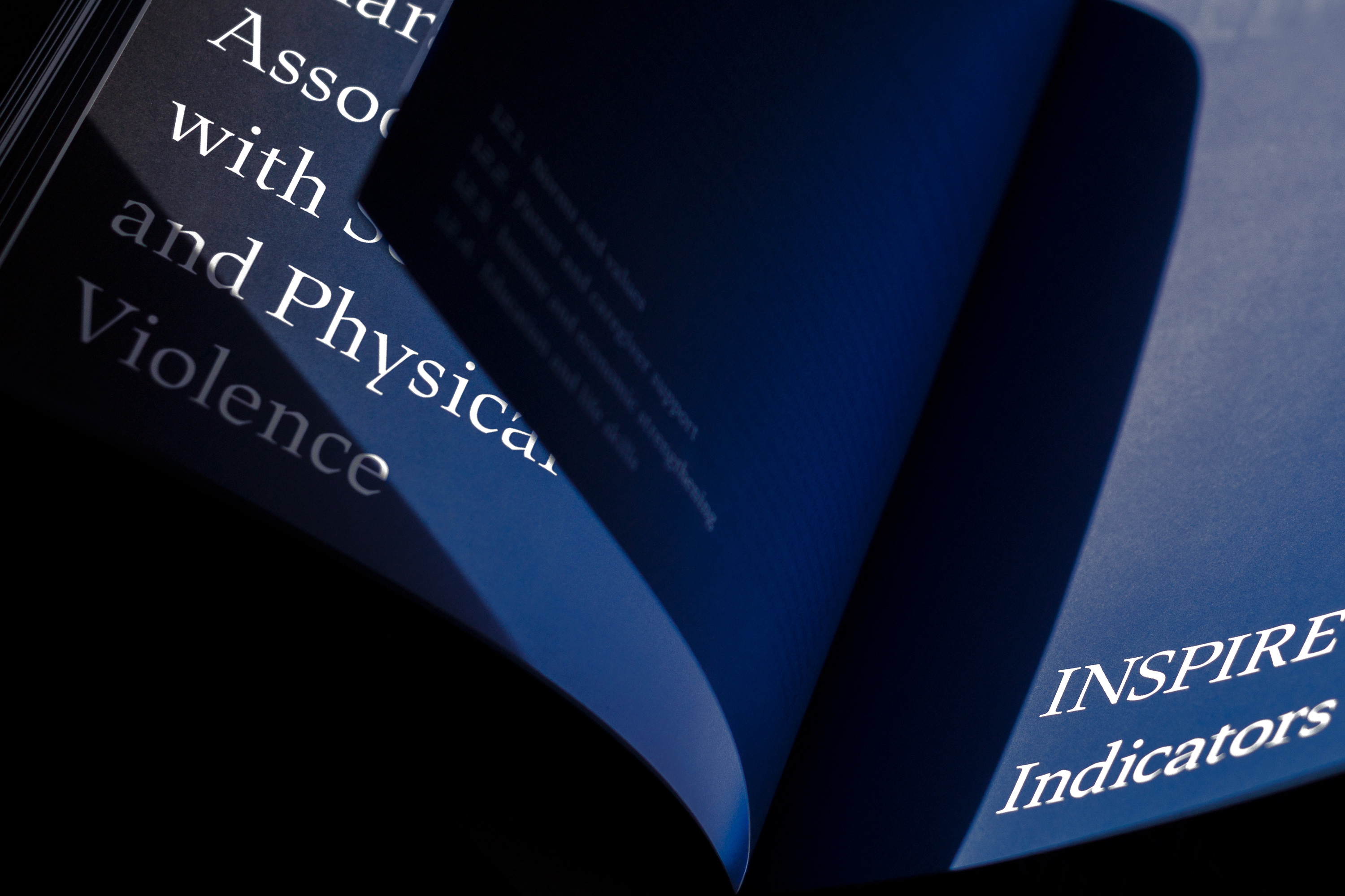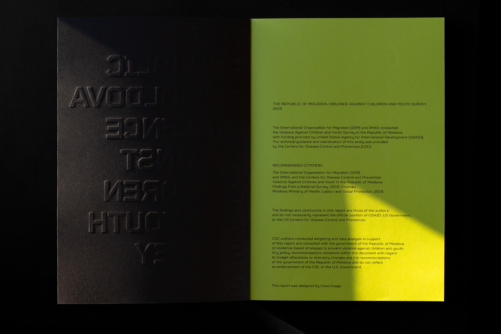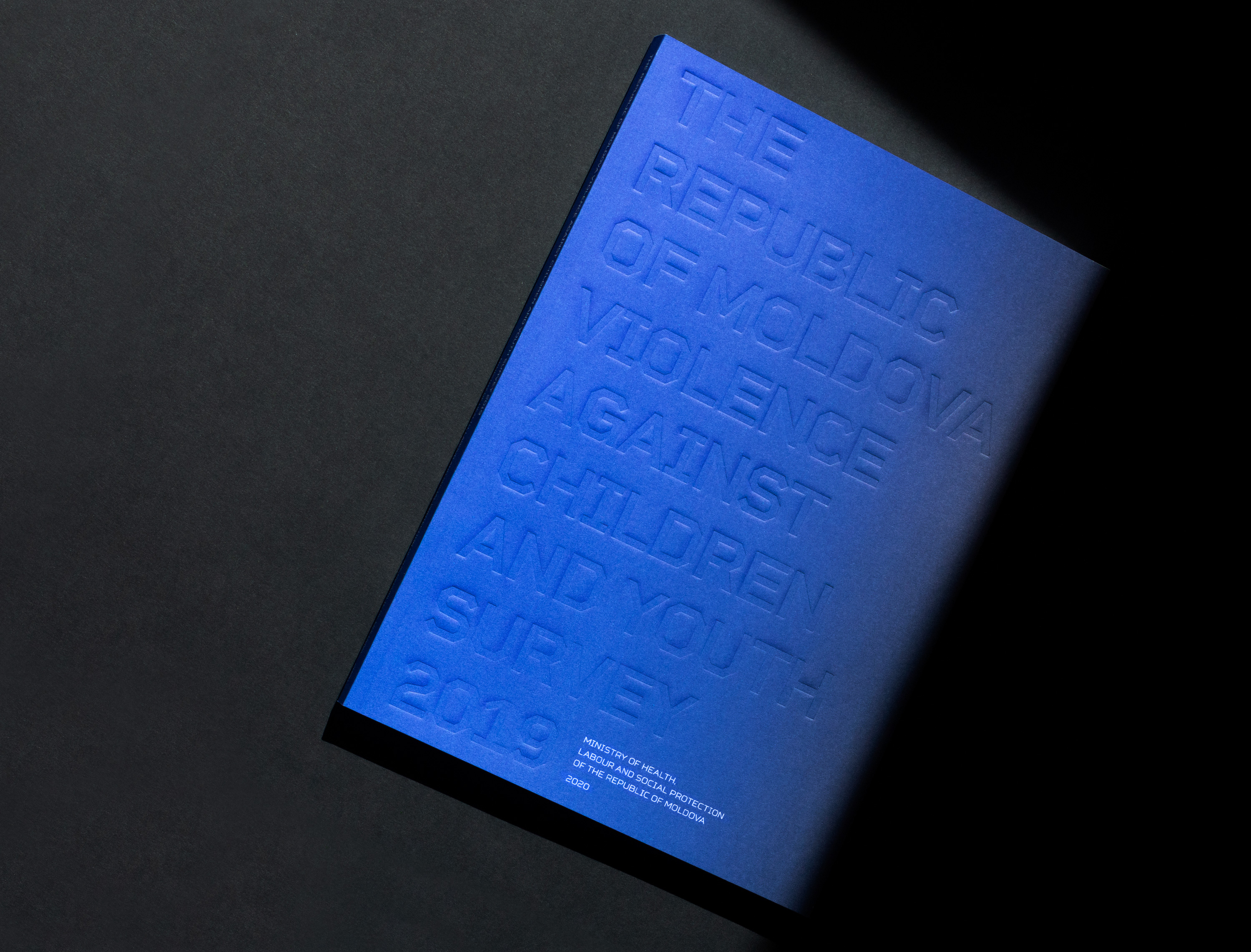 The visual concept operates through cover, typography and colors, all in a deliberately bold yet unobtrusive way to hint the complexity of the content. The blind stamp is not easy to read, it has an exposed physicality and it’s all over the place, just as violence is. The Rigid Square, TT Squares and JAF Lapture typeface families are juxtaposed just as humans confront the data they collect. On the one hand there are cold and technical features, on the other there is a robustness with a calligraphic touch. Key words are placed on margins, filling the widths, cut, partly seen, displaced and highlighted.The gradients stand for various degrees violence can be inflicted on individuals.