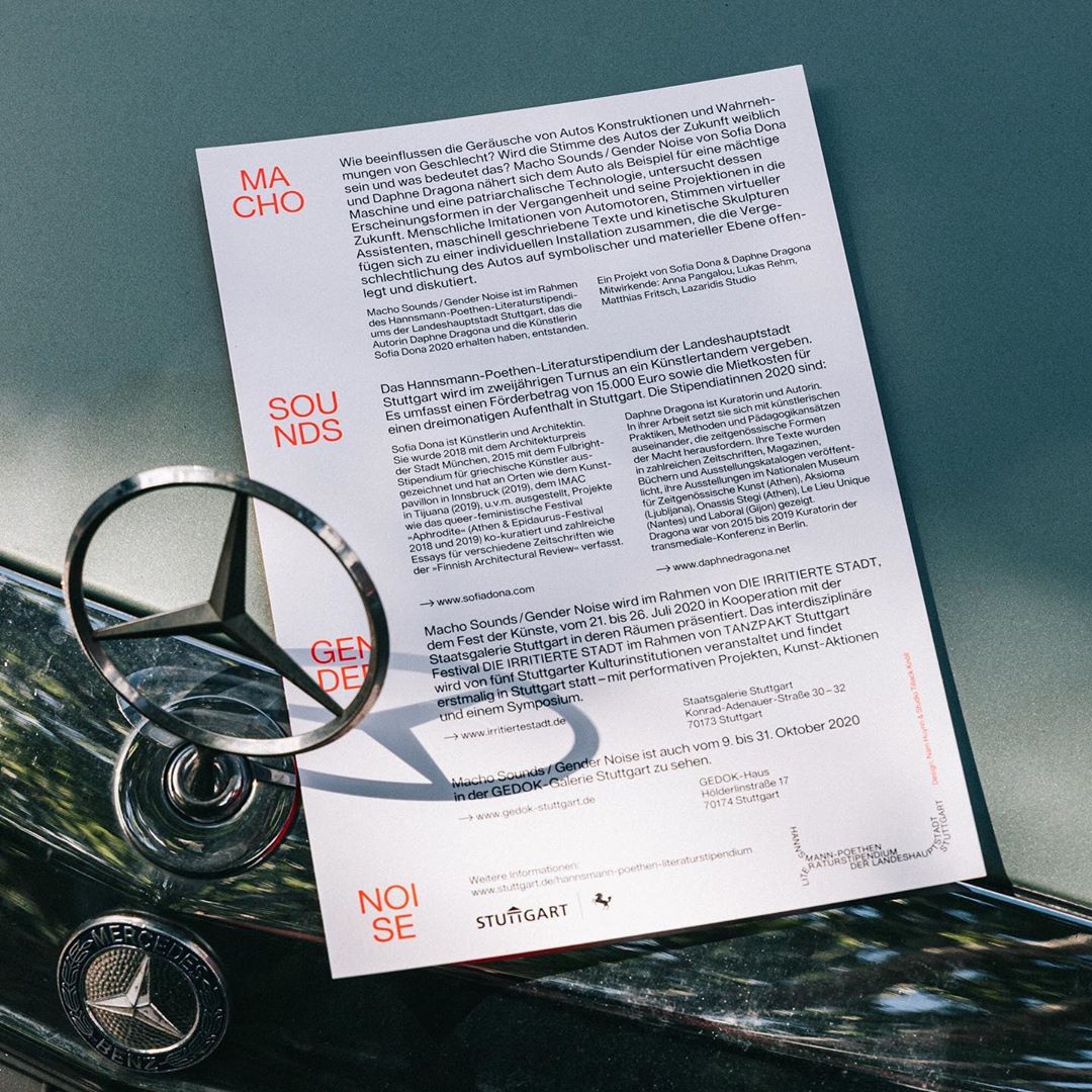 Designed by Nam Huynh in collaboration with Studio Tillack Knöll, this animated flyer incapsulates Macho Sounds/Gender Noise, a walk-in art and sound installation by Daphne Dragona and Sofia Dona questioning the sounds and noises of cars, gender and its presumed understanding within society. First presented at Die Irritierte Stadt festival in July, the installation is shown until 31 October 2020 at Gedok-Galerie, Stuttgart.