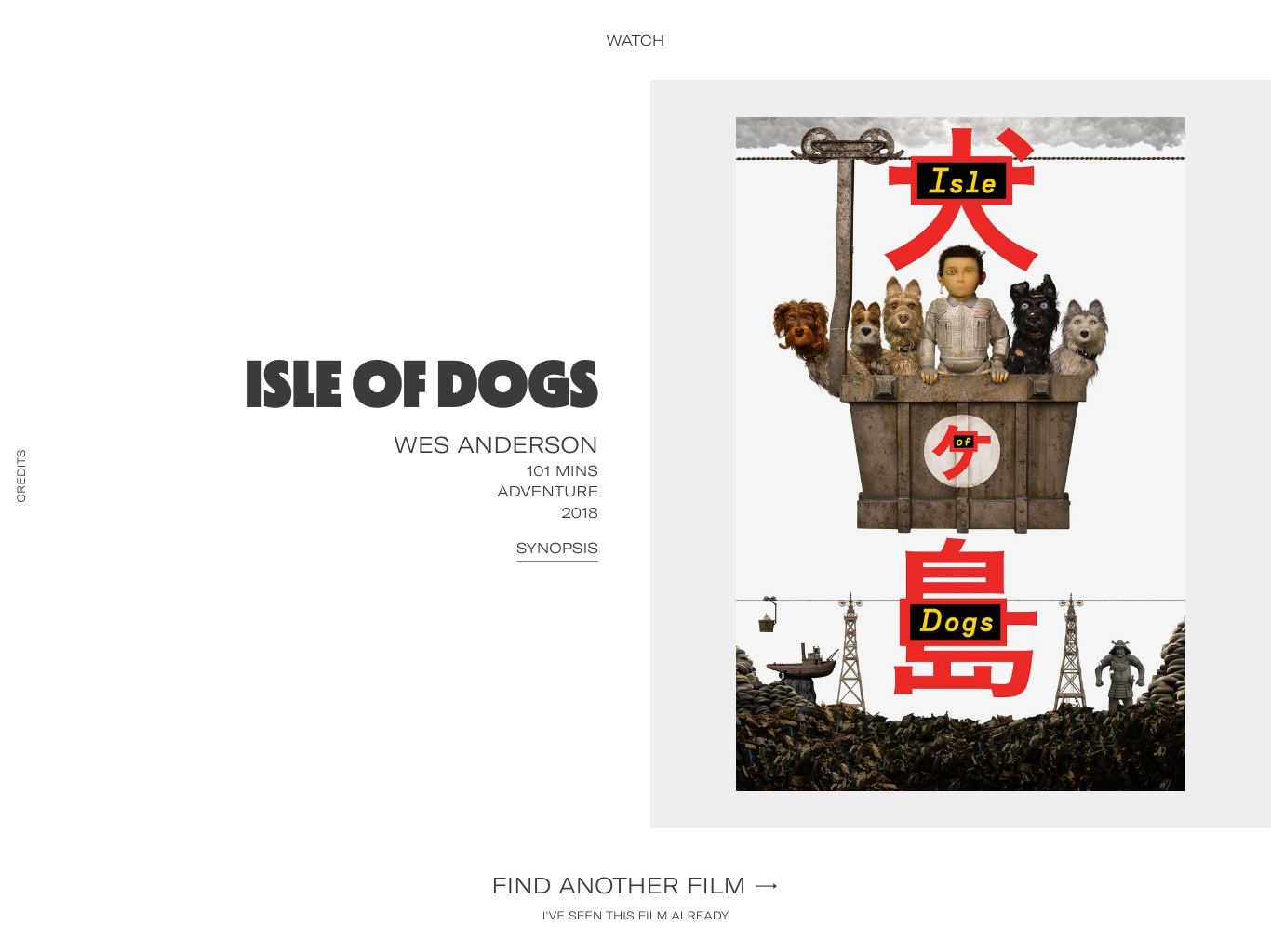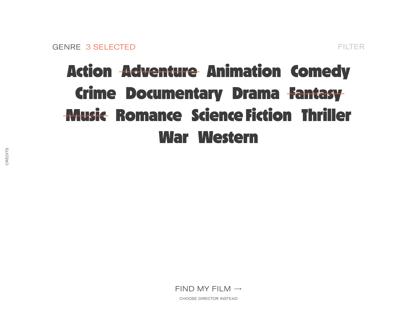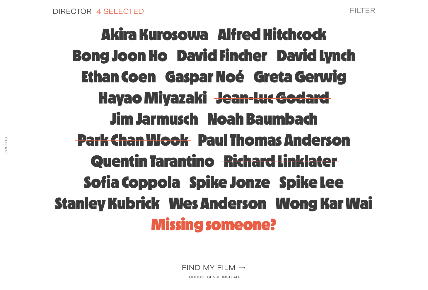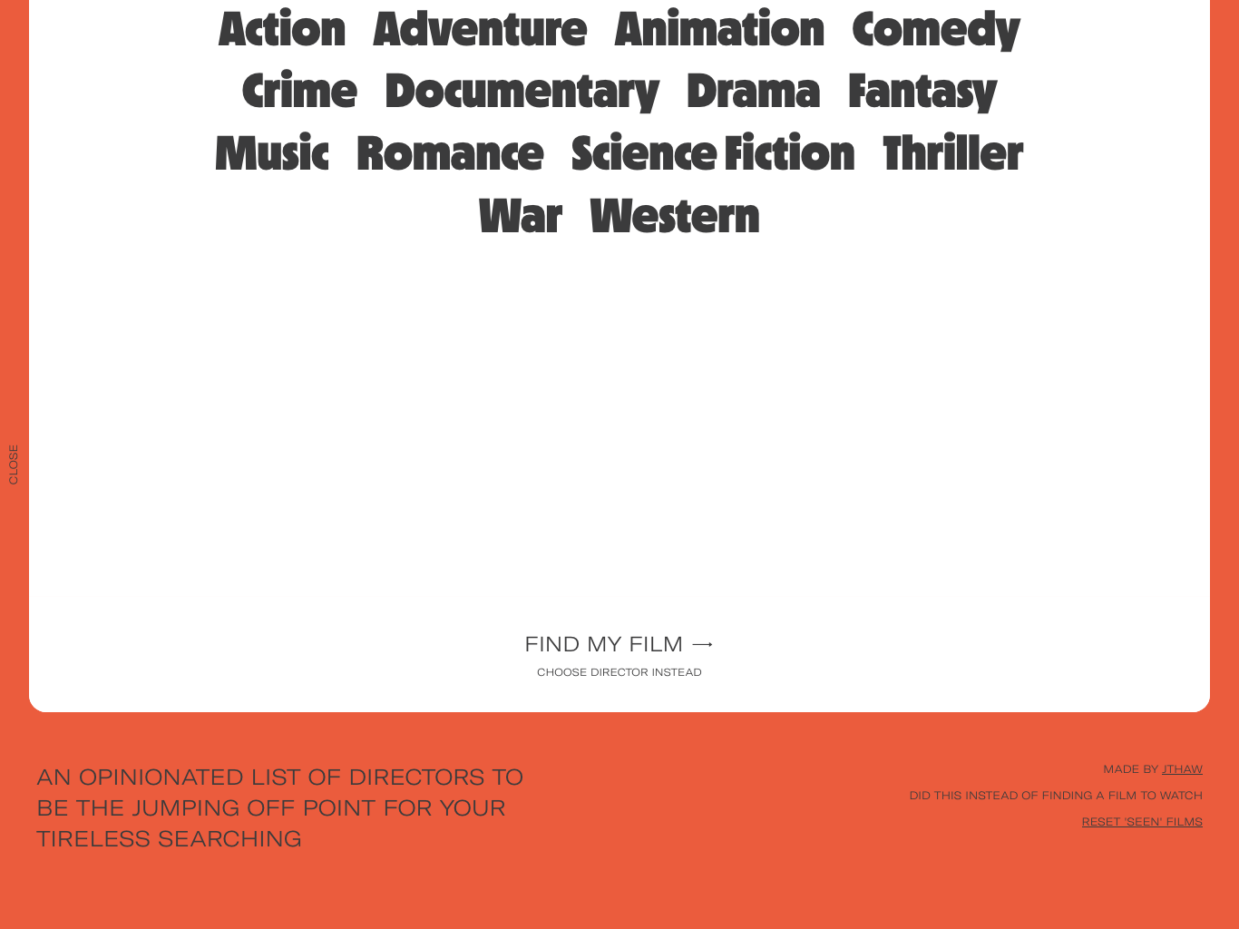 Watch Better Films is a website conceived, designed and built by Jonny Thaw who “did this instead of finding a film to watch”. Visitors are asked to pick a selection from a list of movie genres or directors, and the website will suggest three films.