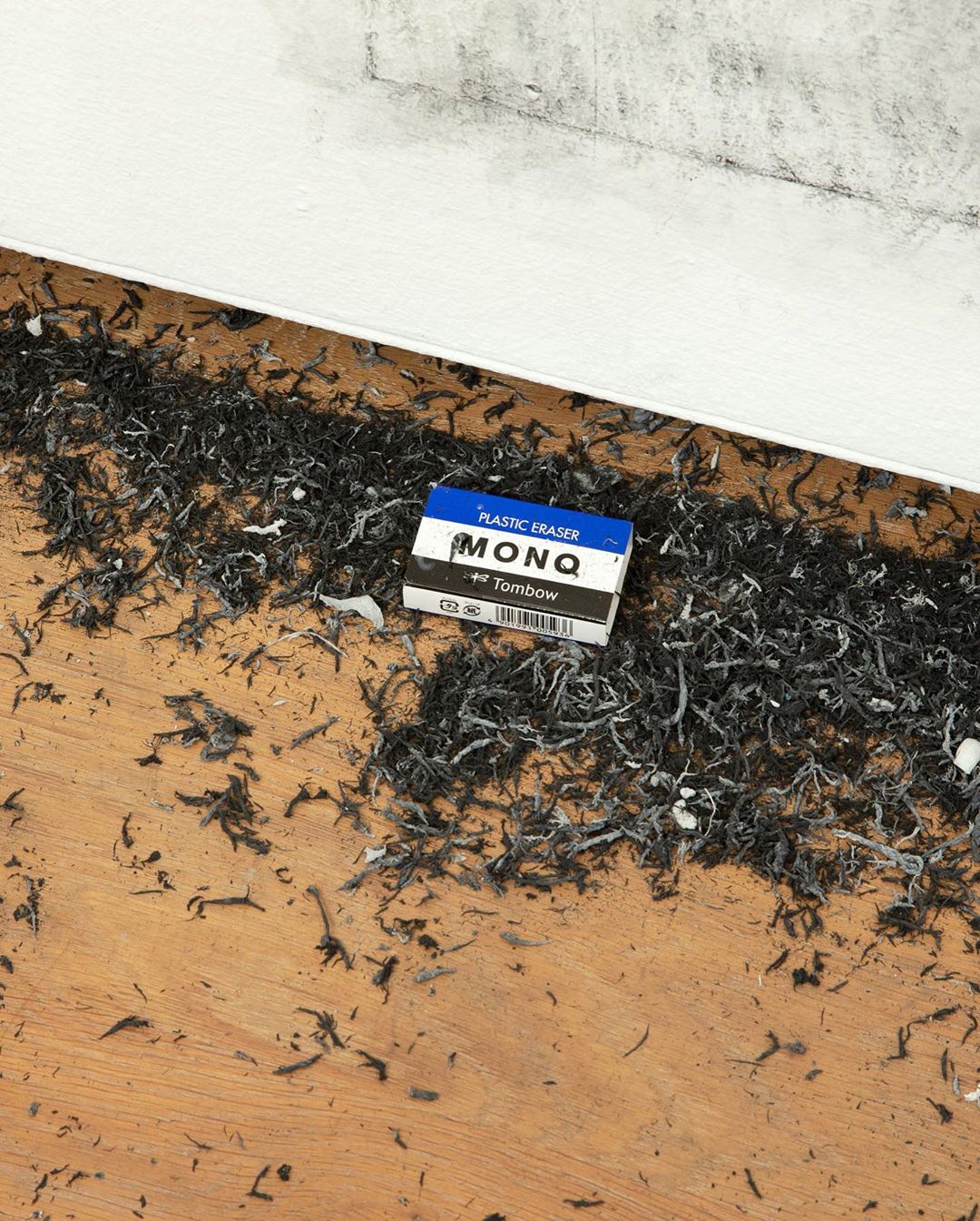 here and there, explanatory notes can be found on the exhibition path, for example when editing the large exhibition title lettering “Taro Izumi. Ex”. Izumi’s team erased some of the large letters that had been painstakingly applied with lead pencil in order to underline the flow between existence and disappearance. In wide arcs, traces of eraser scraps lead through the spacious exhibition rooms towards a making-of video.