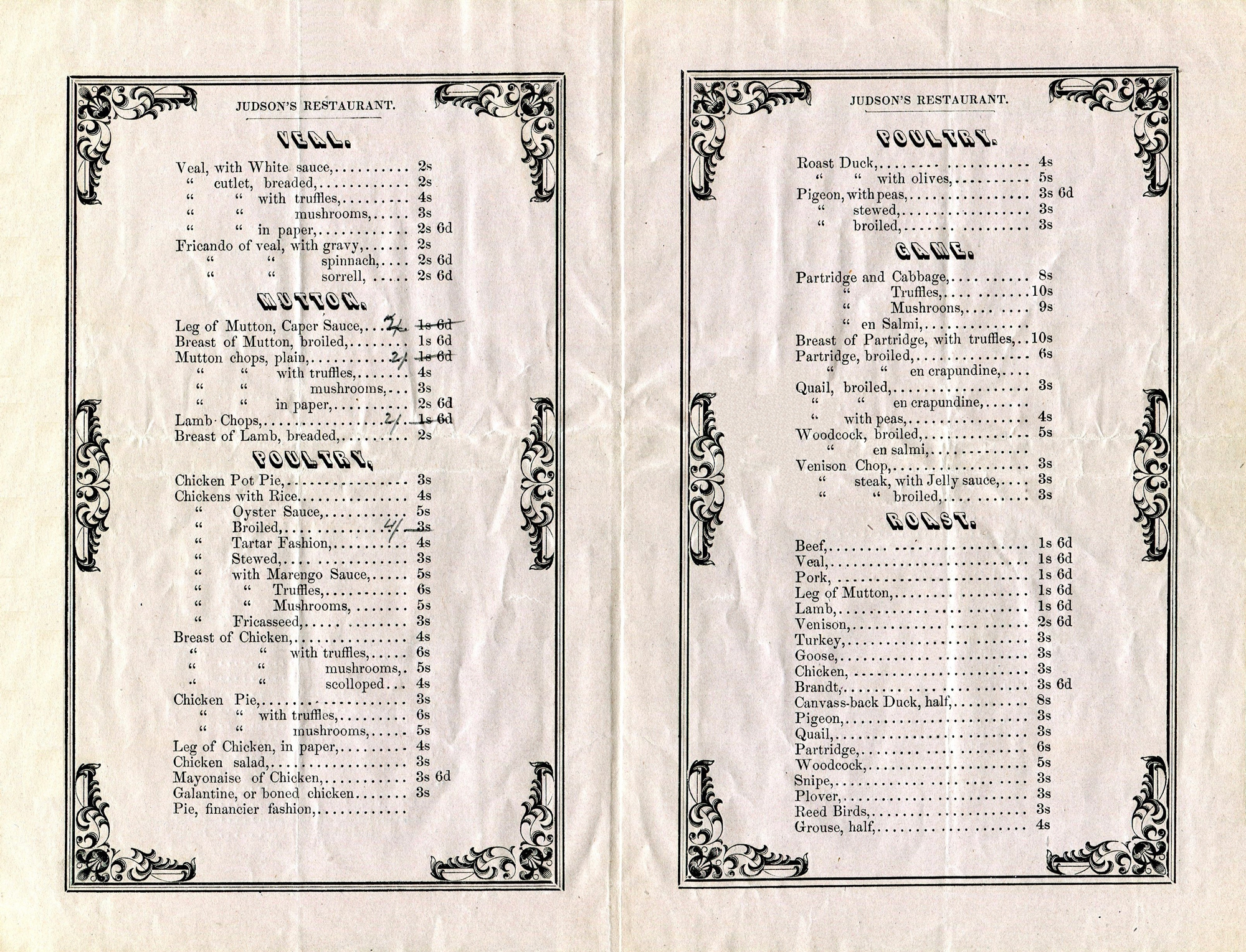 New Yorkers called the 6¼- and 12½-cent price increments a sixpence and a shilling, respectively, employing the British abbreviations “6d” and “s” for these units of American currency. For example, the price of the breaded veal cutlets on this six-page menu is shown to be 2s, or 25 cents. The most expensive dish shown here is the breast of partridge with truffles that costs 10s, which was about the amount a laborer earned for a day’s work.