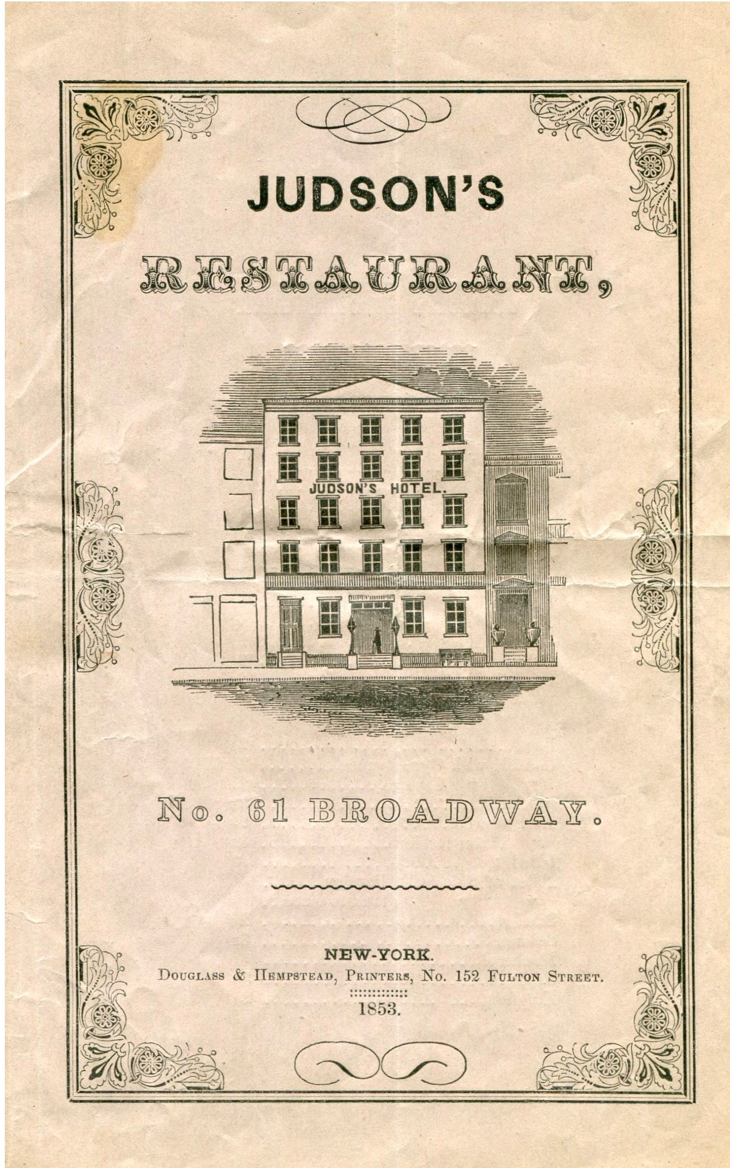 Judson’s Restaurant 1853 à la carte menu