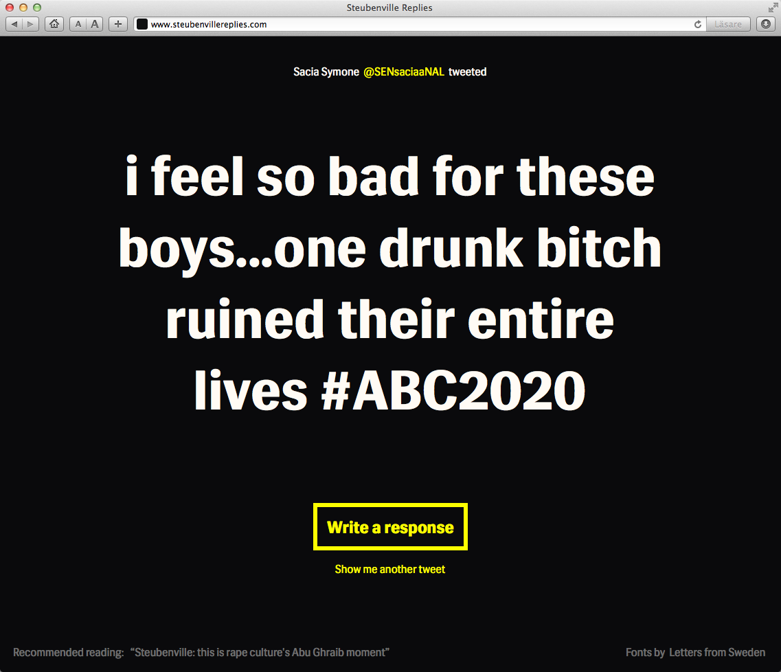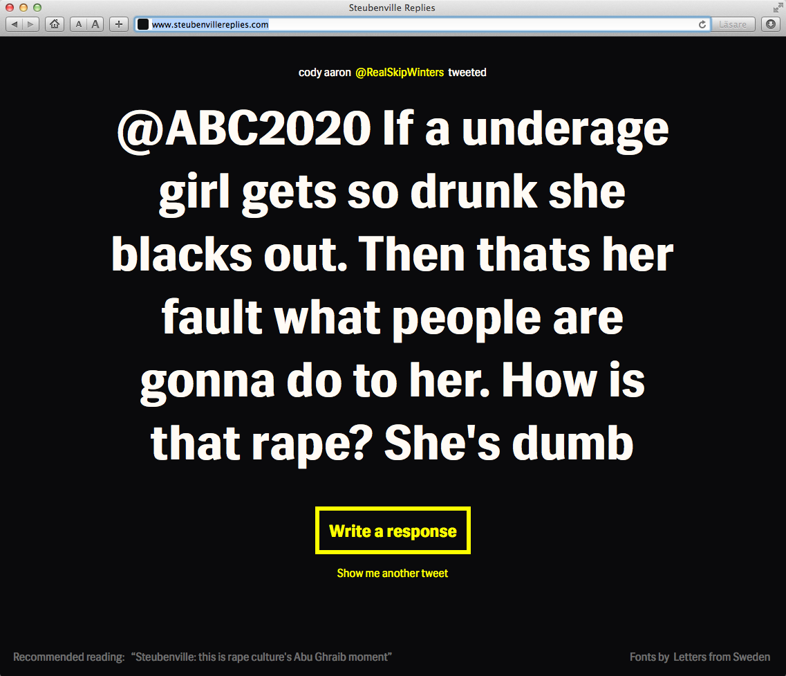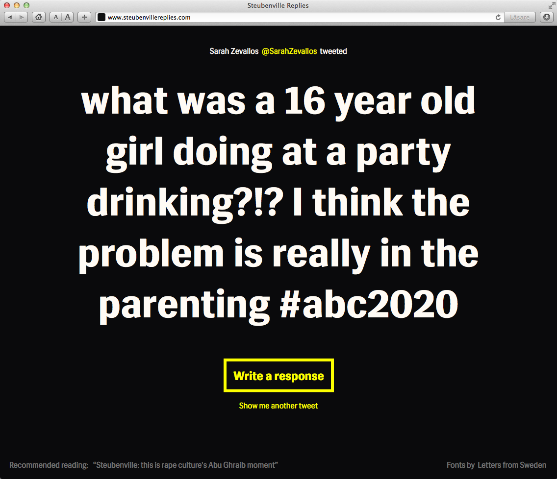Steubenville Replies Contributed by Letters from Sweden on Mar 29th, 2013. Artwork published in 2013. Source: www.steubenvillereplies.com License: All Rights Reserved. Steubenville Replies is a website that helps tweeters to challenge the #Steubenville tweets. Source: www.steubenvillereplies.com License: All Rights Reserved. Source: www.steubenvillereplies.com License: All Rights Reserved. Source: www.steubenvillereplies.com License: All Rights Reserved. Typefaces More about Siri CoreGet Siri Core Formats Web (5663) Topics Activism (1121) Designers/Agencies Martin Löfqvist (2) Jacob Åström (1) Isak Burström (1) Tagged withSteubenville (1) Post a comment Name Email – will not be published Website Your response Submit Comment More Siri Core in use Appsters2013FamiljenPangeaContributed by Letters from Sweden Booster Conference 2013 Designmanual2013Elisabeth IrgensContributed by Letters from Sweden Christian Haagc. 2014Kod & FormContributed by Letters from Sweden Sponsor More in Activism Vietnam Inc. by Philip Jones Griffiths1971unknownContributed by Stephen Coles UN Decade of healthy ageing2022unknownContributed by TypeType Festin de Babette 2014 souvenir book2014LG2Contributed by Stephen Coles Second City Volume 1, Number 61968Guild Cooperative FellowshipContributed by Garrison Martin Staff Pick More in Web BioInnovation Institute digital and identityc. 2017Jonas Heckshere-TypesContributed by Playtype Foundry The Madrona Hotelc. 2022Ateliers Saint-LazareMargot LévêqueContributed by Fanny Hamelin Staff Pick Cochran branding2017Signal Type FoundryMax PhillipsContributed by Max Phillips 4-Football brand identity and websitec. 2020Marc Blanes StudioContributed by F37® More Fonts In Use Magus. The Art of Magic from Faustus to Agrippa by Anthony Grafton2023Jaya MiceliTim JonesContributed by Florian Hardwig Staff Pick Seattle Met “The 2012 Best Restaurants”2012André MoraContributed by André Mora Staff Pick Ziemba / Jeanne Vomit-Terror / Robert Beatty at Green Lantern Bar2019Robert BeattyContributed by Florian Hardwig Staff Pick Les 2 Scènes, saison 2012–20132012Thomas Huot-MarchandContributed by 205TF Staff Pick