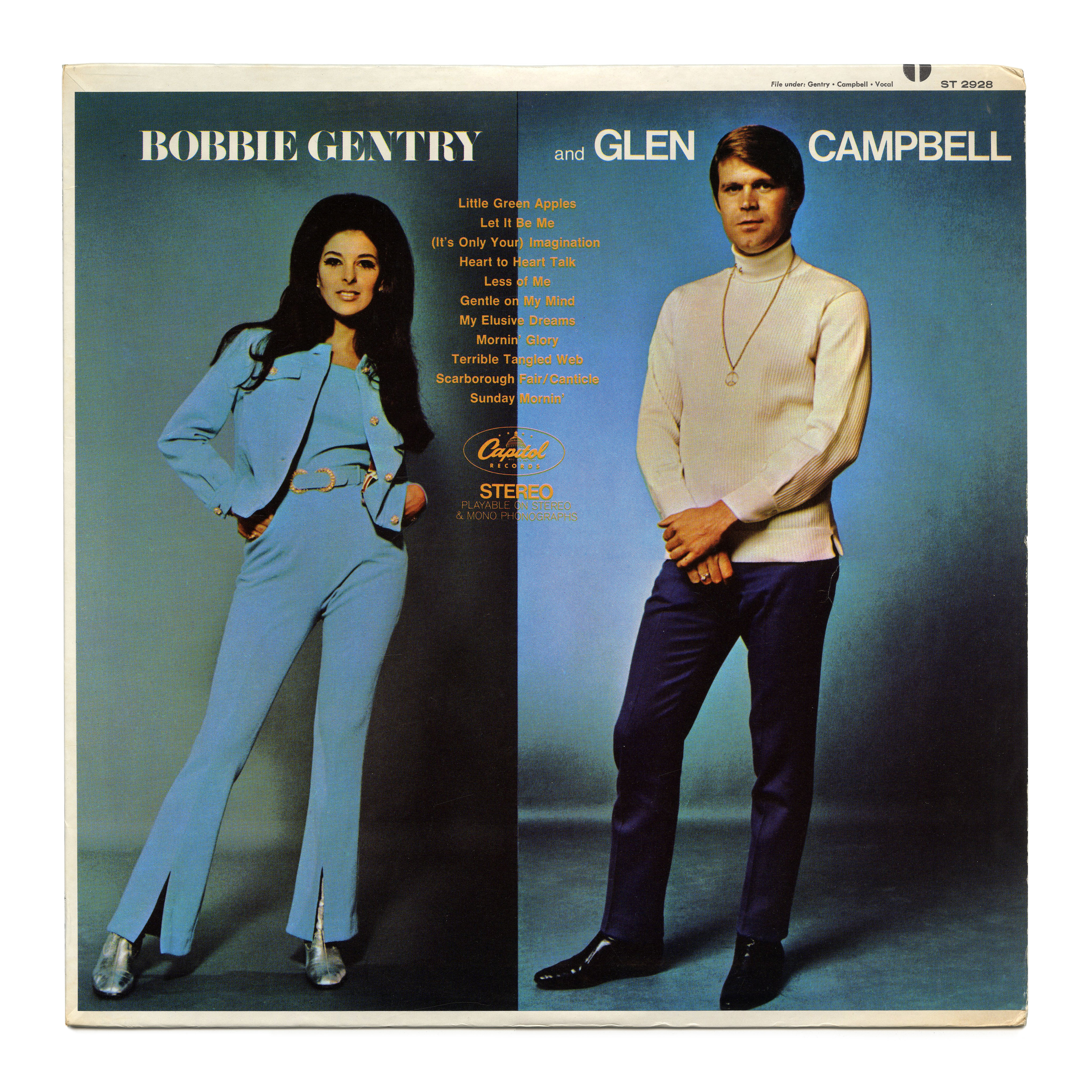 Bobbie Gentry and Glen Campbell is Gentry’s third(!) album release of 1968 with Capitol Records: an album of duets with label mate Glen Campbell (1936–2017). The uncredited typographer assigned a serif (Pistilli Roman) to her, and a sans (Helvetica) to him.