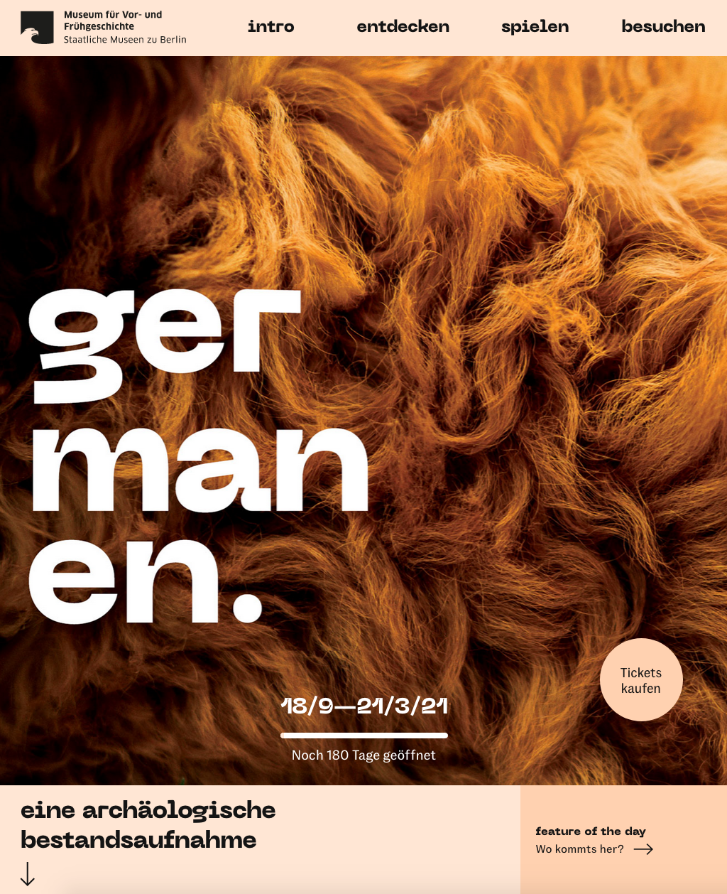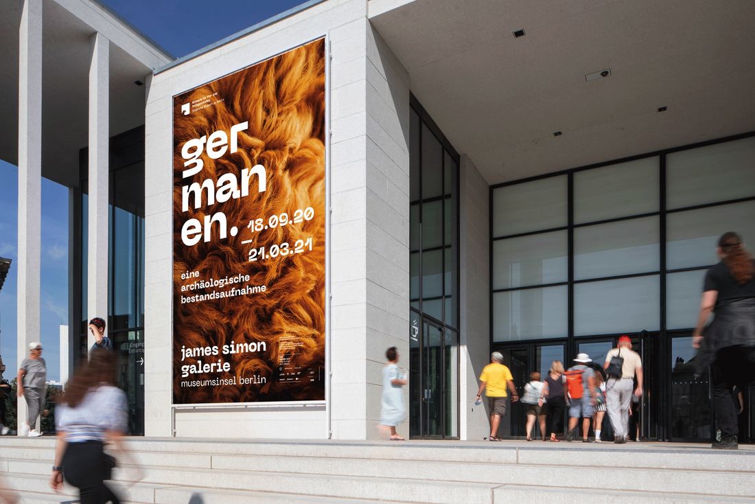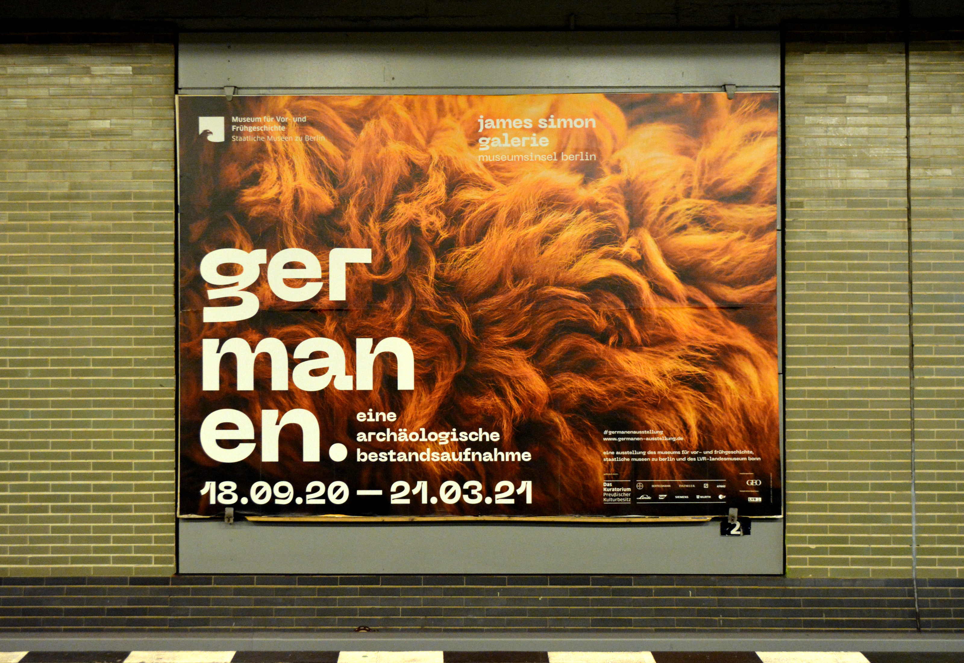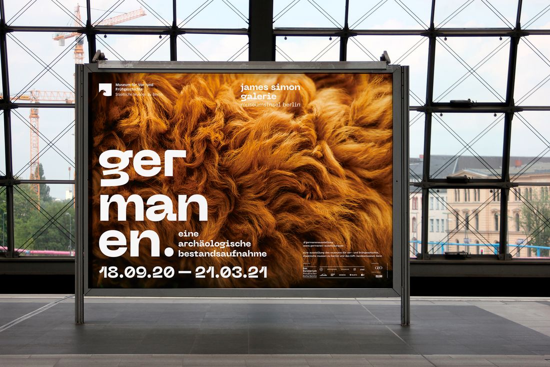 The visual identity and communication for the exhibition were designed by Polyform and Studio Edgar Kandratian. The title Germanen (“Germanic tribes”) is broken up into three lines, maybe to playfully emphasize the etymological link to the modern term German. It’s shown in all lowercase letters, in white against a photographic image of what appears to be fur.