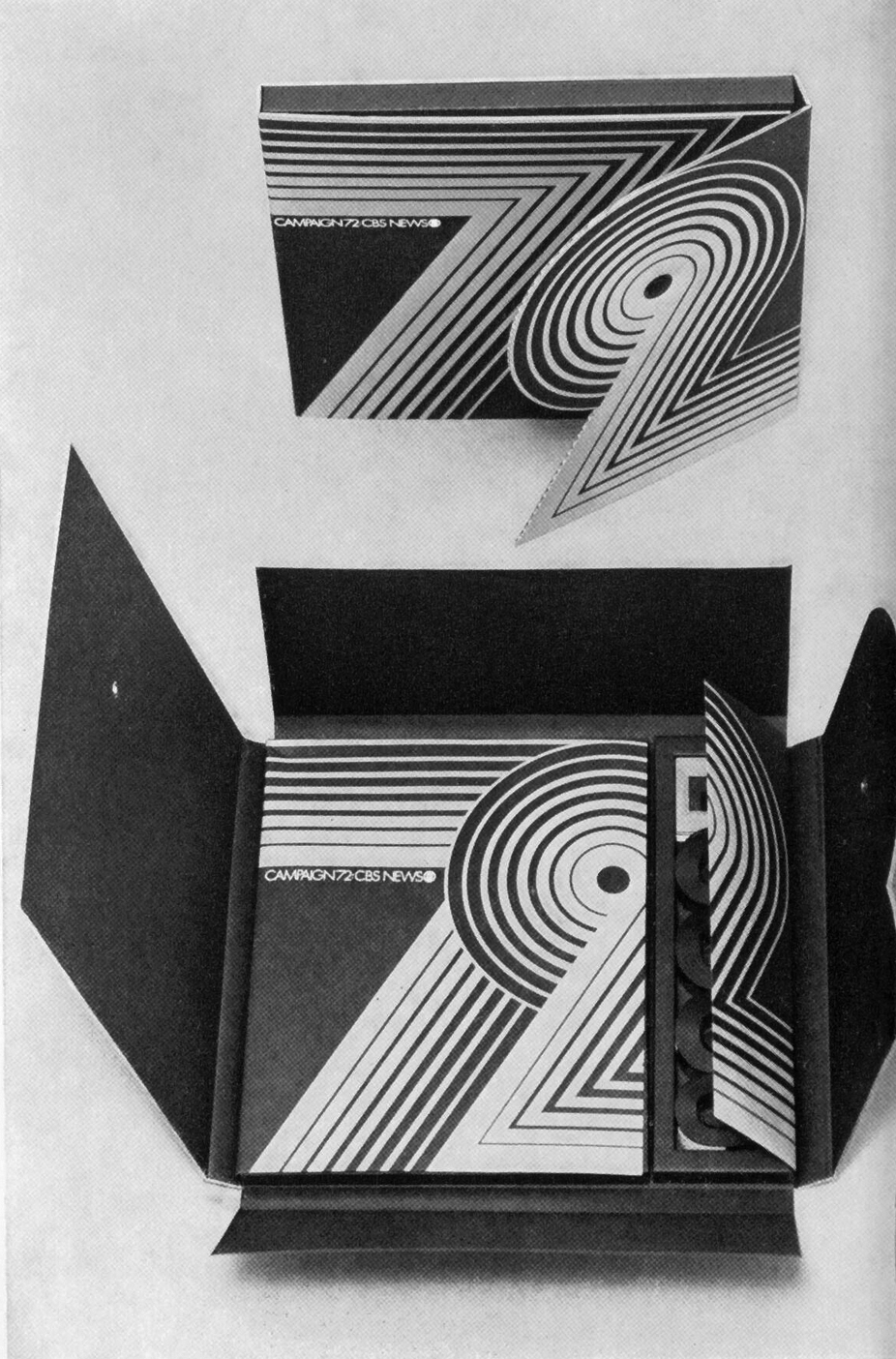 Folding cardboard box containing material on the 1972 election campaign, blue, red, and black. Design by Akihiko Seki for CBS/Broadcast Group. Reproduced in Graphis #168, March 1974.