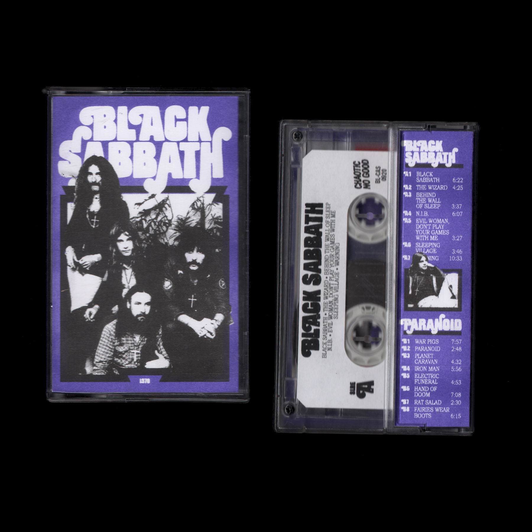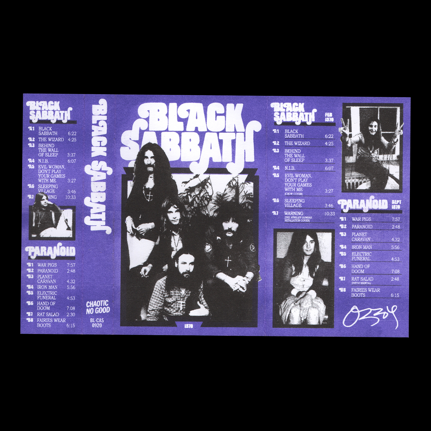 2020 is a lot of things, but it also celebrates 50 years of Black Sabbath and Paranoid. Here is a bootleg cassette containing both albums in full on their respective side, all dubbed on one 90 minute cassette. Original j-card design from Chaotic No Good, two-color risograph printed by Martian Press.