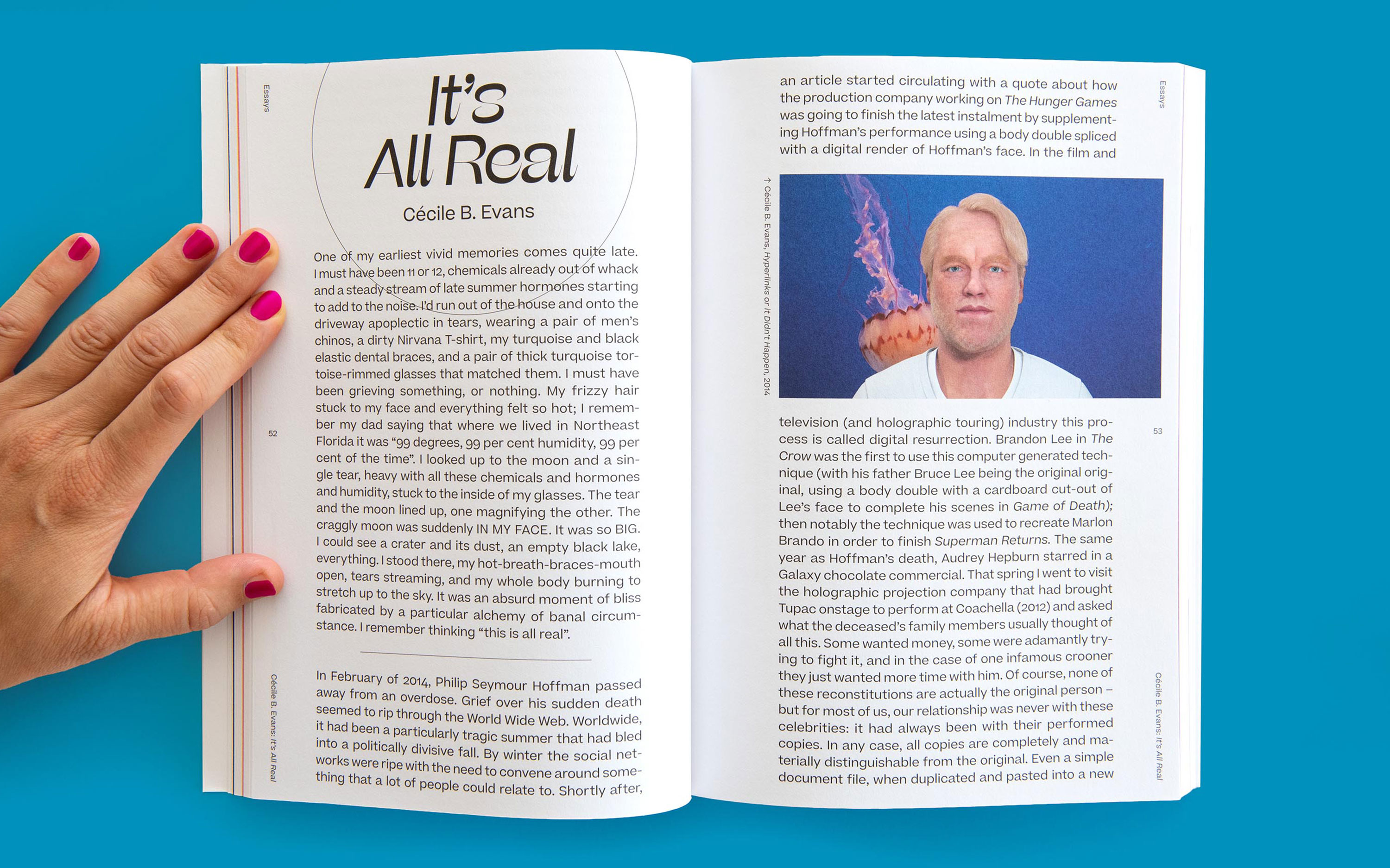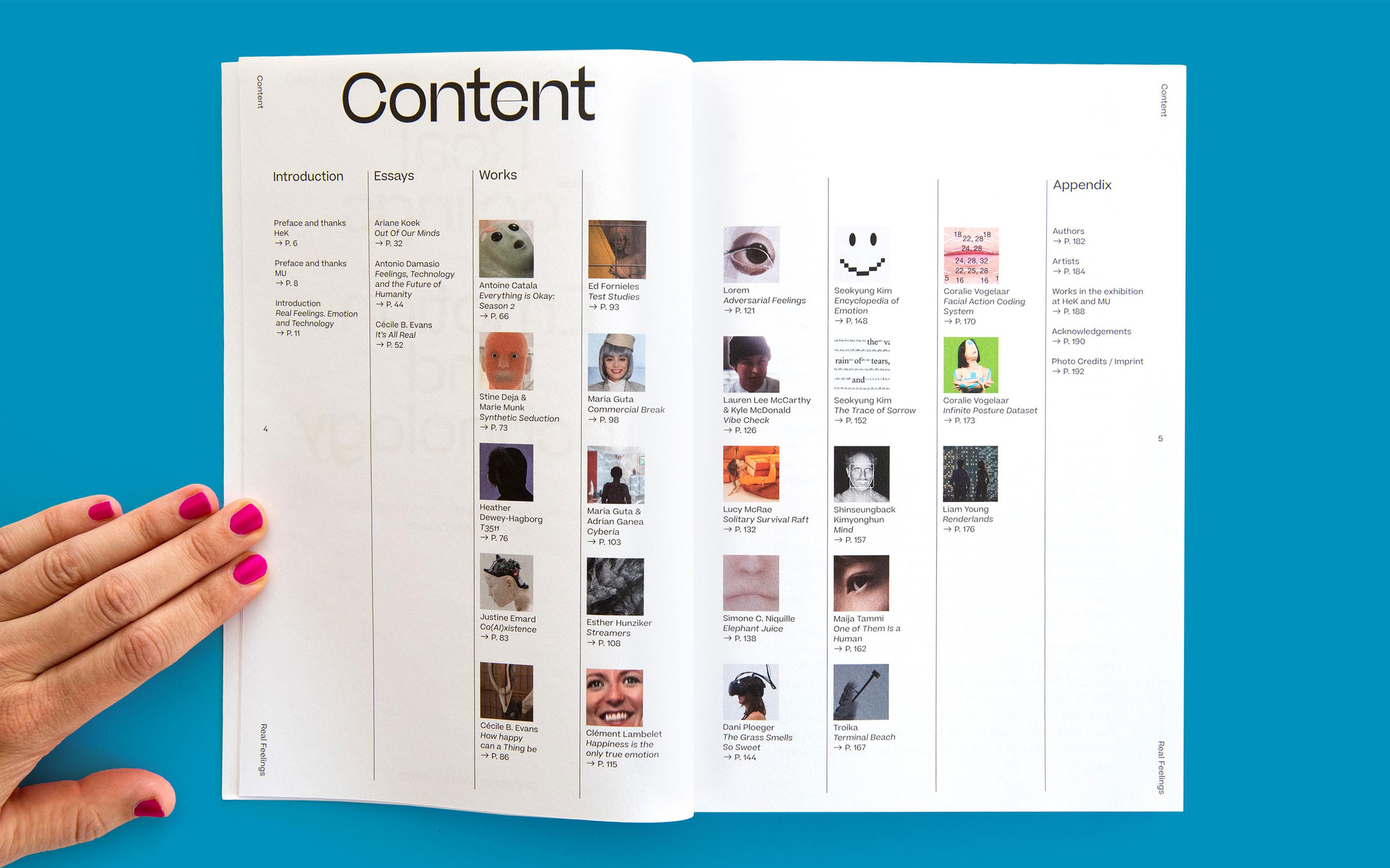 The cover includes a stark portrait of a person welled up in tears, a work by Dutch artist Coralie Vogelaar. The catalog comes with a transparent jacket that creates a diagrammatic overlay on the human’s face. “We came up with the idea to separate the face and the “action units” (arrows and numbers representing face muscles) in the artwork, for two reasons. First, to hide the person’s emotion: you’ll only see her tears when you take off the transparent film. Second, you can apply the transparent film in front of your own face and therefore, be part of the art,” wrote partner David Schwarz.