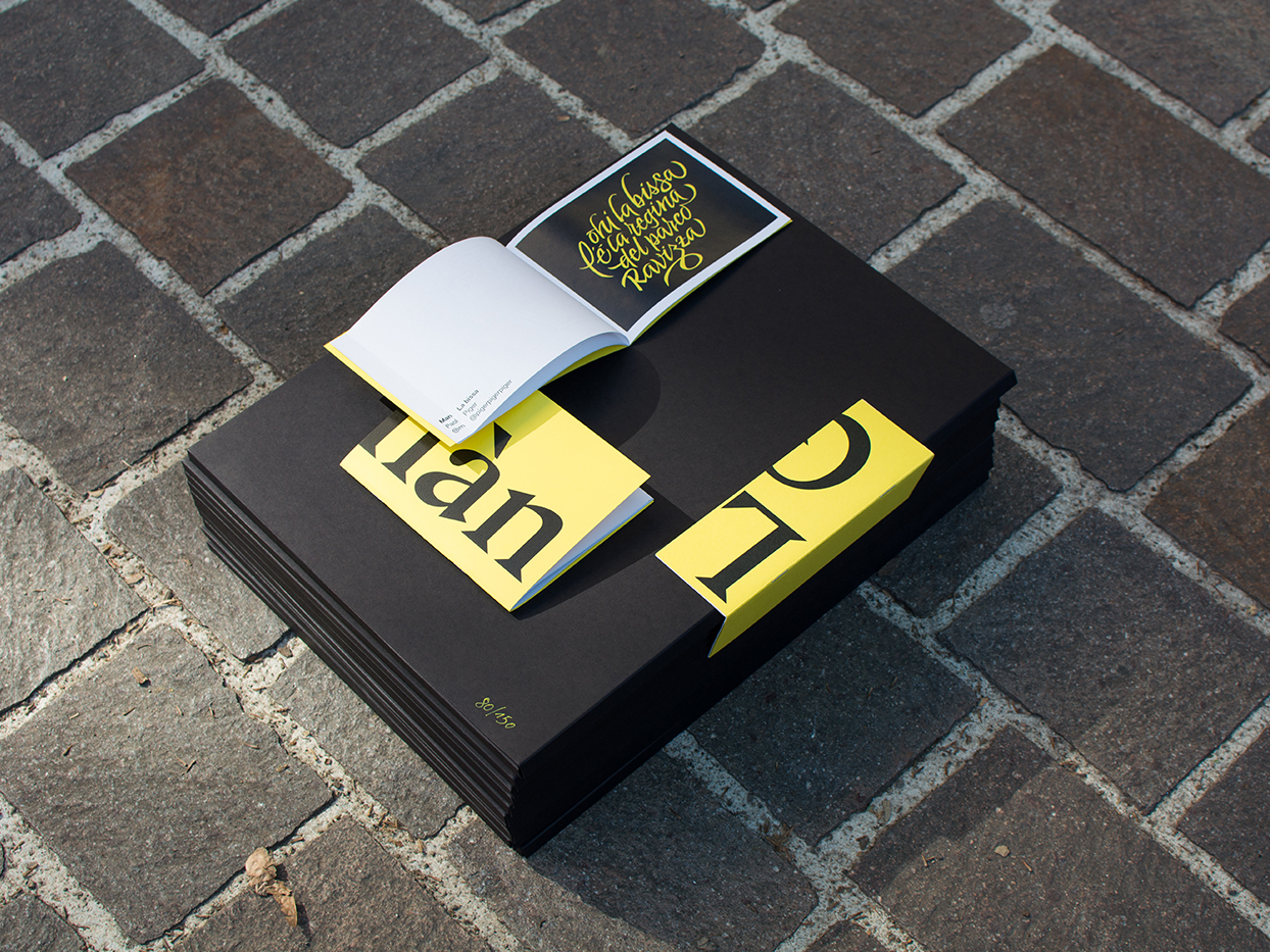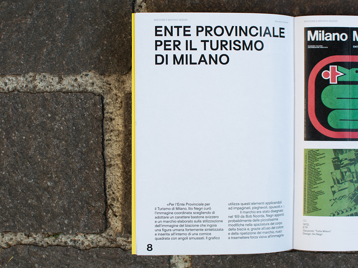 The project, printed in a limited edition of 150 copies, contains three short stories (7×11cm), one research of 80 pages that investigates the use of the Biscione in graphics (17×24cm); a fanzine containing 15 illustrations (15×23cm); a fanzine with nine illustrations (15×11.5cm); a fanzine with 18 illustrations (11.5×15cm) and eleven posters (30×40cm).