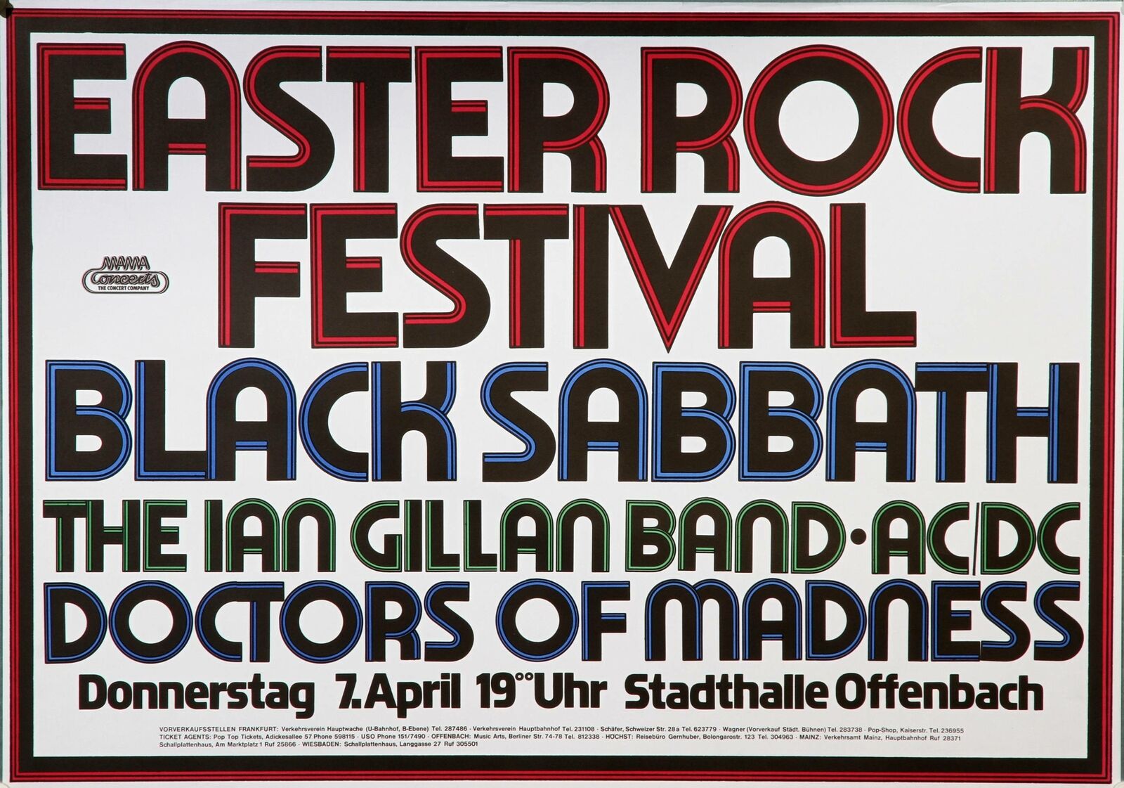 The festival stopped in four German cities; Offenbach (Stadthalle, 7 April), Cologne (Sporthalle, 9 April), Nuremberg (Messehalle, 10 April), and Ludwigshafen (Eberthalle, 11 April). The lineup included Black Sabbath, The Ian Gillan Band, AC/DC, and Doctors of Madness. On some days, they were supported by Caravan, John McLaughlin’s Shakti, and Jane.