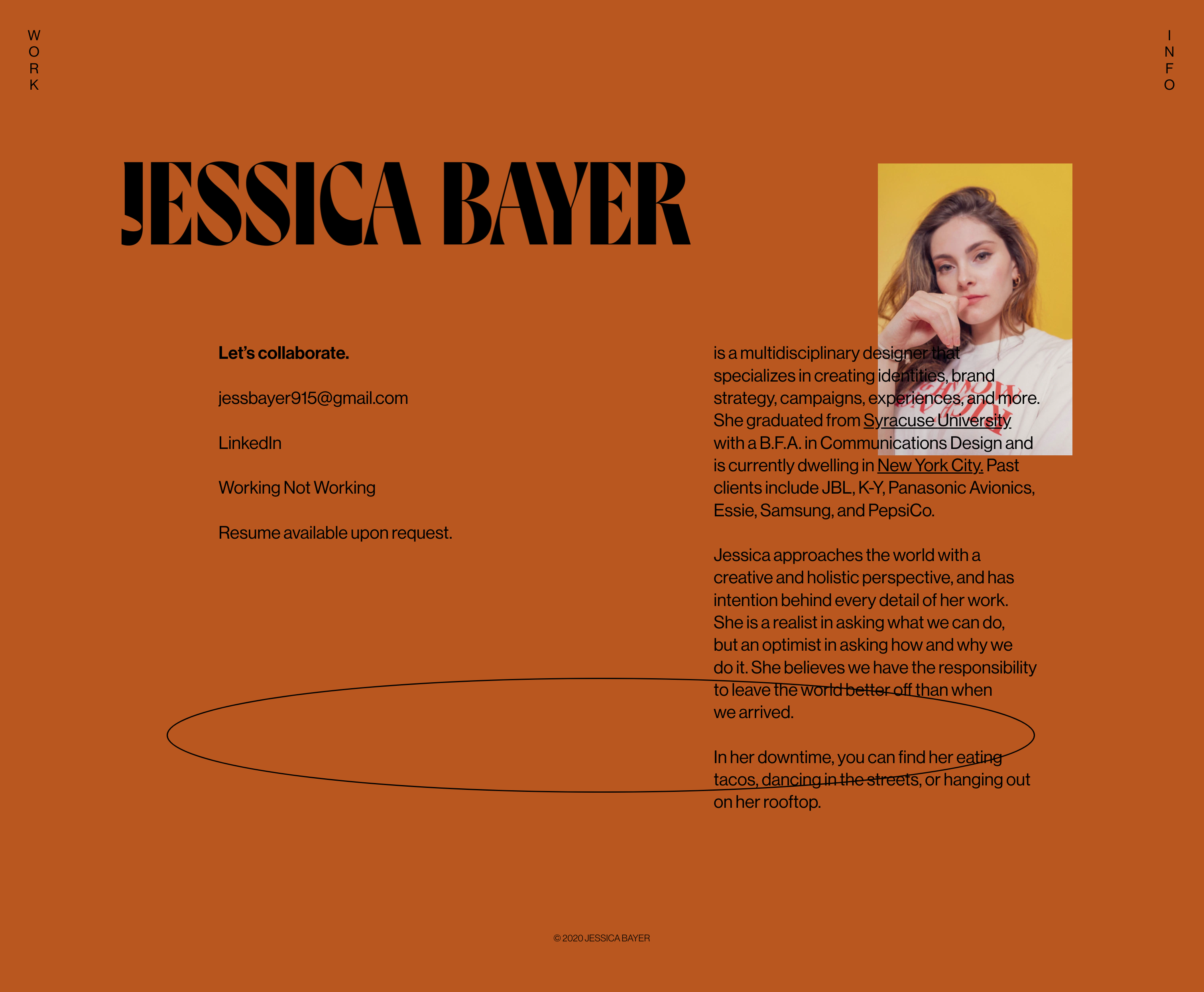 Jessica Bayer is a multidisciplinary designer that specializes in creating identities, brand strategy, campaigns, experiences, and more. She graduated from Syracuse University with a B.F.A. in Communications Design and is currently dwelling in New York City. Past clients include JBL, K-Y, Panasonic Avionics, Essie, Samsung, and PepsiCo.