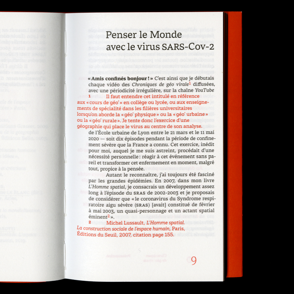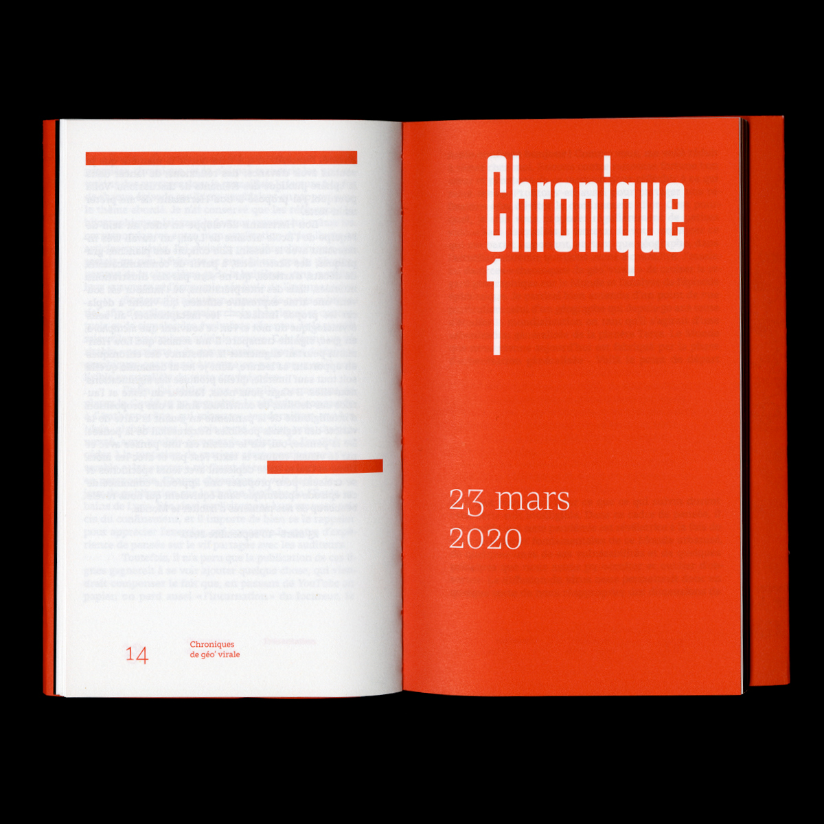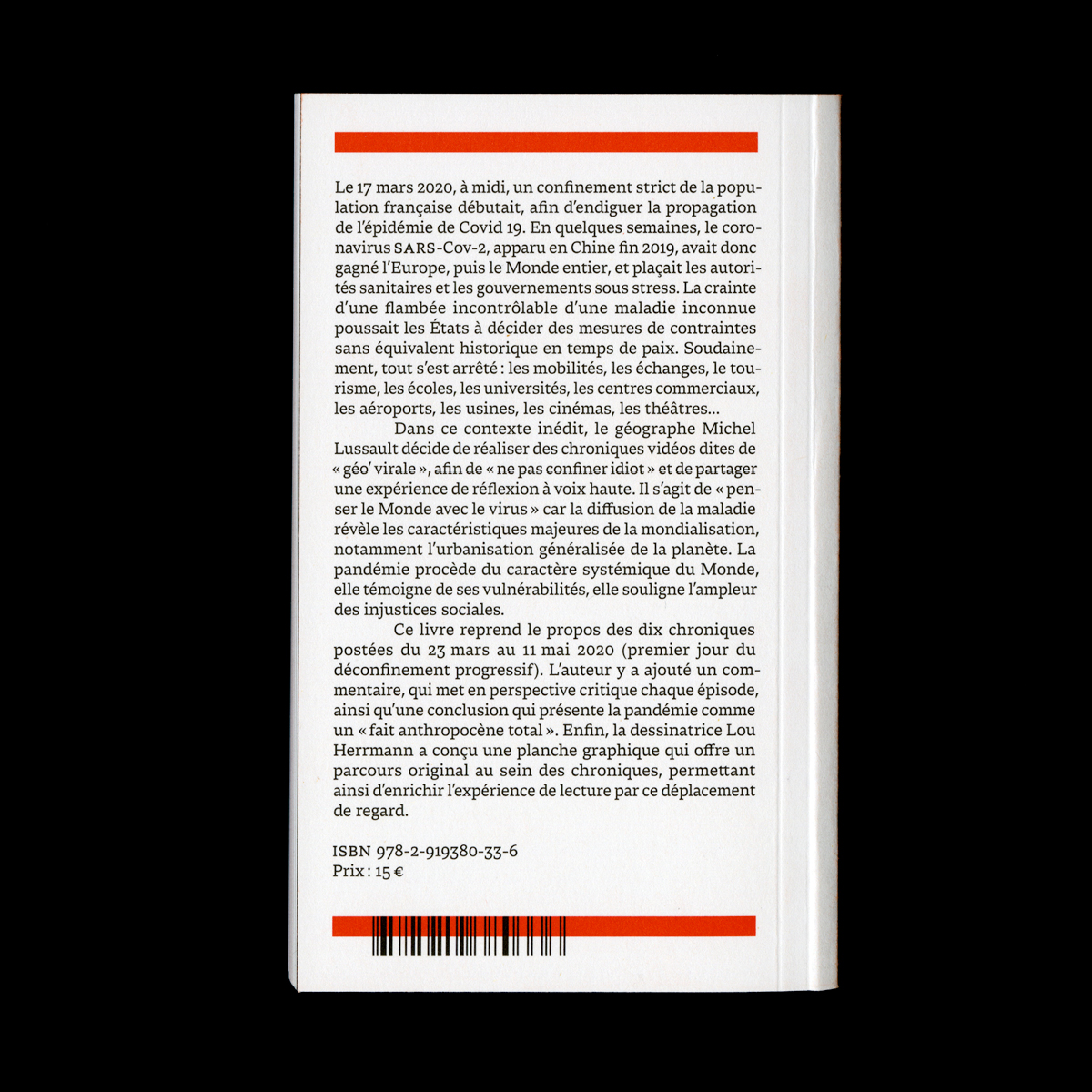 Chroniques de géo’ virale designed by Bureau 205 transcribes the ten chronicles posted from March 23 to May 11, 2020 (when total lockdown progressively ended). The author added commentaries, which puts each episode in critical perspective, as well as a conclusion that considers the pandemic as a “total fact of the anthropocene era”. In order of offering a different view on the text, illustrator Lou Herrmann designed a graphic journey through the chronicles, to enrich the reading.