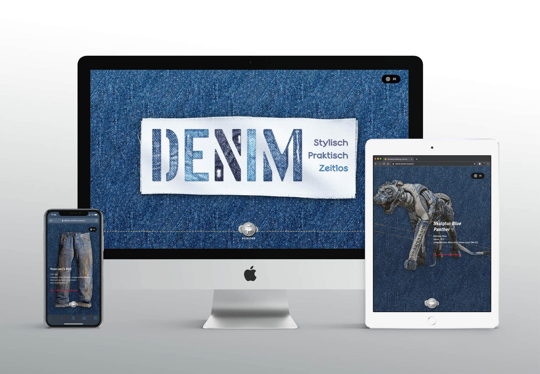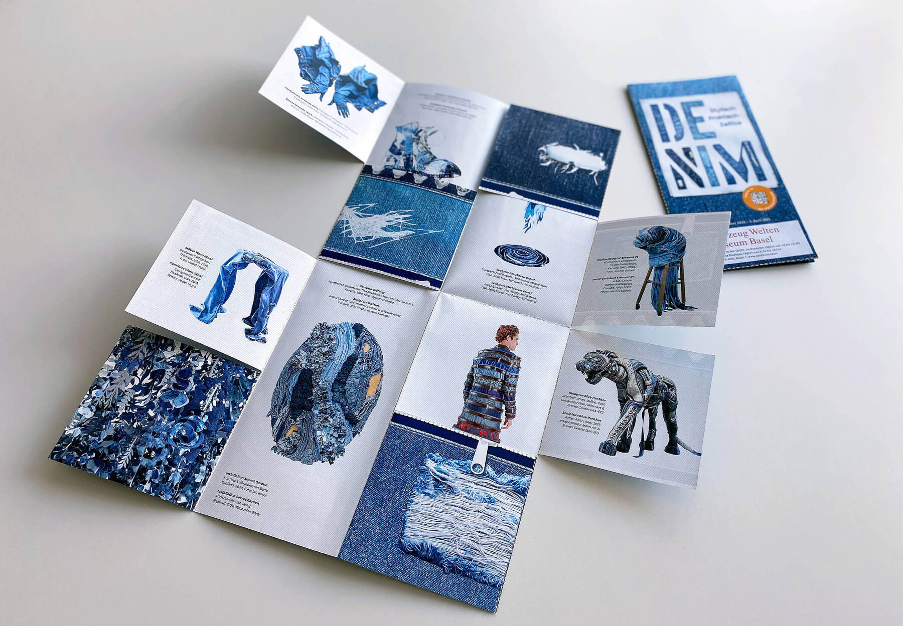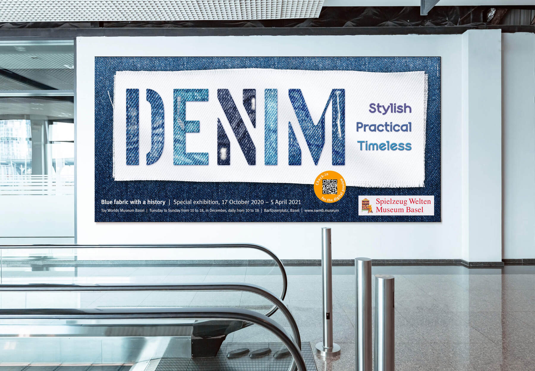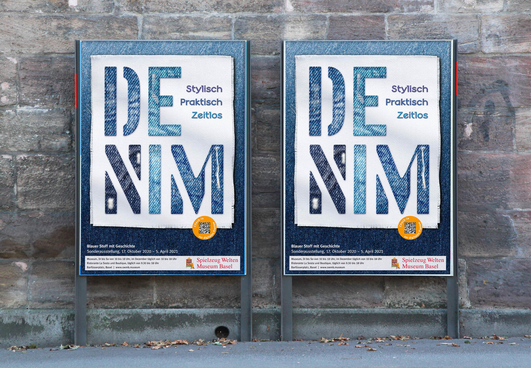 Denim is a special exhibition shown at the Spielzeug Welten Museum (Toy Worlds Museum) in Basel, Switzerland. For the main title, Vtg Stencil US No.72 by astype fonts was used. The stencil letterforms were filled with denim textures in various shades of blue.