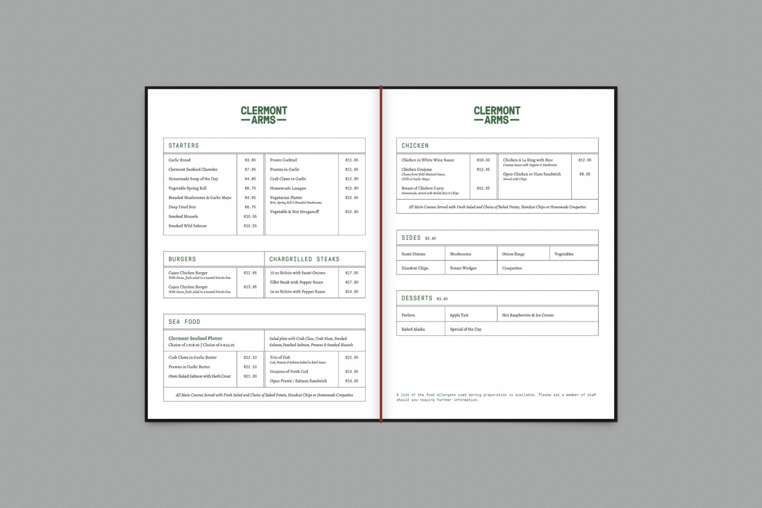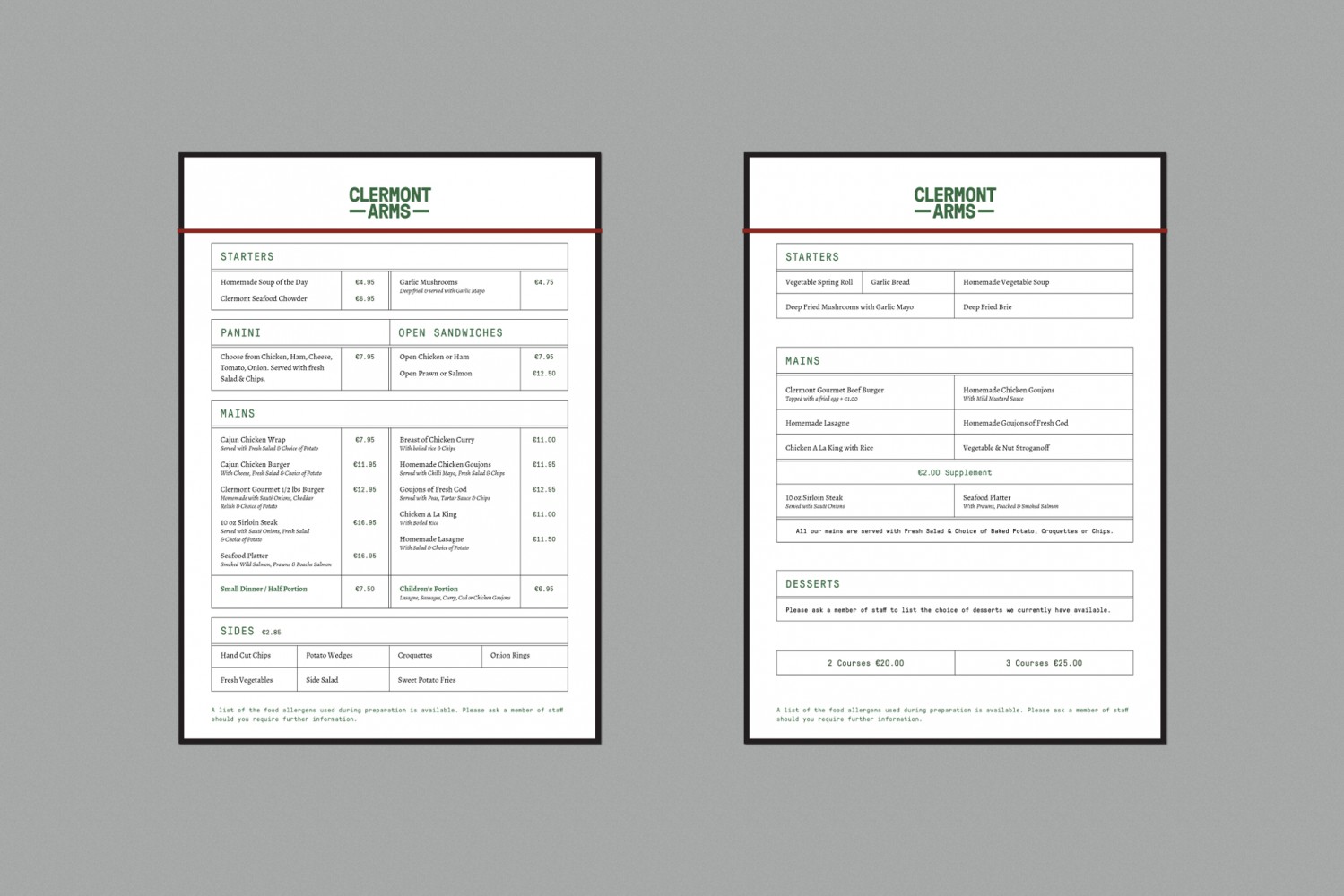The Clermont Arms is a family orientated bar and eatery. Part of Blackrock’s main street, the wordmark takes inspiration from the stone carved typography protruding from buildings facade since the early 20th century. We used the wordmark, along with a hearty colour palette to achieve a no-frills, authentic approach which was applied to a range of printed material and signage.