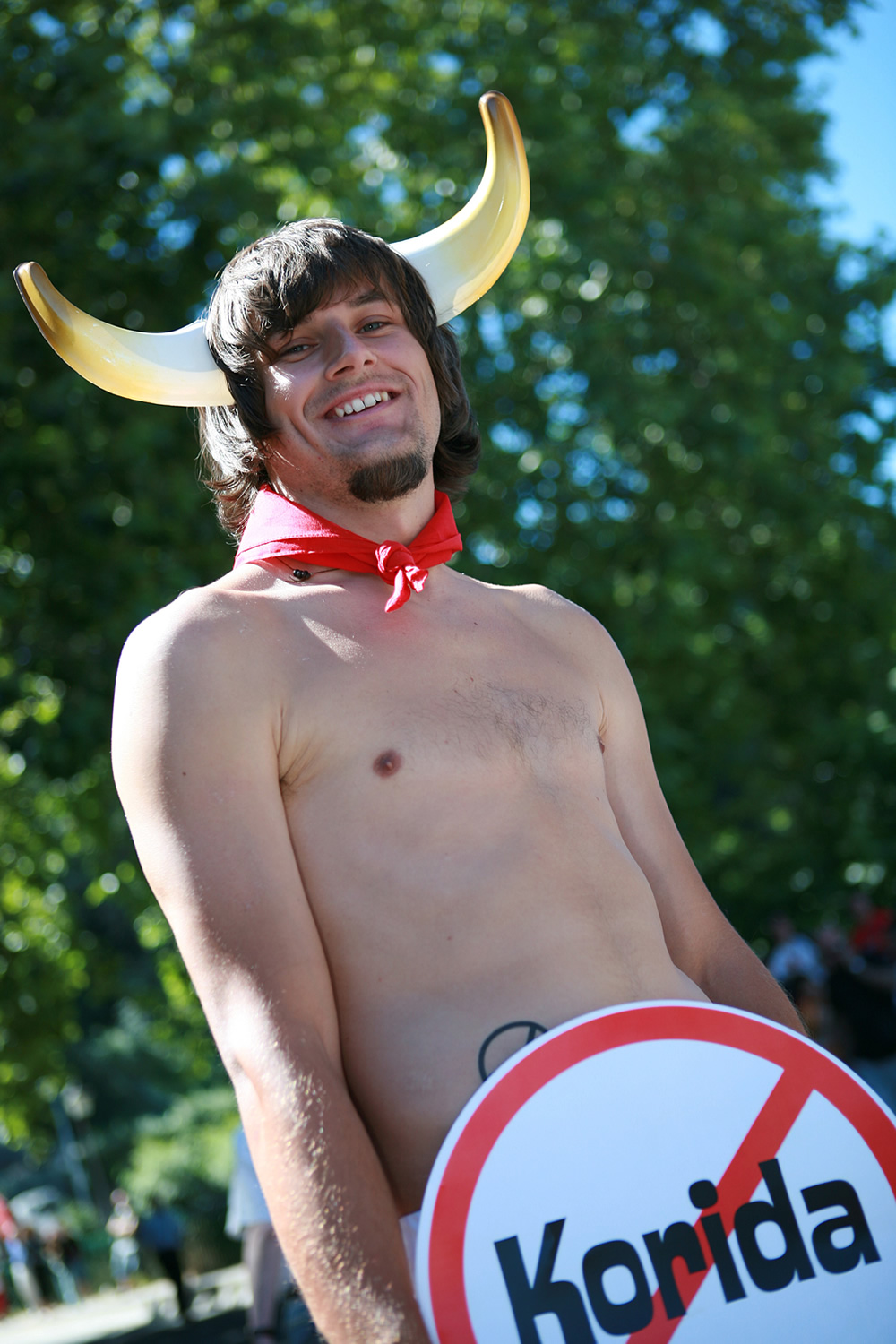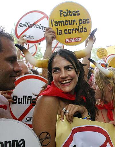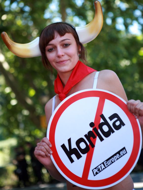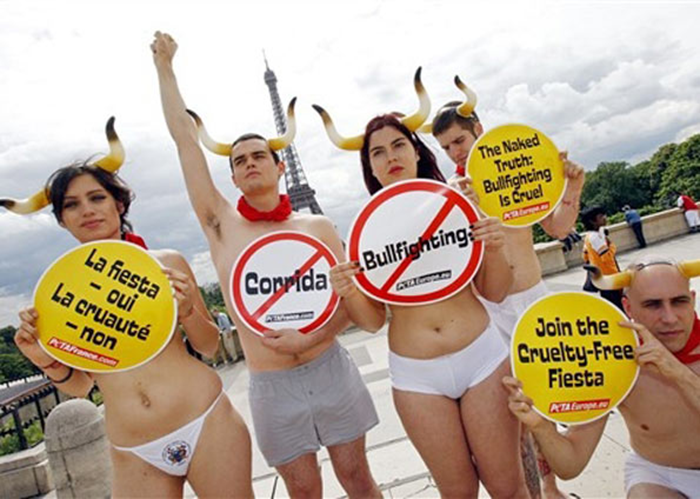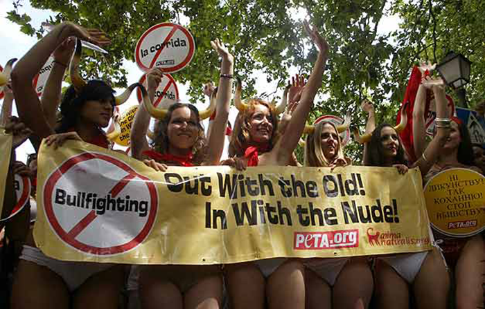 In 2006 and 2007, animal rights organization PETA ran a campaign to abolish the cruelty that is bullfighting. There were various demonstrations including in Pamplona, Spain, and Paris, France. Protestors showed up wearing little more than panties, red scarves, and fake bull horns. The activists’ nude skin was intended to attract attention, and also was reflected in the messages on the signs and banners: “The Naked Truth: Bullfighting is Cruel”, or “Faites l’amour, pas la corrida” (“Make love, not bullfights”).