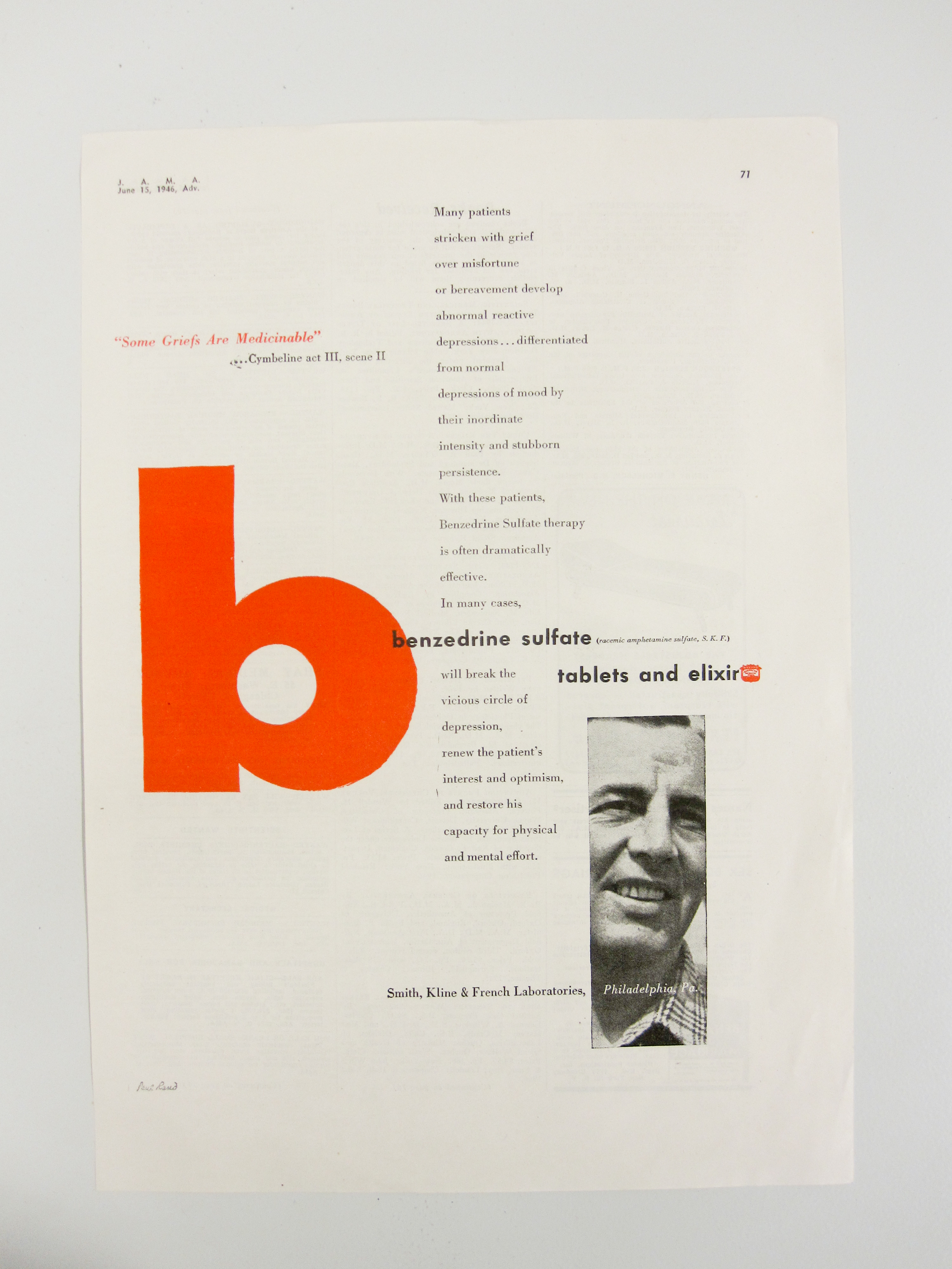 Benzedrine Sulfate Ad Contributed by Tânia Raposo on Apr 4th, 2013. Artwork published in 1946. Source: www.flickr.com Herb Lubalin Study Center. License: All Rights Reserved. Typefaces More about BodoniGet BodoniMore about FuturaGet Futura Formats Advertising (2074) Booklets/Pamphlets (2356) Topics Health/Fitness (867) Designers/Agencies Paul Rand (10) Tagged withmedicine (55)pharmaceuticals (43) Artwork location United States (9754) In SetsSelection (Francisco Besa) (125)Moodboard (R A) (12) Post a comment Name Email – will not be published Website Your response Submit Comment More Bodoni in use úne histoire extraordinairec. 2017Ruslan BeridzeZakharia MesropovContributed by Zakharia Metreveli The New Yorkers book cover1969Paul BaconContributed by Stephen Coles Giovanni Martinelli – In Opera and Song album art1956Herschel LevitPhoto(s) by Bart Solenthaler on Flickr. Sponsor More in Health/Fitness Rapport 2009–2018. 9 ans de résidences au centre hospitalier Métropole Savoie2018Huz & BosshardContributed by 205TF Brains Pure CBD2021A New Kind Of KickContributed by A New Kind Of Kick Likeminded2023Serious.BusinessContributed by SERIOUS BUSINESS Ästhetik der heilsamen Orte2019Gabriel DörnerContributed by Gabriel Dörner More in Booklets/Pamphlets Manège Maubeuge 22/232022Hugues FrançoisBrokismContributed by Hugues Francois 24h Europe2019fertig designContributed by Norman Palm 1971 Vox product catalog1971David HoltContributed by Stephen Coles Hippopotame II auction booklet by Christie’s2023Pifarré VallejoContributed by Benoît Bodhuin Staff Pick More Fonts In Use La Biennale Européenne du Patrimoine Urbain2016Yann Ottune briqueContributed by PampaType Team Staff Pick Know Your Tools book2019Massimiliano AudretschContributed by Massimiliano Audretsch Staff Pick Oatly packaging, 2015–2015Forsman & BodenforsJohn SchoolcraftLars ElfmanContributed by Stephen Coles Staff Pick Ingi Visions – Ingi Visionair EP2019Maurits WoutersStudio AirportFirpo a.k.a. FreshcoreContributed by Maurits Wouters Staff Pick