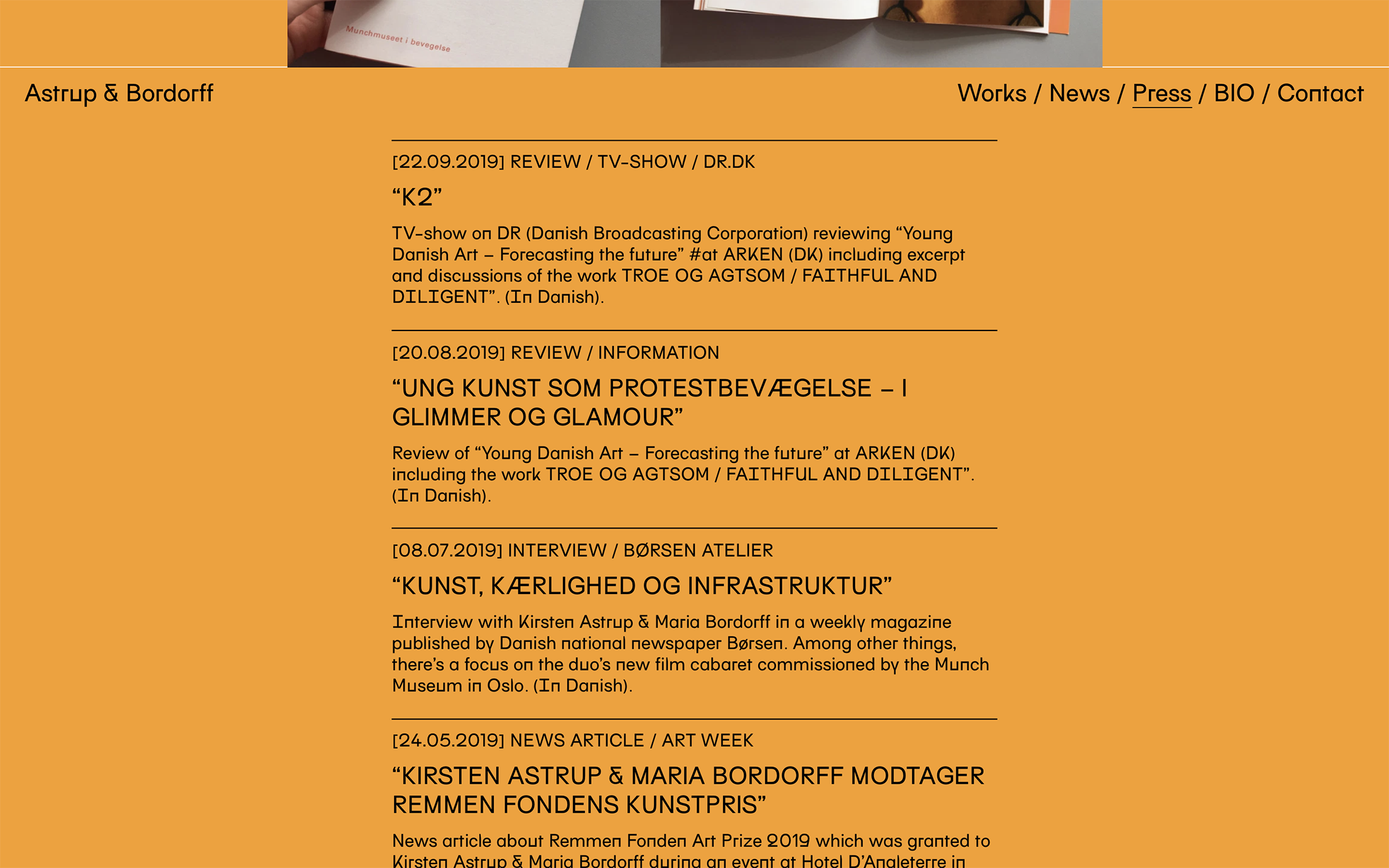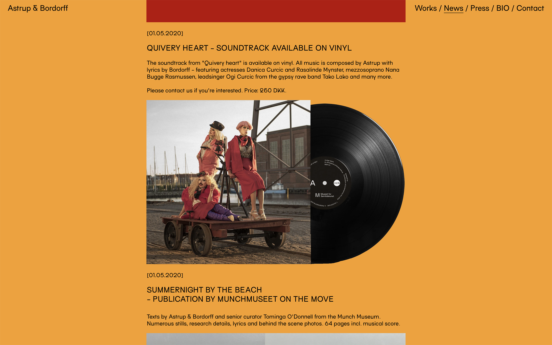 Working in an interdisciplinary field of film, music and performance, they have made film cabarets their primary form of expression. Currently, Astrup & Bordorff are working on the last chapter in a trilogy about the Danish welfare society and the loss of common values.