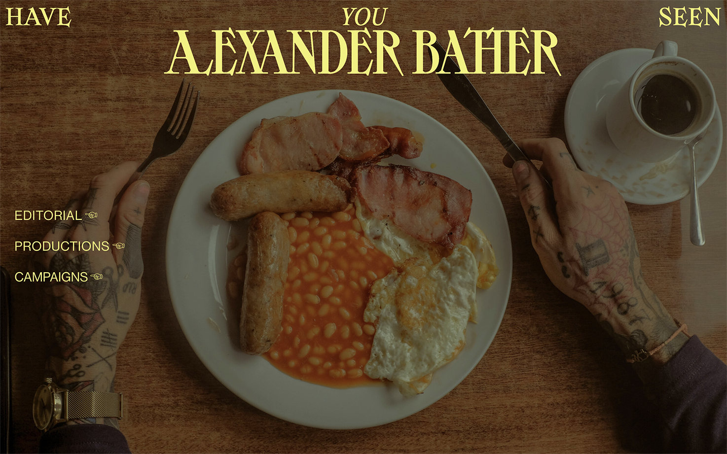 ToY (Out of the Dark) is used in a big size for the logotype of the photographer, with ligatures for the LA and TH pairs. Neue Haas Grotesk and all-caps Armag (Blaze Type) are combined for the menu.