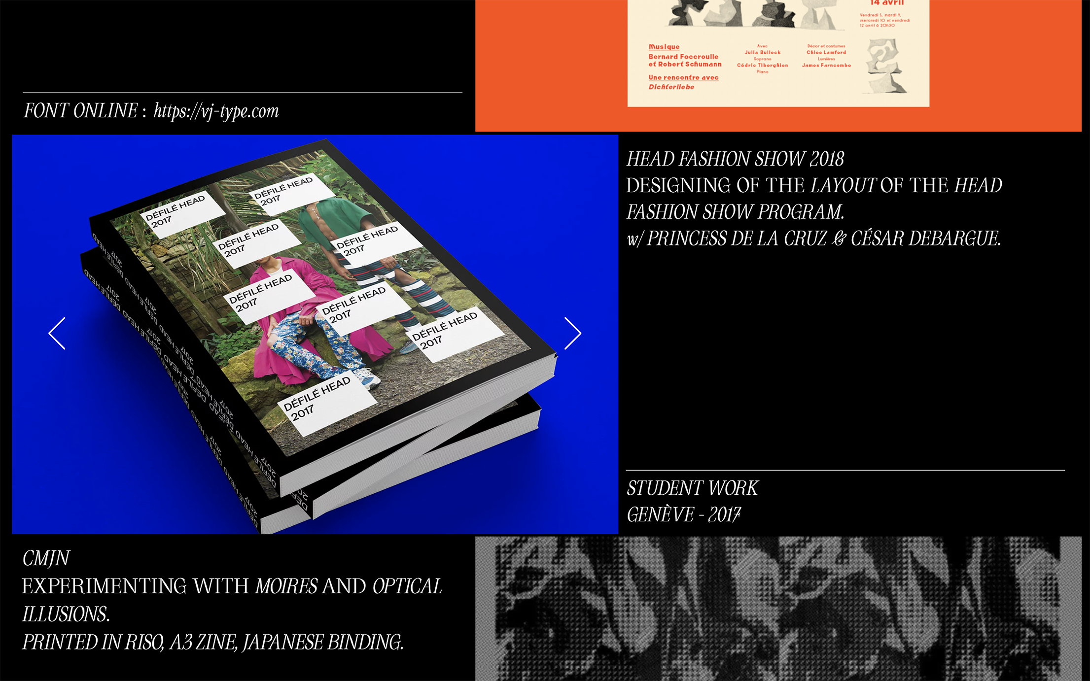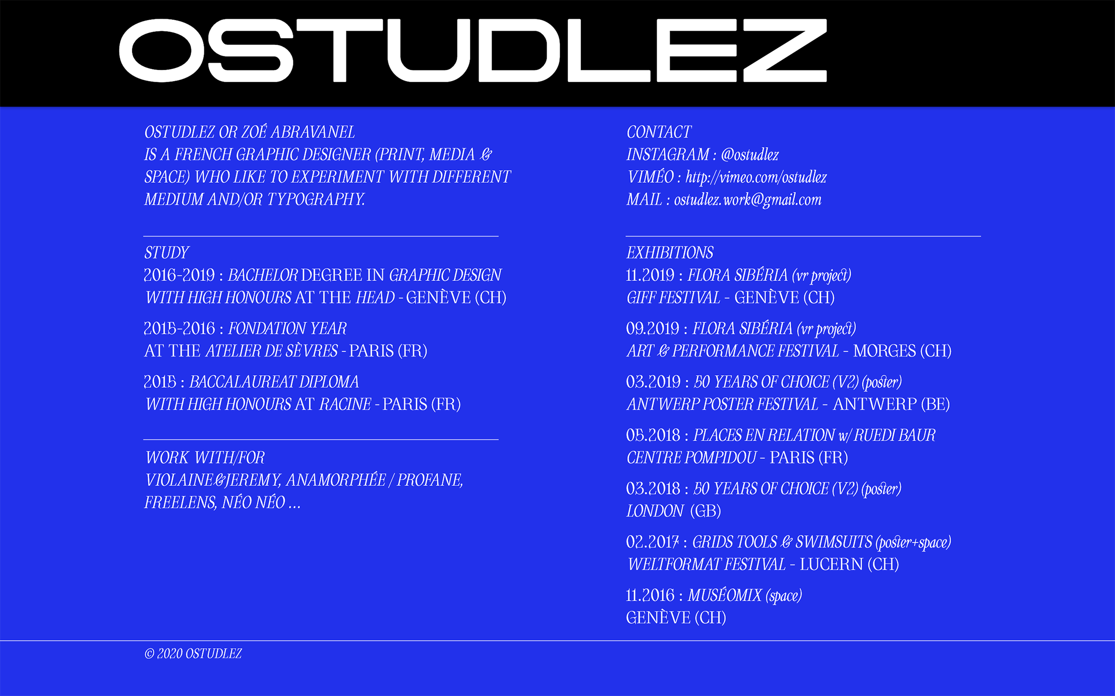 Ostudlez or Zoé Abravanel is a French graphic designer who likes to experiment with different media and/or typography. For her studio website, she uses Oroban (Blaze Type) as the typeface for text and captions. The wide monospaced sans at the top is Cindie Mono D by Lewis McGuffie Type.