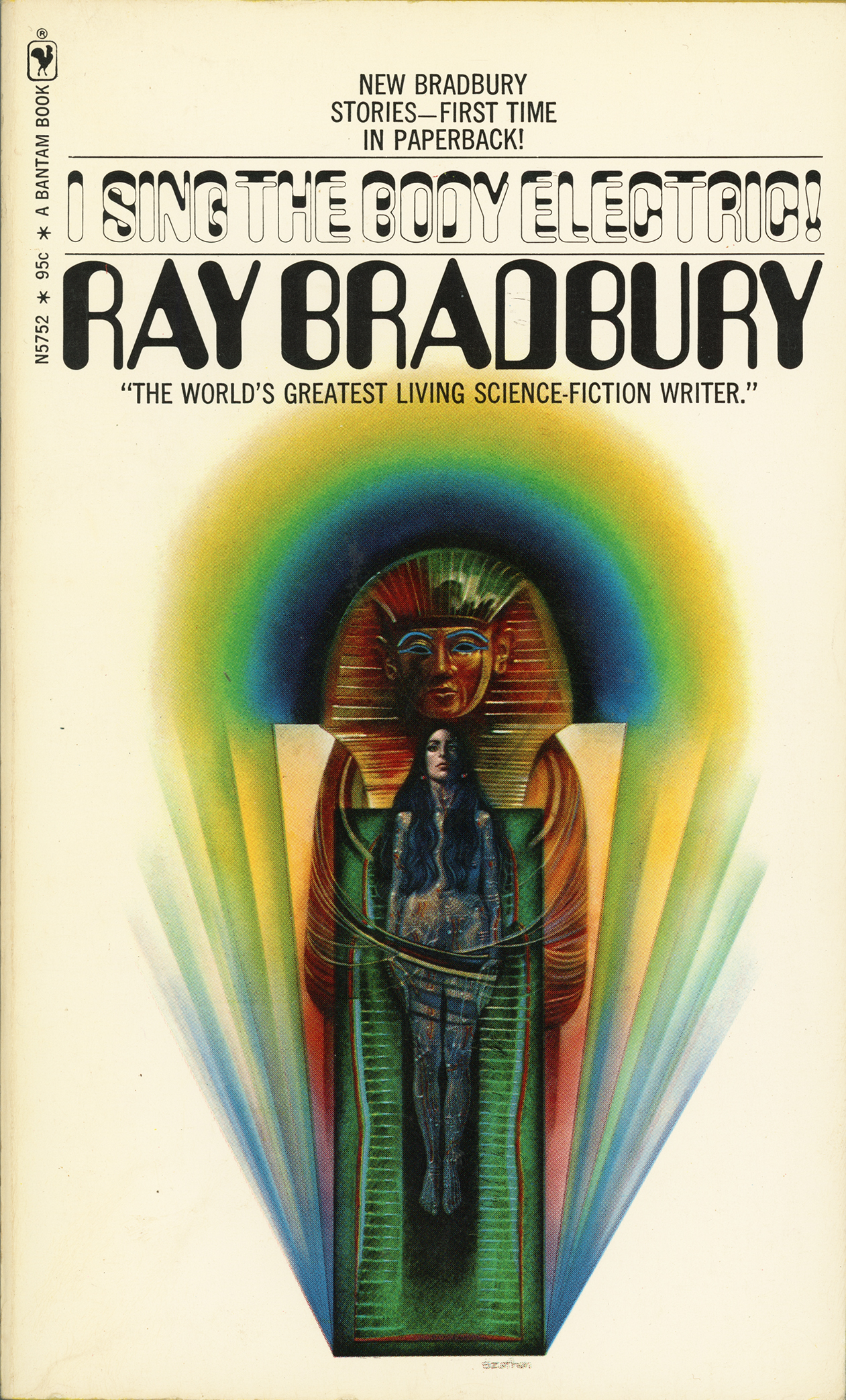 I Sing the Body Electric! is a 1969 collection of short stories by Ray Bradbury. First published in 1969 by Knopf, this is the cover of Bantam’s paperback edition from 1971. The illustration is by Gene Szafran, who also provided the album art for The Moray Eels Eat The Holy Modal Rounders.