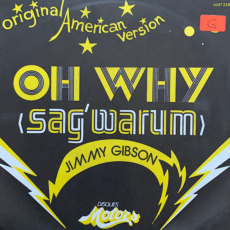 Second and apparently last single by Irish musician Jimmy Gibson, with an interpretation of Phil Spector’s “Oh Why”, released by Les Disques Motors from France. The bilingual title is rendered in bichromatic Black Line and Stilus. Both multiline faces were available from Mecanorma at the time – just like ITC Avant Garde Gothic, which is used with alternate M’s for the artist’s name.