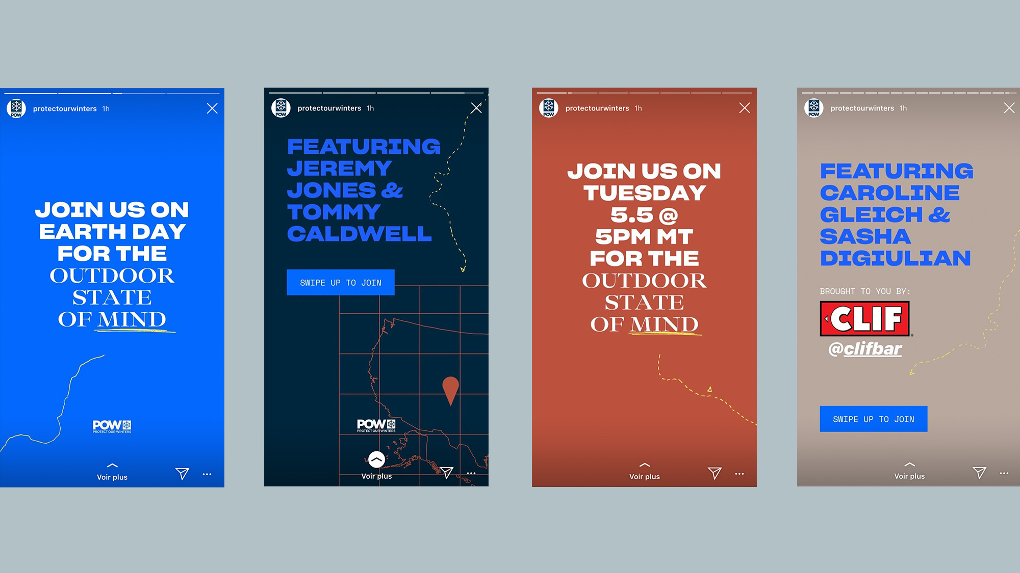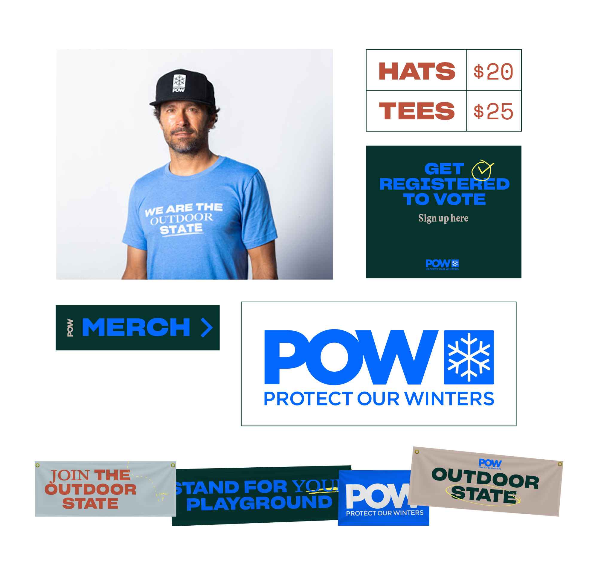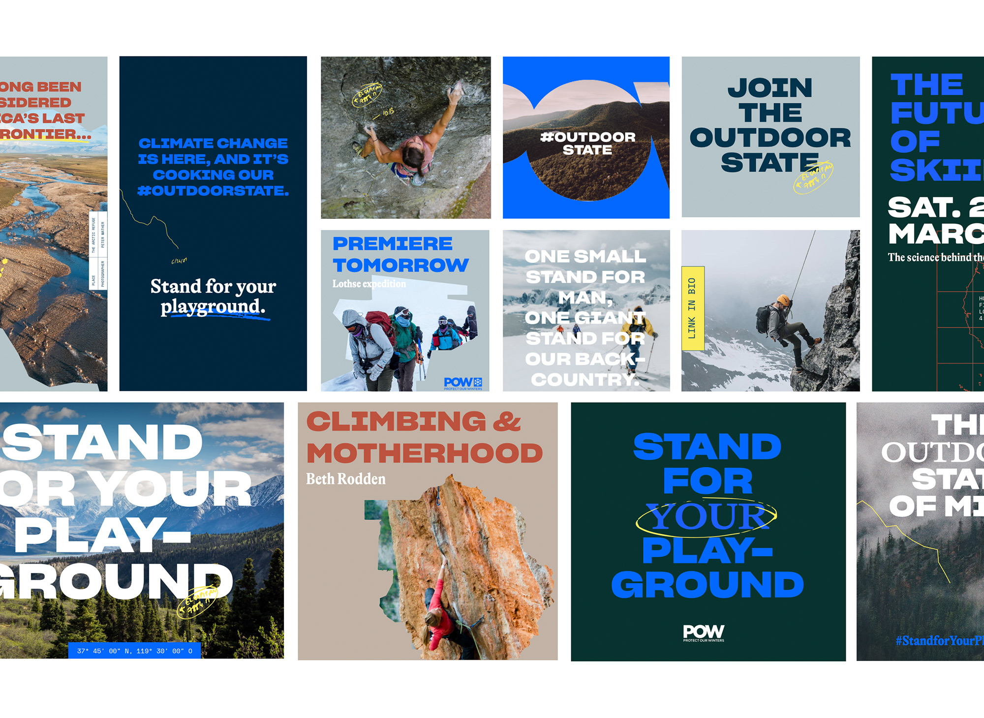 Protect Our Winters (POW) is a community of athletes, scientists, creatives and business leaders advancing non-partisan policies that protect our world today and for future generations. Climate change has put outdoor playgrounds at risk. At Sid Lee Montreal, we created The Outdoor State, a campaign to stand for these playgrounds together, and protect them for our future. In parallel to the campaign, we rebranded POW. We choose bright colors to reflect the energy of POW with new colors representing the earth: dirt, rock, sand.