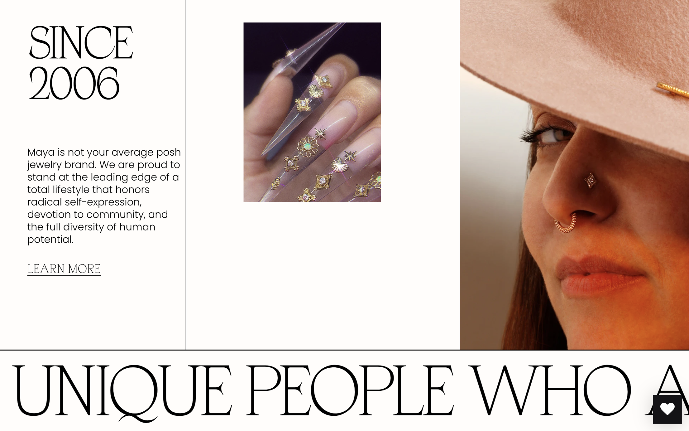 Maya is not your average posh jewelry brand. We are proud to stand at the leading edge of a total lifestyle that honors radical self-expression, devotion to community, and the full diversity of human potential. Our entire team, manufacturing practices, design choices, and marketing reflect these priorities, and we strive to infuse our vision into every piece of jewelry we make.