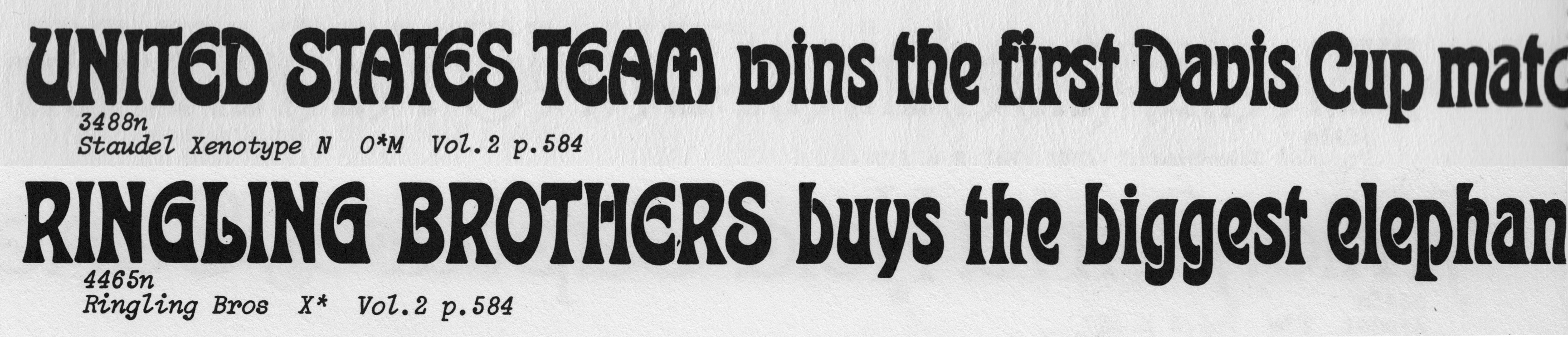 Their 1971 catalog features the bolder interpretation twice, as Staudel Xenotype N (with catalog number 3488) and as Ringling Brothers (4465). If there are any differences between the two, they are minute. The only obvious variation that I can detect in the limited one-line showings is that the gaps are smaller in 3488 and tend to fill in. My guess is that Ringling Brothers is a revision with slightly larger openings to counter this effect. It’s named after an American circus family active in the late 19th and early 20th century. No designer is credited for either version. The faces were likely drawn under the supervision of PLINC’s art director Ed Benguiat, or maybe even by himself.