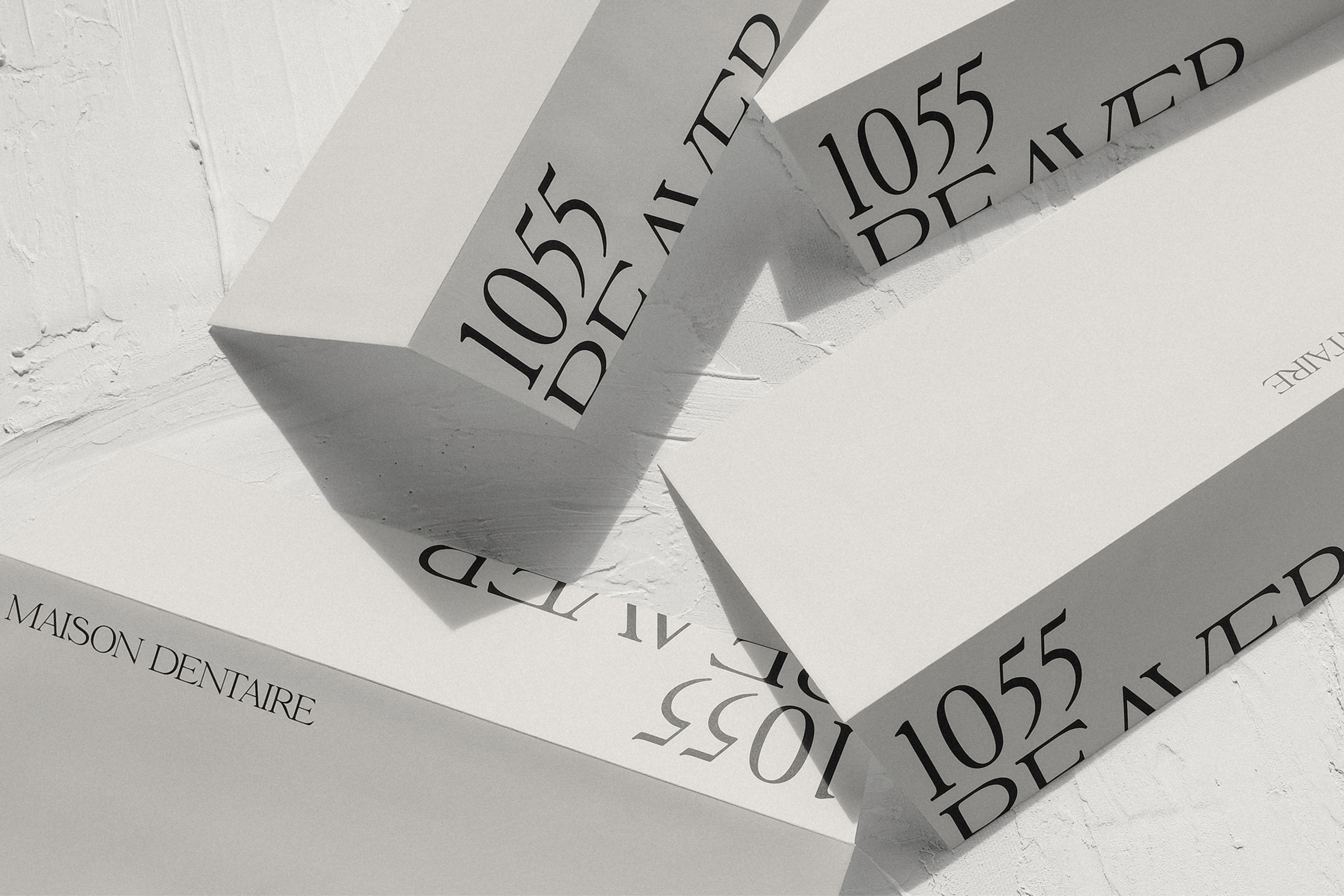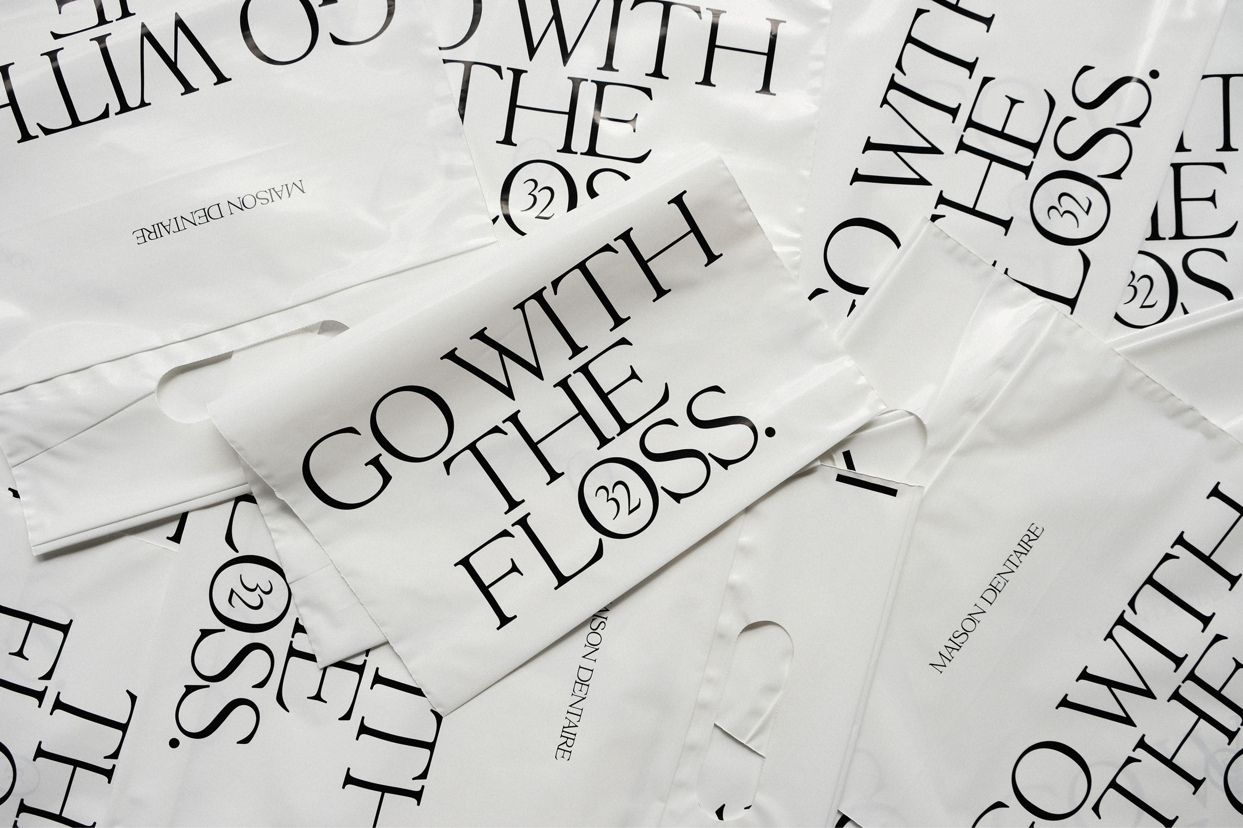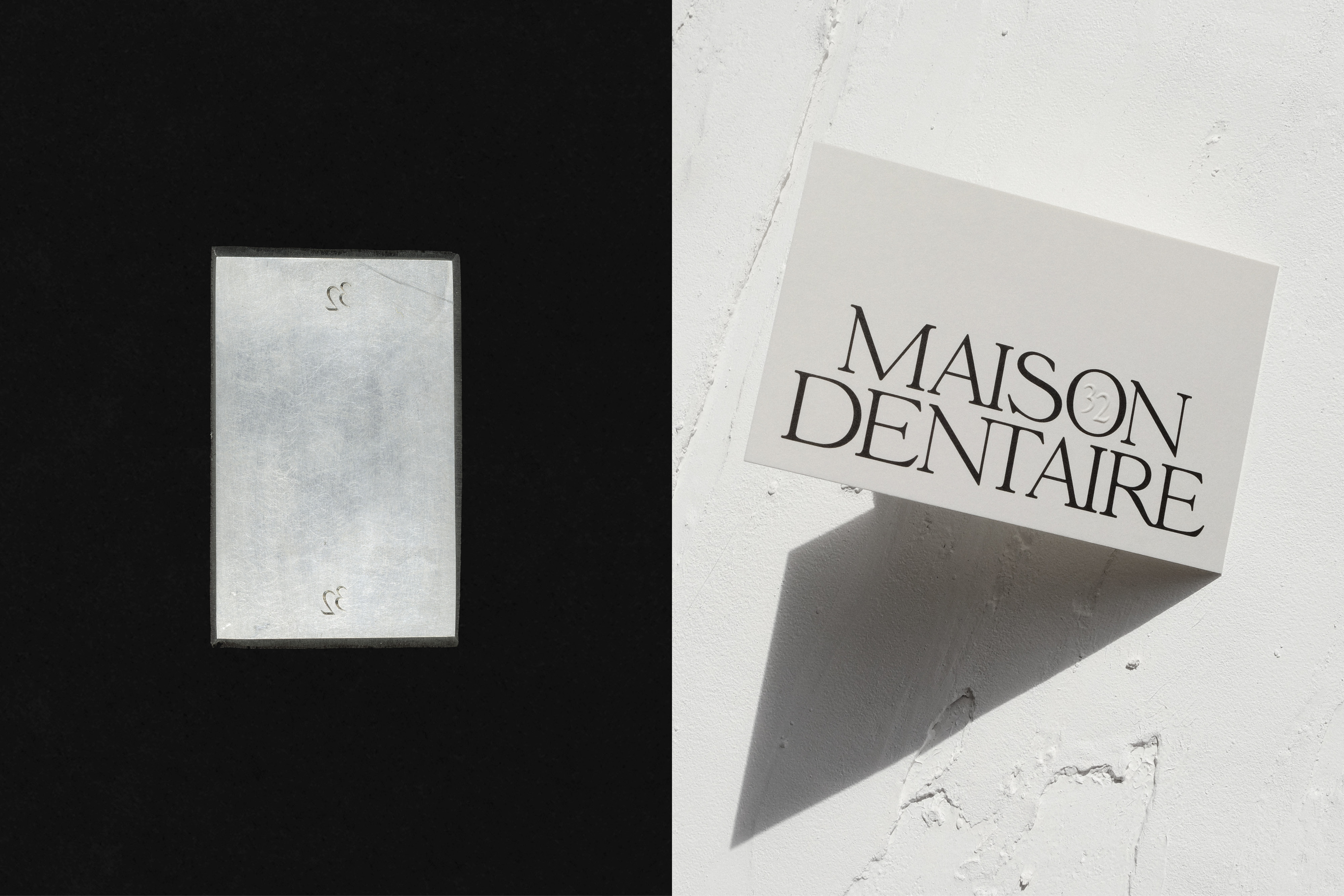 Looking at the dental world from a very elementary stand point: teeth, roots, bones, strings, pointy tools etc., we come up with qualitatives that illustrate these aspects and translate them typographically – fragility, growth, morphology, transformation, intricacy, detail and craft. We settled on Gascogne by Frederic Goudy, for its effortless attitude – we immediately found it could feel young and gritty, while conveying a sense of confidence and establishment. The pointy yet rounded letter ends felt dental, the wide nature of the letters also felt dental, as in when you’re asked to “open wide” etc. It’s always a good challenge to design a logotype that can “feel” like a certain field, without necessarily having to use recognizable graphic references. The S was completely customized to bring a visual “vibration” to ‘Maison’, boosting the logotypes’ personality, and smooth ligatures were carefully integrated throughout the logotype as a nod to bones growing, fusing together, and morphology – just like the NT ligature, that was also used as a stand-alone typographic element in the ‘No32’ symbol. Yeah, we didn’t just type a classy serif…