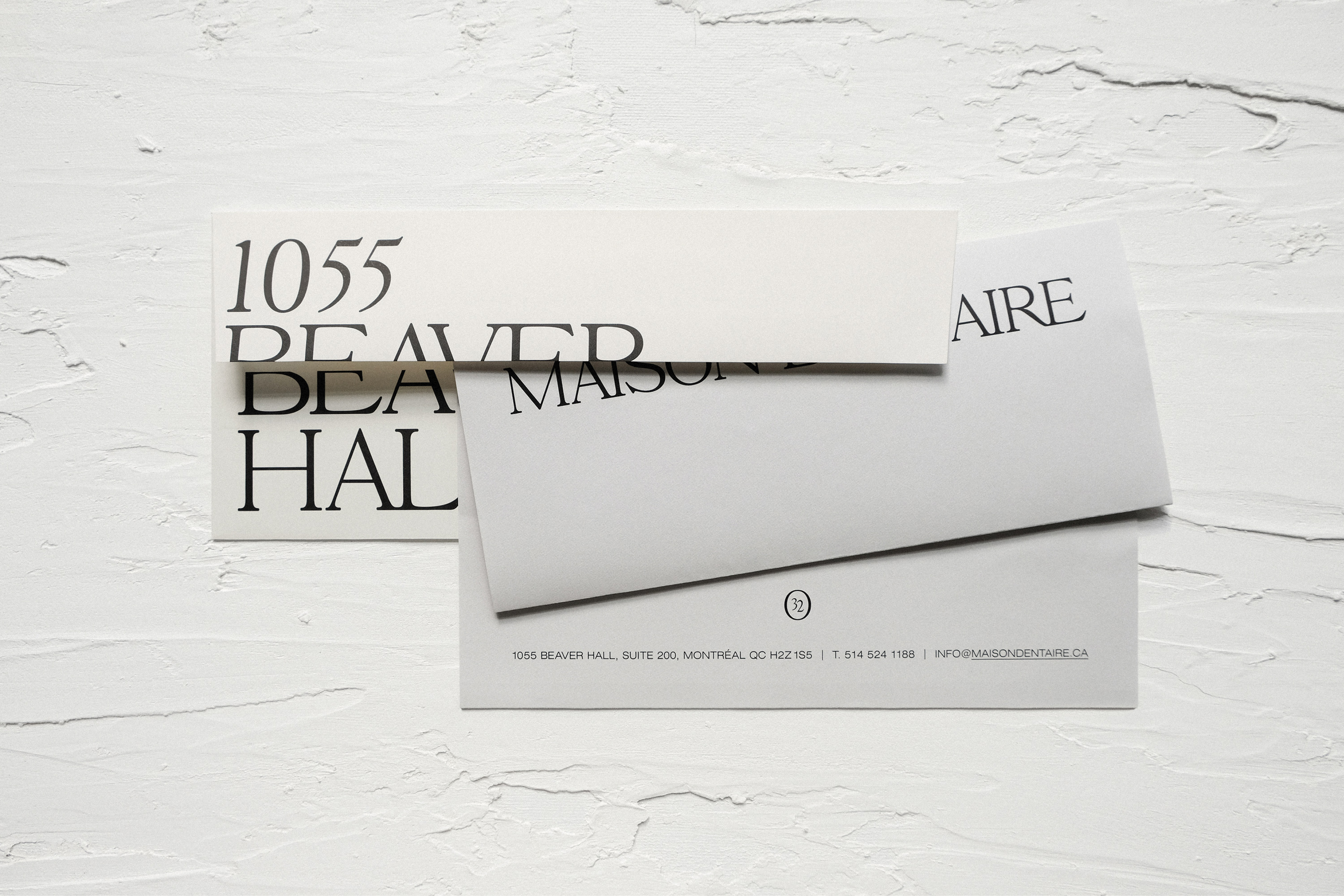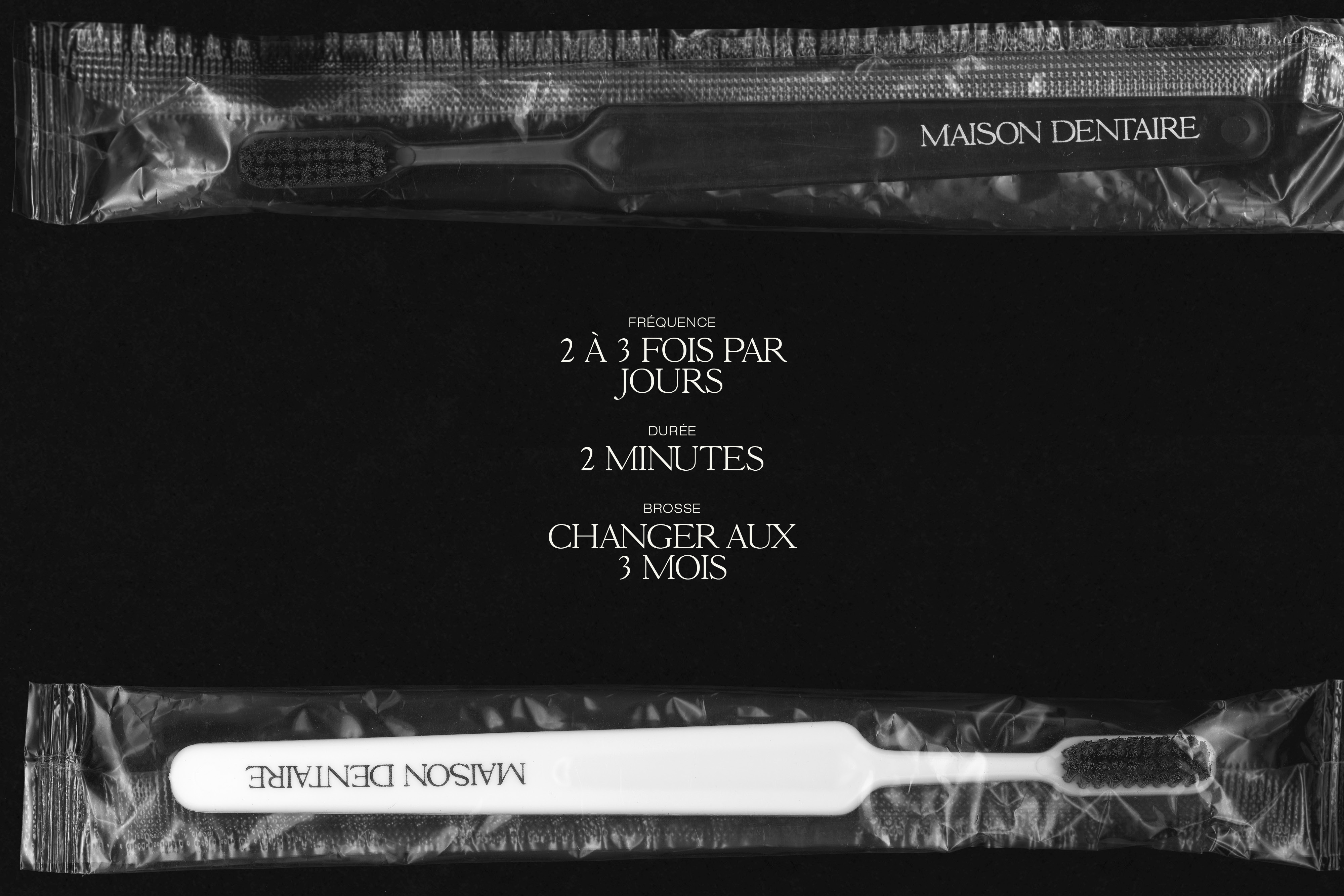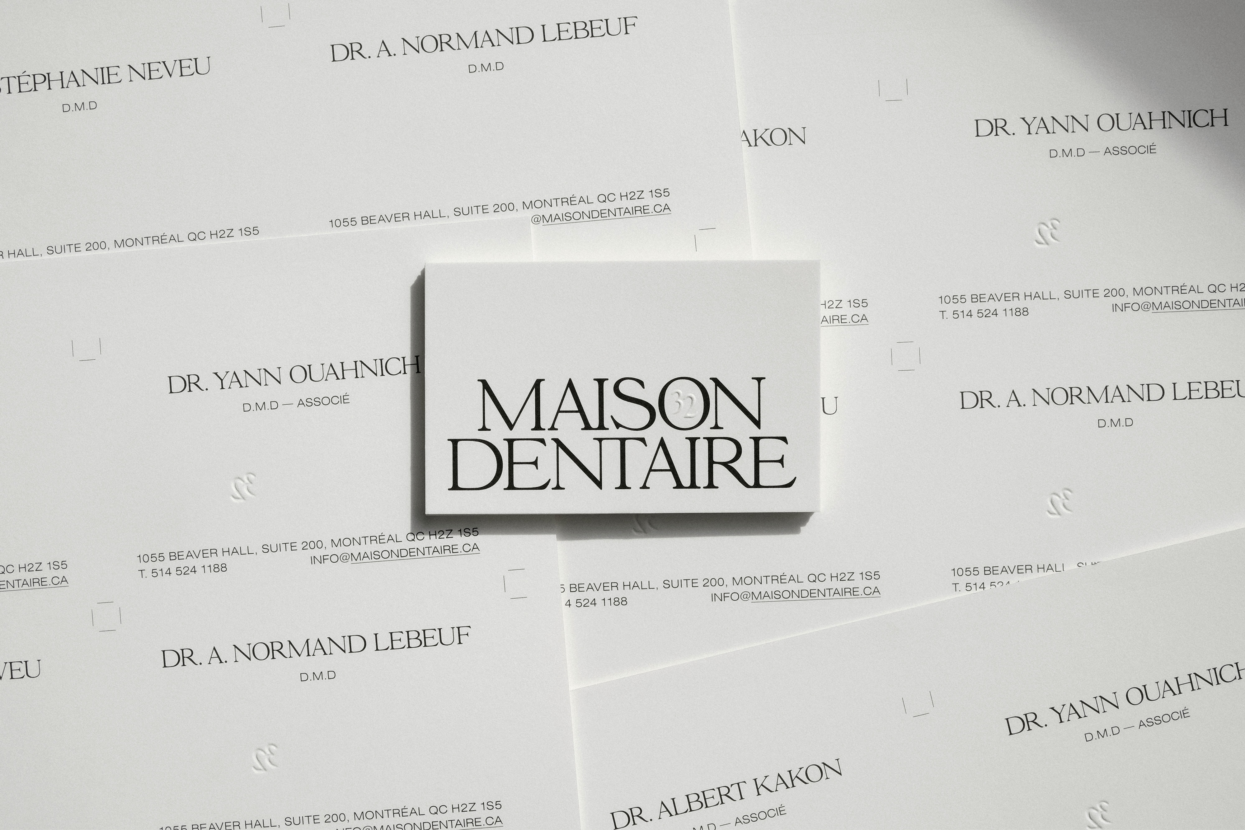 Looking at the dental world from a very elementary stand point: teeth, roots, bones, strings, pointy tools etc., we come up with qualitatives that illustrate these aspects and translate them typographically – fragility, growth, morphology, transformation, intricacy, detail and craft. We settled on Gascogne by Frederic Goudy, for its effortless attitude – we immediately found it could feel young and gritty, while conveying a sense of confidence and establishment. The pointy yet rounded letter ends felt dental, the wide nature of the letters also felt dental, as in when you’re asked to “open wide” etc. It’s always a good challenge to design a logotype that can “feel” like a certain field, without necessarily having to use recognizable graphic references. The S was completely customized to bring a visual “vibration” to ‘Maison’, boosting the logotypes’ personality, and smooth ligatures were carefully integrated throughout the logotype as a nod to bones growing, fusing together, and morphology – just like the NT ligature, that was also used as a stand-alone typographic element in the ‘No32’ symbol. Yeah, we didn’t just type a classy serif…