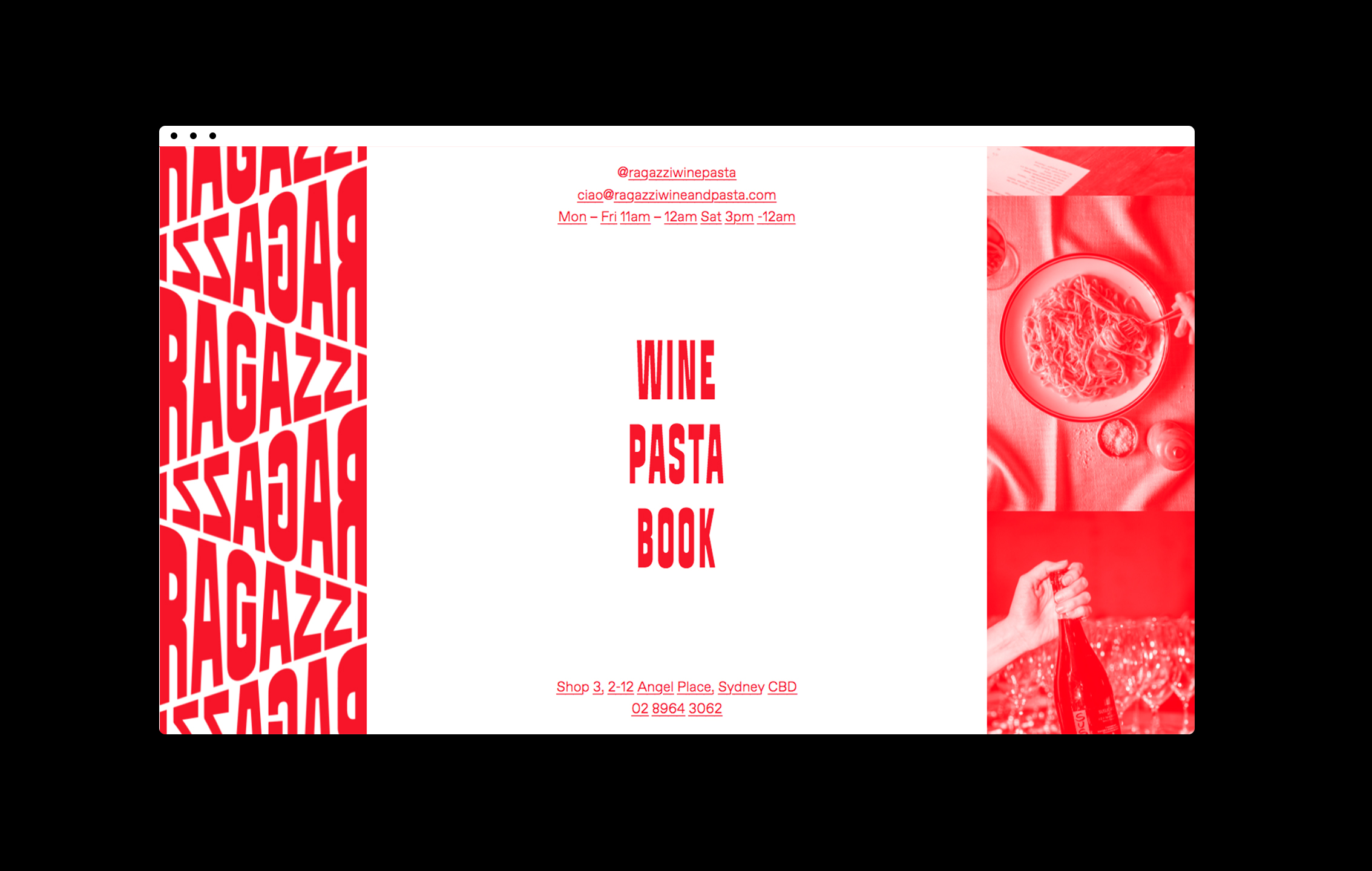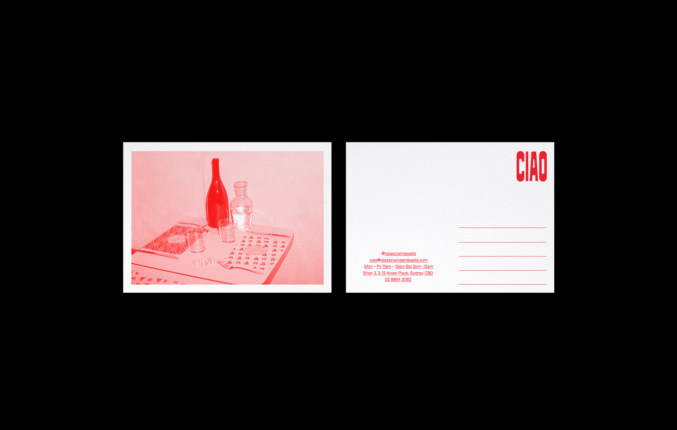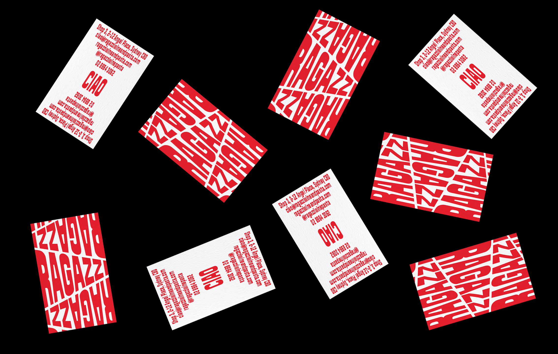 Ragazzi is a new Italian restaurant in Sydney, Australia. Local design studio Something Creative Co was commissioned to create the brand: “Inspired by Marinetti and his sound poems, the commonly used Italian phrase ‘Ciao, Ragazzi’ comes to life as if it were shouted at a busy table. […] We wanted everything to be playful and entertaining, using constant movement across the identity.”