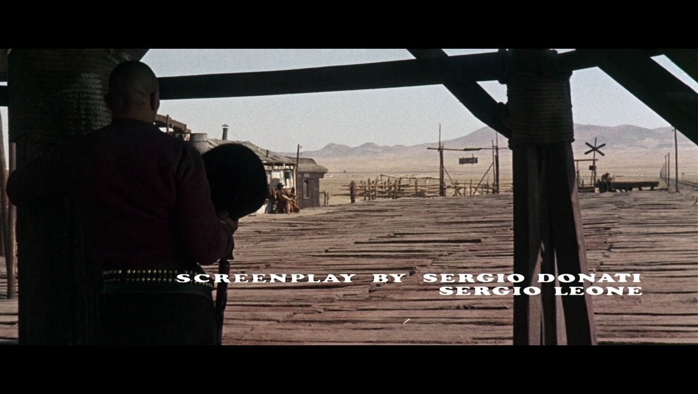 In [Once upon a Time in the] West, Leone uses sound and editing to slowly ratchet up the tension as the trio wait and wait and wait for their quarry. The film’s score is widely considered to be some of composer Ennio Morricone’s finest work, but the only sound here is the squeak of the wind turbine, the jangle of spurs, the cracking of knuckles, and the incessant buzz of one seriously pesky fly. This naturalistic soundscape allows the credits, set in Cooper Black, to seamlessly blend in with the scene. On-screen moves and audio cues pull — or lasso, if you will — most of the typography into frame. Credits appear and disappear in time with the clack of the telegraph machine or the slamming of a door. The final credit of the sequence — Directed by Sergio Leone — arrives with a roar as the long-awaited train pulls into the station, the type coming down across the tracks to block the locomotive’s path or, more appropriately, like the arm of a clapper board. The showdown is about to begin. Action.