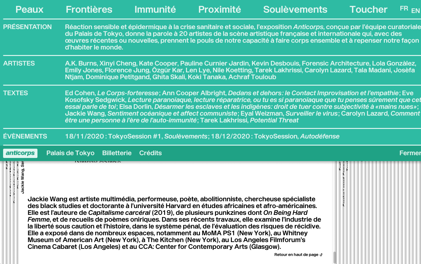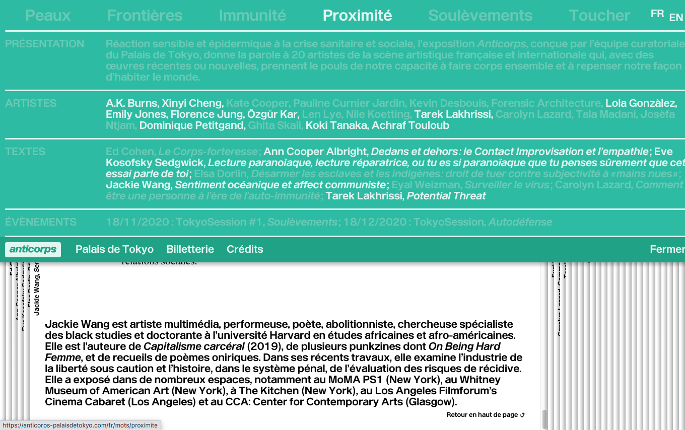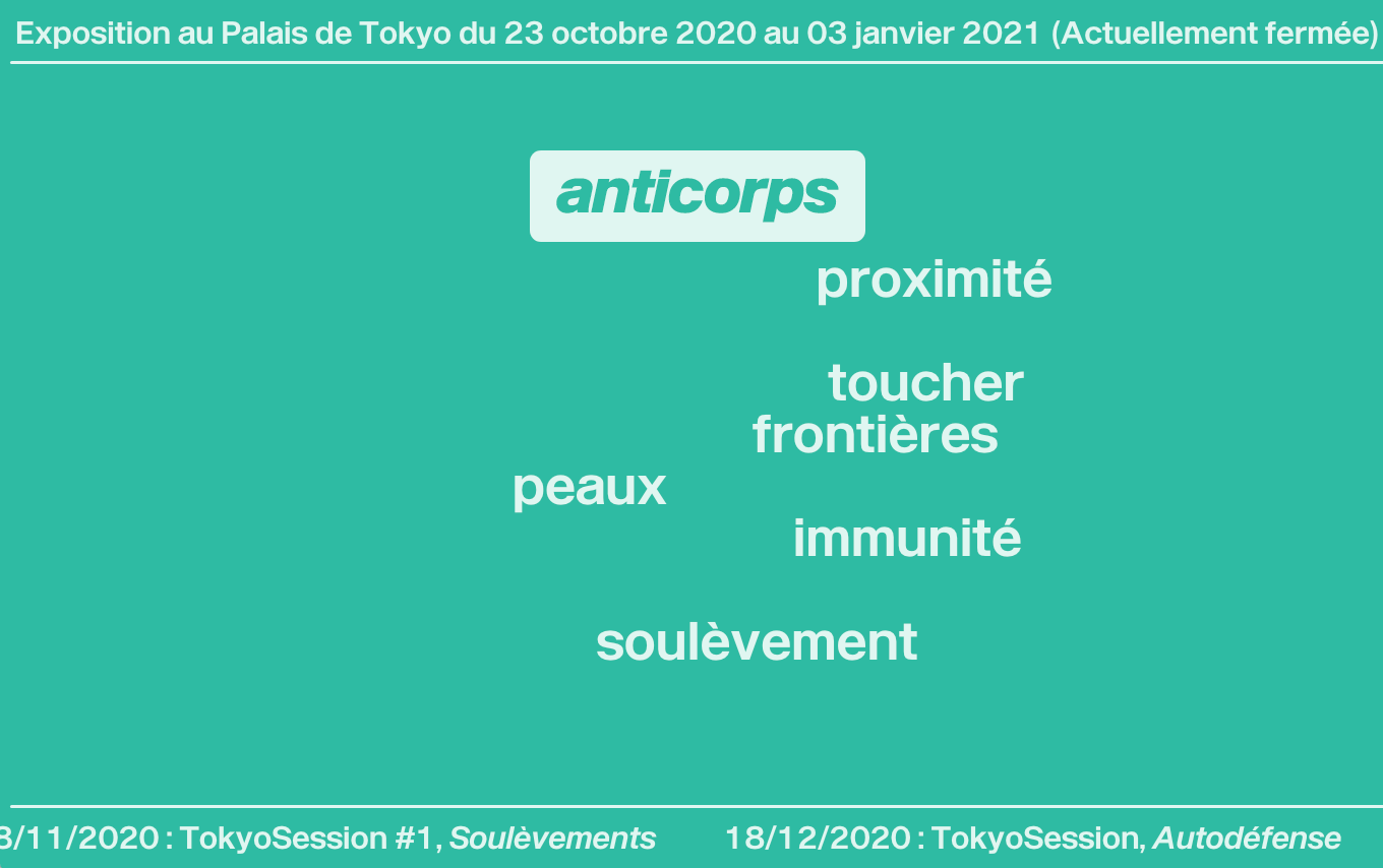 Anticorps (“Antibodies”) is an exhibition at the Palais de Tokyo, Paris, platforming “the voices of 20 artists from the French and international artistic scene. With recent and new works, they take the pulse of our ability to bond together and help us rethink how we inhabit the world.” Conceived with the experience of lockdown and the adoption of physical distancing, the exhibition is extended and enhanced by an extensive bilingual website, making some of the content available online.