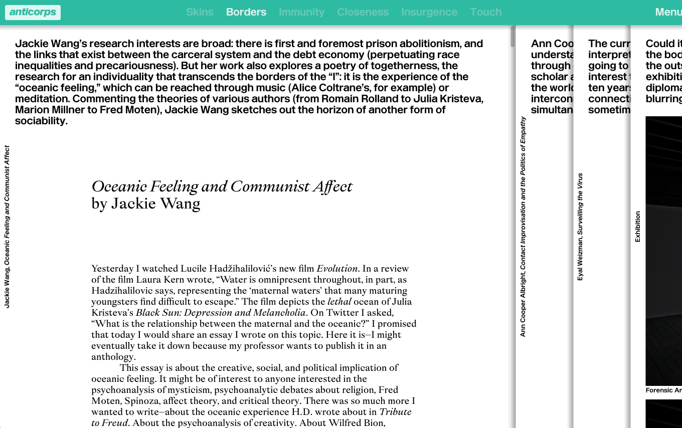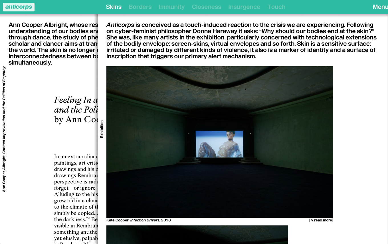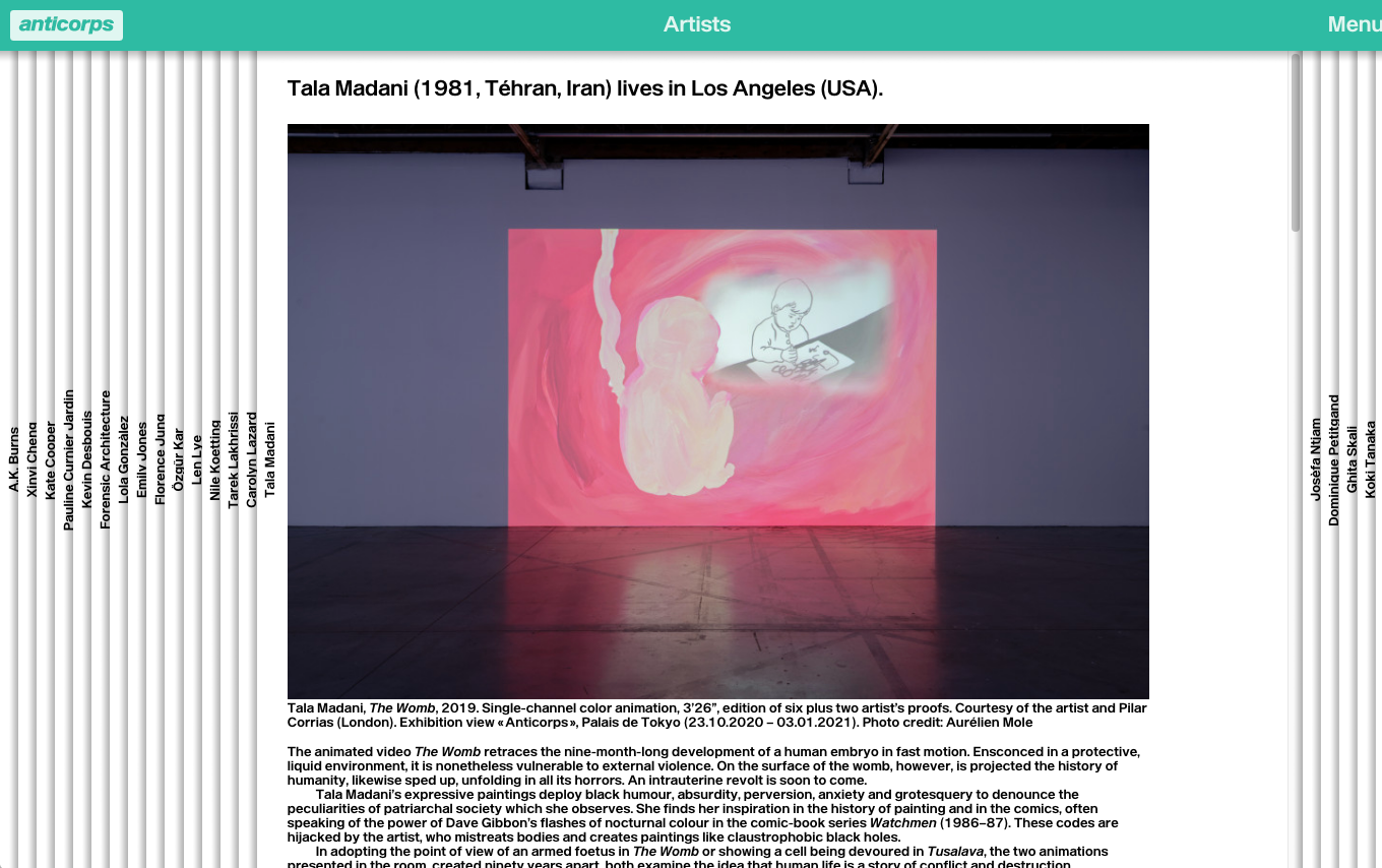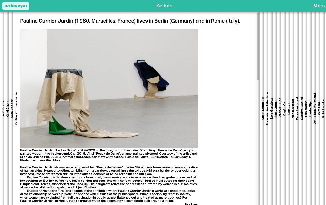 Anticorps (“Antibodies”) is an exhibition at the Palais de Tokyo, Paris, platforming “the voices of 20 artists from the French and international artistic scene. With recent and new works, they take the pulse of our ability to bond together and help us rethink how we inhabit the world.” Conceived with the experience of lockdown and the adoption of physical distancing, the exhibition is extended and enhanced by an extensive bilingual website, making some of the content available online.