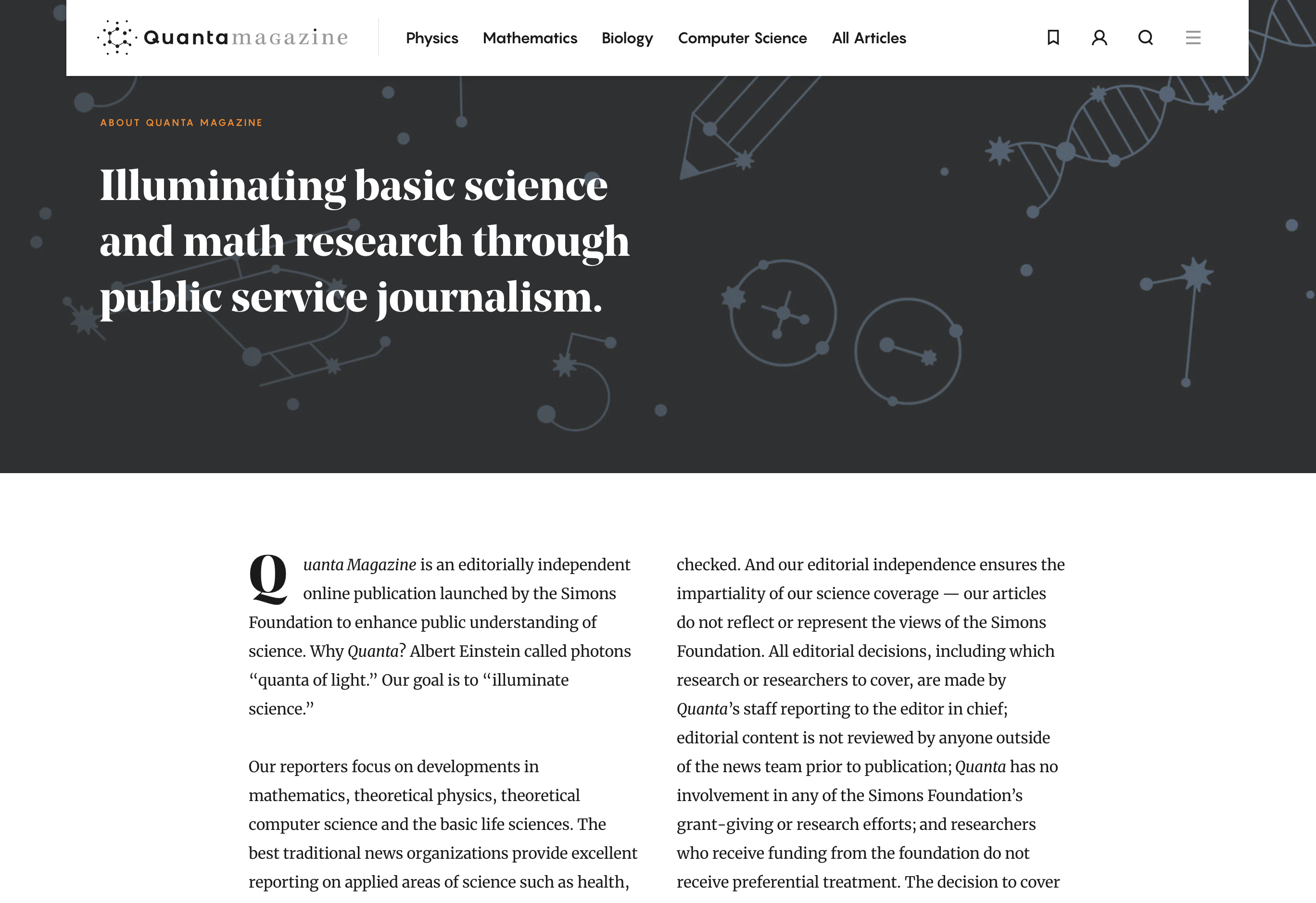 Quanta Magazine is an editorially independent online publication launched by the Simons Foundation to enhance public understanding of science. Why Quanta? Albert Einstein called photons “quanta of light.” Our goal is to “illuminate science”.