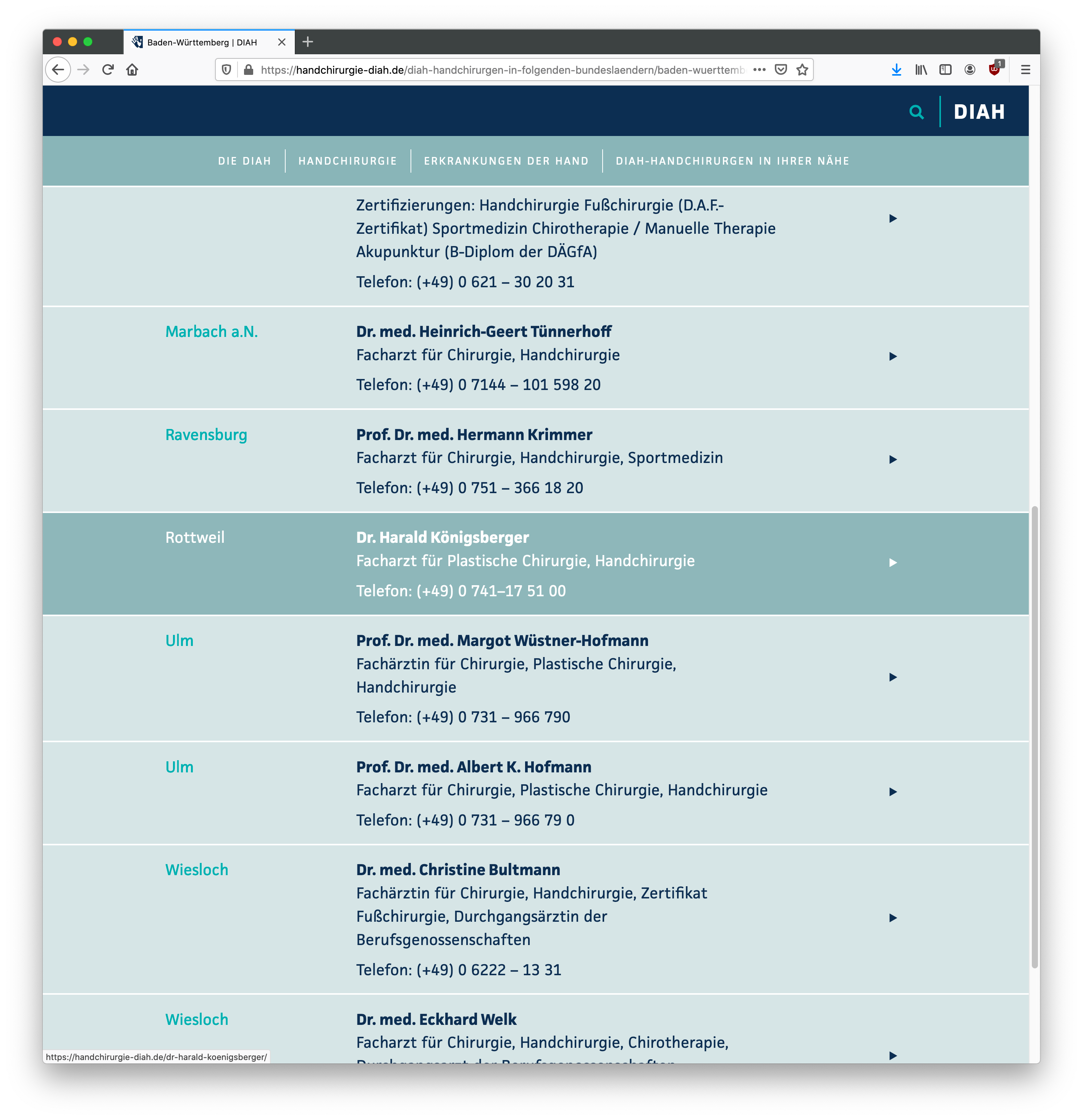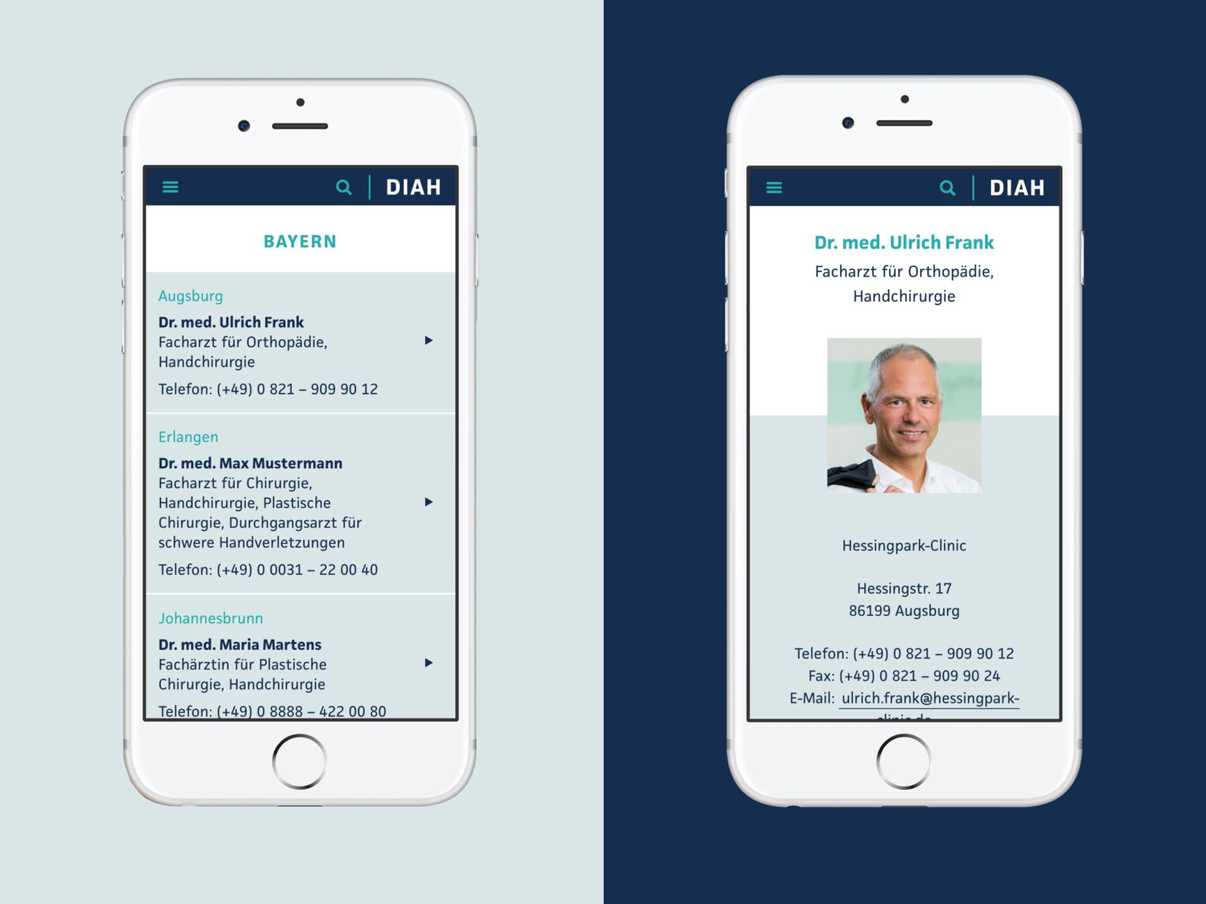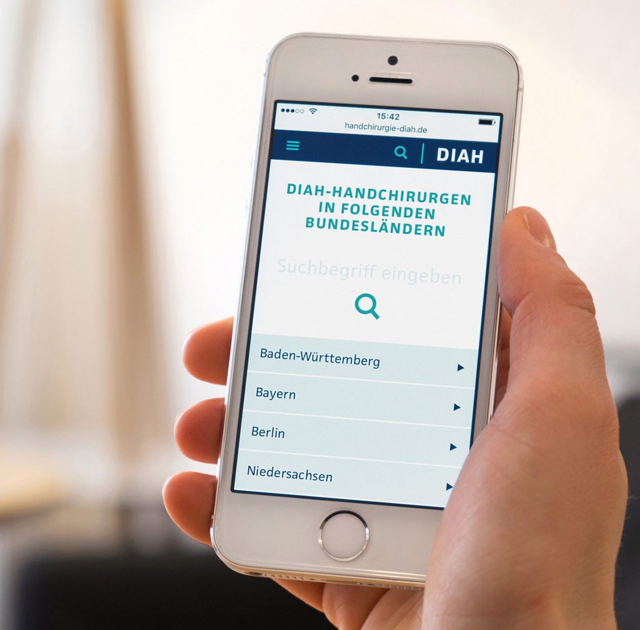 DIAH is the association of resident hand surgeons in Germany. Berliner Süden, a design studio specialized in digital communication, has develped DIAH’s mobile doctor directory which helps patients find a specialist in their local area.